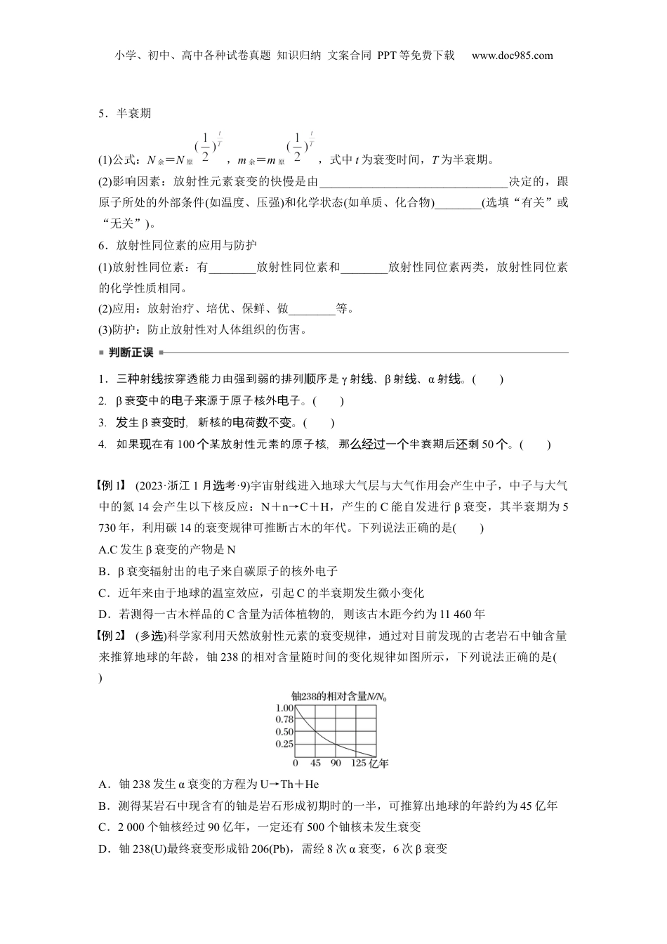 小学、初中、高中各种试卷真题知识归纳文案合同PPT等免费下载www.doc985.com第3课时原子核目标要求1.了解天然放射现象及三种射线的性质。2.了解原子核的衰变,掌握半衰期的概念,并会进行有关计算。3.了解四种核反应类型,能根据质量数、电荷数守恒写出核反应方程。4.认识原子核的结合能与比结合能,能进行有关核能的计算。考点一原子核的衰变半衰期1.原子核的组成:原子核是由________和中子组成的,原子核的电荷数等于核内的________。2.天然放射现象放射性元素________地发出射线的现象,首先由________________发现。天然放射现象的发现,说明________________具有复杂的结构。原子序数大于83的元素都能自发地发出射线,原子序数小于或等于83的,有的也能发出射线。3.三种射线的比较名称构成符号电荷量质量电离能力贯穿本领α射线__核He+2e4u最____最____β射线____e-eu较强较强γ射线光子γ00最____最____4.原子核的衰变(1)衰变:原子核自发地放出α粒子或β粒子,变成另一种原子核的变化称为原子核的衰变。(2)α衰变、β衰变衰变类型α衰变β衰变衰变方程X→Y+HeX→Y+e衰变实质2个质子和2个中子结合成一个整体射出中子转化为质子和电子2H+2n→Hen→H+e匀强磁场中轨迹形状衰变规律________守恒、质量数守恒(3)γ射线:γ射线经常是伴随着α衰变或β衰变同时产生的。小学、初中、高中各种试卷真题知识归纳文案合同PPT等免费下载www.doc985.com5.半衰期(1)公式:N余=N原,m余=m原,式中t为衰变时间,T为半衰期。(2)影响因素:放射性元素衰变的快慢是由________________________________决定的,跟原子所处的外部条件(如温度、压强)和化学状态(如单质、化合物)________(选填“有关”或“无关”)。6.放射性同位素的应用与防护(1)放射性同位素:有________放射性同位素和________放射性同位素两类,放射性同位素的化学性质相同。(2)应用:放射治疗、培优、保鲜、做________等。(3)防护:防止放射性对人体组织的伤害。1.三射按穿透能力由强到弱的排列序是种线顺γ射、线β射、线α射。线()2.β衰中的子源于原子核外子。变电来电()3.生发β衰,新核的荷不。变时电数变()4.如果在有现100某放射性元素的原子核,那一半衰期后剩个么经过个还50。个()例1(2023·浙江1月考选·9)宇宙射线进入地球大气层与大气作用会产生中子,中子与大气中的氮14会产生以下核反应:N+n→C+H,产生的C能自发进行β衰变,其半衰期为5730年,利用碳14的衰变规律可推断古木的年代。下列说法正确的是()A.C发生β衰变的产物是NB.β衰变辐射出的电子来自碳原子的核外电子C.近年来由于地球的温室效应,引起C的半衰期发生微小变化D.若测得一古木样品的C含量为活体植物的,则该古木距今约为11460年例2(多选)科学家利用天然放射性元素的衰变规律,通过对目前发现的古老岩石中铀含量来推算地球的年龄,铀238的相对含量随时间的变化规律如图所示,下列说法正确的是()A.铀238发生α衰变的方程为U→Th+HeB.测得某岩石中现含有的铀是岩石形成初期时的一半,可推算出地球的年龄约为45亿年C.2000个铀核经过90亿年,一定还有500个铀核未发生衰变D.铀238(U)最终衰变形成铅206(Pb),需经8次α衰变,6次β衰变小学、初中、高中各种试卷真题知识归纳文案合同PPT等免费下载www.doc985.com例3(2022·全甲卷国·17)两种放射性元素的半衰期分别为t0和2t0,在t=0时刻这两种元素的原子核总数为N,在t=2t0时刻,尚未衰变的原子核总数为,则在t=4t0时刻,尚未衰变的原子核总数为()A.B.C.D.考点二核反应核反应类型1.核反应的四种类型类型可控性核反应方程典例衰变α衰变自发U→Th+________β衰变自发Th→Pa+e人工转变人工控制(基本粒子轰击原子核)N+He→________+H(卢瑟福发现质子)He+Be→C+n(查德威克发现中子)Ar+He→_____+n约里奥-居里夫妇发现放射性同位素,同时发现正电子P→Si+____重核裂变容易控制(慢中子、链式反应)U+n→Ba+Kr+________U+n→Xe+Sr+________轻核聚变现阶段很难控制(需要极高温度——一般由核裂变提供)H+H→________+n+17.6MeV2.核反应方程式的书写(1)熟记常见基本...