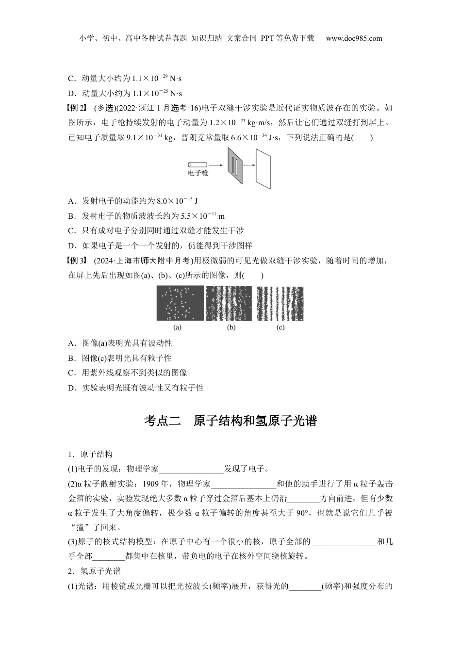 小学、初中、高中各种试卷真题知识归纳文案合同PPT等免费下载www.doc985.com第2课时波粒二象性物质波原子结构与玻尔理论目标要求1.理解波粒二象性的特征。2.了解实物粒子的波动性,知道物质波的概念。3.掌握原子的核式结构及玻尔的原子理论,理解氢原子能级图及原子受激跃迁条件。考点一光的波粒二象性与物质波1.光的波粒二象性(1)光的干涉、衍射、偏振现象证明光具有________________。(2)光电效应和康普顿效应说明光具有____________________。(3)光既具有波动性,又具有粒子性,称为光的________________________。思考用很弱的光做干涉,把入射光弱到可以光源和感光片之不可能同双缝实验减认为胶间有光子存在,如所示是不同量的光子照射到感光片上得到的照片。光的本时两个图数胶试从性解光的干涉象生的原因。释现产________________________________________________________________________________________________________________________________________________2.物质波:________________认为,任何一个运动着的物体,小到电子、质子,大到行星、太阳都有一种波和它对应,波长λ=________________,其中p是运动物体的动量,h是普朗克常量,数值为6.626×10-34J·s。人们把这种波称为________________________,也叫物质波。思考一名正以运动员10m/s的速度奔,已知他的量跑质为60kg,普朗克常量h=6.6×10-34J·s,估算他的德布意波。什我察不到的波性?试罗长为么们观运动员动________________________________________________________________________________________________________________________________________________例1(2024·山市考东青岛开学)透射电子显微镜(TEM)使用高能电子作为光源,简称透射电镜。透射电镜工作时电子经过高压加速和强磁场聚焦后得到观察样品的像。已知显微镜的分辨率与使用光源(光子或电子)的波长成正比,普通光学显微镜分辨率为0.2μm,透射电镜能清晰地观察到直径2nm的金原子。若光学显微镜使用的可见光平均波长为600nm,动量大小为1.1×10-27N·s。关于高能电子,下列说法正确的是()A.波长约为2nmB.波长约为6×10-6nm小学、初中、高中各种试卷真题知识归纳文案合同PPT等免费下载www.doc985.comC.动量大小约为1.1×10-29N·sD.动量大小约为1.1×10-25N·s例2(多选)(2022·浙江1月考选·16)电子双缝干涉实验是近代证实物质波存在的实验。如图所示,电子枪持续发射的电子动量为1.2×10-23kg·m/s,然后让它们通过双缝打到屏上。已知电子质量取9.1×10-31kg,普朗克常量取6.6×10-34J·s,下列说法正确的是()A.发射电子的动能约为8.0×10-15JB.发射电子的物质波波长约为5.5×10-11mC.只有成对电子分别同时通过双缝才能发生干涉D.如果电子是一个一个发射的,仍能得到干涉图样例3(2024·上海市大附中月考师)用极微弱的可见光做双缝干涉实验,随着时间的增加,在屏上先后出现如图(a)、(b)、(c)所示的图像,则()A.图像(a)表明光具有波动性B.图像(c)表明光具有粒子性C.用紫外线观察不到类似的图像D.实验表明光既有波动性又有粒子性考点二原子结构和氢原子光谱1.原子结构(1)电子的发现:物理学家________________发现了电子。(2)α粒子散射实验:1909年,物理学家________________和他的助手进行了用α粒子轰击金箔的实验,实验发现绝大多数α粒子穿过金箔后基本上仍沿________方向前进,但有少数α粒子发生了大角度偏转,极少数α粒子偏转的角度甚至大于90°,也就是说它们几乎被“撞”了回来。(3)原子的核式结构模型:在原子中心有一个很小的核,原子全部的________________和几乎全部________都集中在核里,带负电的电子在核外空间绕核旋转。2.氢原子光谱(1)光谱:用棱镜或光栅可以把光按波长(频率)展开,获得光的________(频率)和强度分布的小学、初中、高中各种试卷真题知识归纳文案合同PPT等免费下载www.doc985.com记录,即光谱。(2)光谱分类(3)光谱分析:利用每种原子都有自己的________________________来鉴别物质和确定物质的组成成分,且灵敏度很高。在发现和鉴别化学元素上有着重大的意义。(4)...
