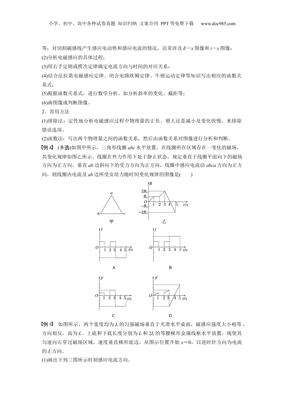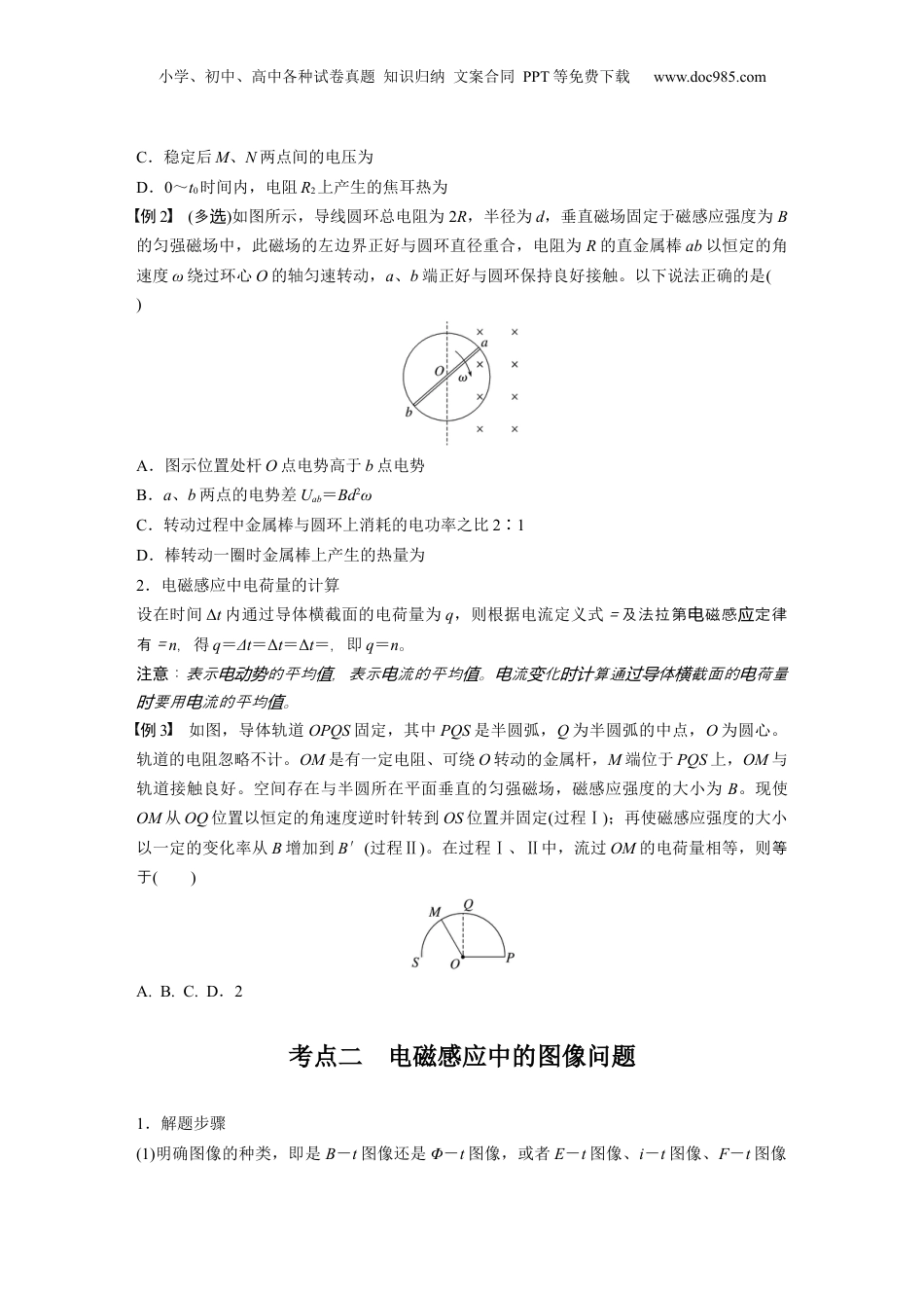 小学、初中、高中各种试卷真题知识归纳文案合同PPT等免费下载www.doc985.com第3课时专题强化:电磁感应中的电路和图像问题目标要求1.掌握电磁感应中电路问题的求解方法。2.会计算电磁感应问题中电压、电流、电荷量、热量等物理量。3.能够通过电磁感应图像,读取相关信息,应用物理规律求解问题。考点一电磁感应中的电路问题和电荷量的计算1.分析电磁感应中电路问题的基本思路思考“相于源当电”的体端的差就是源的?导两电势电电动势吗________________________________________________________________________________________________________________________________________________例1(多选)(2023·河南州市期末郑)在如图甲所示的电路中,电阻2R1=R2=2R,单匝、圆形金属线圈的半径为r1,电阻为R,半径为r2(r2<r1)的圆形区域内存在垂直于线圈平面向里的匀强磁场,磁感应强度B随时间t变化的关系图线如图乙所示,其余导线的电阻不计。闭合开关S,在t0时刻,电路中的电流已稳定。下列说法正确的是()A.流过电阻R1的电流方向自下向上B.稳定后电阻R1两端的电压为小学、初中、高中各种试卷真题知识归纳文案合同PPT等免费下载www.doc985.comC.稳定后M、N两点间的电压为D.0~t0时间内,电阻R2上产生的焦耳热为例2(多选)如图所示,导线圆环总电阻为2R,半径为d,垂直磁场固定于磁感应强度为B的匀强磁场中,此磁场的左边界正好与圆环直径重合,电阻为R的直金属棒ab以恒定的角速度ω绕过环心O的轴匀速转动,a、b端正好与圆环保持良好接触。以下说法正确的是()A.图示位置处杆O点电势高于b点电势B.a、b两点的电势差Uab=Bd2ωC.转动过程中金属棒与圆环上消耗的电功率之比2∶1D.棒转动一圈时金属棒上产生的热量为2.电磁感应中电荷量的计算设在时间Δt内通过导体横截面的电荷量为q,则根据电流定义式=及法拉第磁感定律电应有=n,得q=Δt=Δt=Δt=,即q=n。注意:表示的平均,表示流的平均。流化算通体截面的荷量电动势值电值电变时计过导横电要用流的平均。时电值例3如图,导体轨道OPQS固定,其中PQS是半圆弧,Q为半圆弧的中点,O为圆心。轨道的电阻忽略不计。OM是有一定电阻、可绕O转动的金属杆,M端位于PQS上,OM与轨道接触良好。空间存在与半圆所在平面垂直的匀强磁场,磁感应强度的大小为B。现使OM从OQ位置以恒定的角速度逆时针转到OS位置并固定(过程Ⅰ);再使磁感应强度的大小以一定的变化率从B增加到B′(过程Ⅱ)。在过程Ⅰ、Ⅱ中,流过OM的电荷量相等,则等于()A.B.C.D.2考点二电磁感应中的图像问题1.解题步骤(1)明确图像的种类,即是B-t图像还是Φ-t图像,或者E-t图像、i-t图像、F-t图像小学、初中、高中各种试卷真题知识归纳文案合同PPT等免费下载www.doc985.com等;对切割磁感线产生感应电动势和感应电流的情况,还常涉及E-x图像和i-x图像;(2)分析电磁感应的具体过程;(3)用右手定则或楞次定律确定电流方向与时间的对应关系;(4)结合法拉第电磁感应定律、闭合电路欧姆定律、牛顿运动定律等知识写出相应的函数关系式;(5)根据函数关系式,进行数学分析,如分析斜率的变化、截距等;(6)画图像或判断图像。2.常用方法(1)排除法:定性地分析电磁感应过程中物理量的正负、增大还是减小及变化快慢,来排除错误选项。(2)函数法:写出两个物理量之间的函数关系,然后由函数关系对图像进行分析和判断。例4(多选)如图甲所示,三角形线圈abc水平放置,在线圈所在区域存在一变化的磁场,其变化规律如图乙所示。线圈在外力作用下处于静止状态,规定垂直于线圈平面向下的磁场方向为正方向,垂直ab边斜向下的受力方向为正方向,线圈中感应电流沿abca方向为正方向,则线圈内电流及ab边所受安培力随时间变化规律的图像是()例5如图所示,两个宽度均为L的匀强磁场垂直于光滑水平桌面,磁感应强度大小相等,方向相反,高为L、上底和下底长度分别为L和2L的等腰梯形金属线框水平放置,现使其匀速向右穿过磁场区域,速度垂直梯形底边,从图示位置开始x=0,以逆时针方向为电流的正方向。(1)画出下列三图所示时刻感应电流方向。小学、初中、高中各种试卷真题知识归纳文案合同...