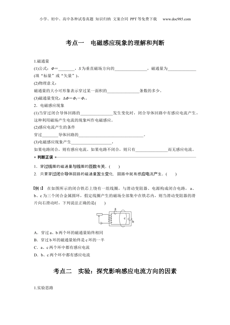 小学、初中、高中各种试卷真题知识归纳文案合同PPT等免费下载www.doc985.com考情分析试题情境生活实践类电磁炉、电子秤、电磁卡、电磁焊接技术、磁电式速度传感器、真空管道超高速列车、磁悬浮列车、电磁轨道炮、电磁驱动、电磁阻尼等各种实际应用模型学习探究类杆轨模型问题,电磁感应与动力学、能量、动量结合问题,电磁感应的图像问题第1课时电磁感应现象楞次定律实验十四:探究影响感应电流方向的因素目标要求1.理解电磁感应现象,会用感应电流产生条件判断有无感应电流产生。2.通过实验理解感应电流方向的判断方法,会用楞次定律及推论判断感应电流方向等问题。3.能综合应用安培定则、左手定则、楞次定律及其推论解决问题。小学、初中、高中各种试卷真题知识归纳文案合同PPT等免费下载www.doc985.com考点一电磁感应现象的理解和判断1.磁通量(1)公式:Φ=________,S为垂直磁场方向的________________,磁通量为______________(填“标量”或“矢量”)。(2)物理意义:磁通量的大小可形象表示穿过某一面积的________________条数的多少。(3)磁通量变化:ΔΦ=Φ2-Φ1。2.电磁感应现象(1)当穿过闭合导体回路的________________发生变化时,闭合导体回路中有感应电流产生,这种利用磁场产生电流的现象叫作电磁感应。(2)感应电流产生的条件穿过________导体回路的________________________________。(3)电磁感应现象产生____________________,如果电路闭合,则有感应电流。如果电路不闭合,则只有________________而无感应电流。1.穿圈的磁通量圈的有。过线与线匝数关()2.只要穿合体回路的磁通量生化,回路中就有感流生。过闭导发变应电产()例1在如图所示的闭合铁芯上绕有一组线圈,与滑动变阻器、电源构成闭合电路,a、b、c为三个闭合金属圆环,假定线圈产生的磁场全部集中在铁芯内,则当滑动变阻器的滑片向右滑动时,下列说法正确的是()A.穿过a、b两个环的磁通量始终相同B.穿过b环的磁通量始终是c环的一半C.a、c两个环中都有感应电流D.b、c两个环中都有感应电流考点二实验:探究影响感应电流方向的因素1.实验思路小学、初中、高中各种试卷真题知识归纳文案合同PPT等免费下载www.doc985.com如图所示,通过将条形磁体插入或拔出线圈来改变穿过螺线管的磁通量,根据电流表指针的偏转方向判断感应电流的方向。2.实验器材电流表、条形磁体、螺线管、电池、开关、导线、滑动变阻器等。3.实验现象4.实验结论当穿过线圈的磁通量增加时,感应电流的磁场与原磁场的方向________;当穿过线圈的磁通量减小时,感应电流的磁场与原磁场的方向________。思考如何指的偏情判回路中的流方向?从针转况来断电________________________________________________________________________________________________________________________________________________例2物理探究小组选用图示器材和电路研究电磁感应规律。(1)请用笔画线代替导线,将图中各器材连接起来,组成正确的实验电路。(2)把A线圈插入B线圈中,如果闭合开关时发现灵敏电流计的指针向右偏转了一下,下面操作出现的情况有:①向右移动滑动变阻器滑片,灵敏电流计指针将向________(选填“左”或“右”)偏转;②保持滑动变阻器滑片位置不变,拔出线圈A中的铁芯,灵敏电流计指针将向________(选填“左”或“右”)偏转;(3)根据实验结果判断产生感应电流的本质是__________________________。考点三楞次定律及推论1.楞次定律(1)内容:感应电流具有这样的方向,即感应电流的磁场总要____________引起感应电流的_小学、初中、高中各种试卷真题知识归纳文案合同PPT等免费下载www.doc985.com_______________的变化。(2)适用范围:一切电磁感应现象。2.楞次定律中“阻碍”的含义:思考例明什楞次定律体了能量守恒定律?举说为么说现_________________________________________________________________________________________________________________________________________________________________________________________________________________________________________________________________________________...
