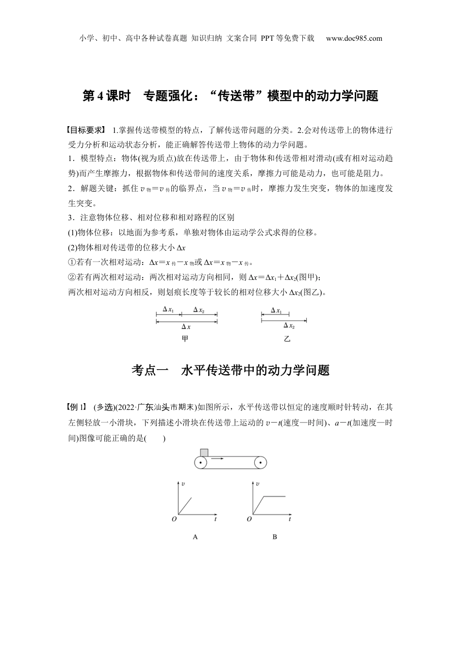 小学、初中、高中各种试卷真题知识归纳文案合同PPT等免费下载www.doc985.com第4课时专题强化:“传送带”模型中的动力学问题目标要求1.掌握传送带模型的特点,了解传送带问题的分类。2.会对传送带上的物体进行受力分析和运动状态分析,能正确解答传送带上物体的动力学问题。1.模型特点:物体(视为质点)放在传送带上,由于物体和传送带相对滑动(或有相对运动趋势)而产生摩擦力,根据物体和传送带间的速度关系,摩擦力可能是动力,也可能是阻力。2.解题关键:抓住v物=v传的临界点,当v物=v传时,摩擦力发生突变,物体的加速度发生突变。3.注意物体位移、相对位移和相对路程的区别(1)物体位移:以地面为参考系,单独对物体由运动学公式求得的位移。(2)物体相对传送带的位移大小Δx①若有一次相对运动:Δx=x传-x物或Δx=x物-x传。②若有两次相对运动:两次相对运动方向相同,则Δx=Δx1+Δx2(图甲);两次相对运动方向相反,则划痕长度等于较长的相对位移大小Δx2(图乙)。考点一水平传送带中的动力学问题例1(多选)(2022·广汕市期末东头)如图所示,水平传送带以恒定的速度顺时针转动,在其左侧轻放一小滑块,下列描述小滑块在传送带上运动的v-t(速度—时间)、a-t(加速度—时间)图像可能正确的是()小学、初中、高中各种试卷真题知识归纳文案合同PPT等免费下载www.doc985.com例2(多选)(2024·四川市零绵阳诊)应用于机场和火车站的安全检查仪,其传送装置可简化为如图所示的模型。传送带始终保持v=0.4m/s的恒定速率运行,行李与传送带之间的动摩擦因数μ=0.2,A、B间的距离为2m,g取10m/s2。旅客把行李(可视为质点)无初速度地放在A处,则下列说法正确的是()A.开始时行李的加速度大小为2m/s2B.行李经过2s到达B处C.行李在传送带上留下的摩擦痕迹长度为0.12mD.当行李的速度与传送带的速度相同时,传送带立刻停止运动。整个过程中行李在传送带上留下的摩擦痕迹长度为0.04m例3(多选)(2023·天津市芦台一中期末)如图甲所示,绷紧的水平传送带始终以恒定速率v1顺时针运行,初速度大小为v2的小物块从与传送带等高的光滑水平地面上的A处滑上传送带。若从小物块滑上传送带开始计时,小物块在传送带上运动的v-t图像(以地面为参考系)如图乙所示,已知v2>v1,则()A.t2时刻,小物块离A处的距离达到最大B.t2时刻,小物块相对传送带滑动的距离达到最大C.0~t2时间内,小物块始终受到大小不变的摩擦力作用D.0~t2时间内,小物块受到的摩擦力先向右后向左水平传送带问题的常见情形及运动分析情景滑的情块运动况送不足传带够长(滑最块终未送相止与传带对静)送足传带够长小学、初中、高中各种试卷真题知识归纳文案合同PPT等免费下载www.doc985.com一直加速先加速后速匀v0<v,一直加速时v0<v,先加速再速时匀v0>v,一直速时减v0>v,先速再速时减匀滑一直速到右端块减滑先速到速度块减为0,后被送传带回左端传若v0≤v,返回到左端速度则时为v0;若v0>v,返回到左端速度则时为v考点二倾斜传送带中的动力学问题例4如图所示,传送带与水平地面的夹角θ=37°,从A到B的长度为L=10.25m,传送带以v0=10m/s的速率逆时针转动。在传送带上端A无初速度放一个质量为m=0.5kg的黑色煤块(可视为质点),它与传送带之间的动摩擦因数为μ=0.5,煤块在传送带上经过会留下黑色痕迹。已知sin37°=0.6,g取10m/s2,求:(1)当煤块与传送带速度相同时,接下来它们能否相对静止;(2)煤块从A运动到B的时间;(3)煤块从A到B的过程中在传送带上留下痕迹的长度。_______________________________________________________________________________________________________________________________________________________________________________________________________________________________________________________________________________________________________________________________________________________________________________________________________________________________________________________________________________________________________________________________...