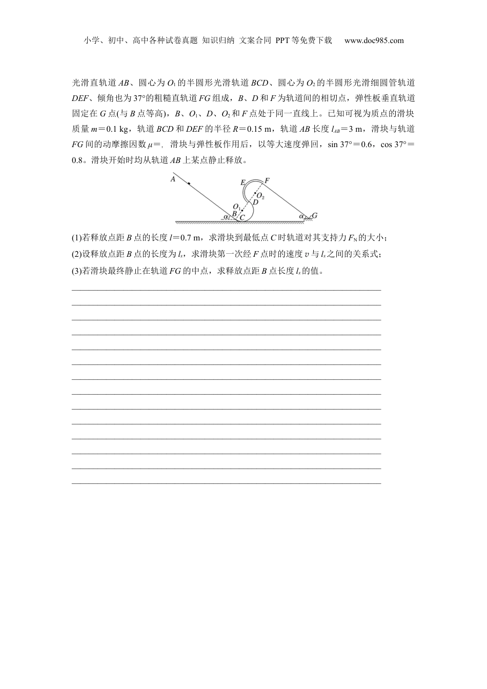 小学、初中、高中各种试卷真题知识归纳文案合同PPT等免费下载www.doc985.com第3课时专题强化:动能定理在多过程问题中的应用目标要求1.会用动能定理解决多过程、多阶段的问题。2.掌握动能定理在往复运动问题中的应用。考点一动能定理在多过程问题中的应用1.应用动能定理解决多过程问题的两种思路(1)分阶段应用动能定理①若题目需要求某一中间物理量,应分阶段应用动能定理。②物体在多个运动过程中,受到的弹力、摩擦力等力若发生了变化,力在各个过程中做功情况也不同,不宜全过程应用动能定理,可以研究其中一个或几个分过程,结合动能定理,各个击破。(2)全过程(多个过程)应用动能定理当物体运动过程包含几个不同的物理过程,又不需要研究过程的中间状态时,可以把几个运动过程看作一个整体,巧妙运用动能定理来研究,从而避开每个运动过程的具体细节,大大减少运算。2.全过程列式时要注意(1)重力、弹簧弹力做功取决于物体的初、末位置,与路径无关。(2)大小恒定的阻力或摩擦力做功的数值等于力的大小与路程的乘积。例1(2024·安徽安市模庆拟)小球由地面竖直向上抛出,上升的最大高度为H,设所受阻力大小恒定,选地面为参考平面,在上升至离地h高处,小球的动能是重力势能的2倍,到达最高点后再下落至离地高h处,小球的重力势能是动能的2倍,则h等于()A.B.C.D.例2(2023·湖北卷·14)如图为某游戏装置原理示意图。水平桌面上固定一半圆形竖直挡板,其半径为2R、内表面光滑,挡板的两端A、B在桌面边缘,B与半径为R的固定光滑圆弧轨道在同一竖直平面内,过C点的轨道半径与竖直方向的夹角为60°。小物块以某一水平初速度由A点切入挡板内侧,从B点飞出桌面后,在C点沿圆弧切线方向进入轨道内侧,并恰好能到达轨道的最高点D。小物块与桌面之间的动摩擦因数为,重力加速度大小为g,忽略空气阻力,小物块可视为质点。求:小学、初中、高中各种试卷真题知识归纳文案合同PPT等免费下载www.doc985.com(1)小物块到达D点的速度大小;(2)B和D两点的高度差;(3)小物块在A点的初速度大小。________________________________________________________________________________________________________________________________________________________________________________________________________________________________________________________________________________________________________________________________________________________________________________________________________________________________________________________________________________________________________________________考点二动能定理在往复运动问题中的应用1.往复运动问题:在有些问题中物体的运动过程具有重复性、往返性,描述运动的物理量多数是变化的,而且重复的次数又往往是无限的或者难以确定的。2.解题策略:此类问题多涉及滑动摩擦力或其他阻力做功,其做功的特点是与路程有关,运用牛顿运动定律及运动学公式将非常烦琐,甚至无法解出,由于动能定理只涉及物体的初、末状态,所以用动能定理分析这类问题可使解题过程简化。例3如图所示,固定斜面的倾角为θ,质量为m的滑块从距挡板P的距离为x0处以初速度v0沿斜面上滑,滑块与斜面间的动摩擦因数为μ,滑块所受摩擦力小于重力沿斜面向下的分力。若滑块每次与挡板相碰均无机械能损失,重力加速度为g,则滑块经过的总路程是()A.(+x0tanθ)B.(+x0tanθ)C.(+x0tanθ)D.(+)例4(2022·浙江1月考选·20)如图所示,处于竖直平面内的一探究装置,由倾角α=37°的小学、初中、高中各种试卷真题知识归纳文案合同PPT等免费下载www.doc985.com光滑直轨道AB、圆心为O1的半圆形光滑轨道BCD、圆心为O2的半圆形光滑细圆管轨道DEF、倾角也为37°的粗糙直轨道FG组成,B、D和F为轨道间的相切点,弹性板垂直轨道固定在G点(与B点等高),B、O1、D、O2和F点处于同一直线上。已知可视为质点的滑块质量m=0.1kg,轨道BCD和DEF的半径R=0.15m,轨道AB长度lAB=3m,滑块与轨道FG间的动摩擦因数μ=,滑块与弹性板作用后,以等大速度弹回,sin37°...