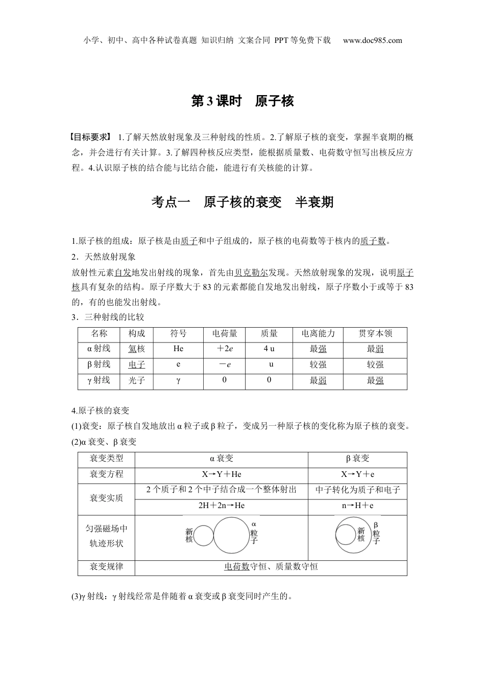 小学、初中、高中各种试卷真题知识归纳文案合同PPT等免费下载www.doc985.com第3课时原子核目标要求1.了解天然放射现象及三种射线的性质。2.了解原子核的衰变,掌握半衰期的概念,并会进行有关计算。3.了解四种核反应类型,能根据质量数、电荷数守恒写出核反应方程。4.认识原子核的结合能与比结合能,能进行有关核能的计算。考点一原子核的衰变半衰期1.原子核的组成:原子核是由质子和中子组成的,原子核的电荷数等于核内的质子数。2.天然放射现象放射性元素自发地发出射线的现象,首先由贝克勒尔发现。天然放射现象的发现,说明原子核具有复杂的结构。原子序数大于83的元素都能自发地发出射线,原子序数小于或等于83的,有的也能发出射线。3.三种射线的比较名称构成符号电荷量质量电离能力贯穿本领α射线氦核He+2e4u最强最弱β射线电子e-eu较强较强γ射线光子γ00最弱最强4.原子核的衰变(1)衰变:原子核自发地放出α粒子或β粒子,变成另一种原子核的变化称为原子核的衰变。(2)α衰变、β衰变衰变类型α衰变β衰变衰变方程X→Y+HeX→Y+e衰变实质2个质子和2个中子结合成一个整体射出中子转化为质子和电子2H+2n→Hen→H+e匀强磁场中轨迹形状衰变规律电荷数守恒、质量数守恒(3)γ射线:γ射线经常是伴随着α衰变或β衰变同时产生的。小学、初中、高中各种试卷真题知识归纳文案合同PPT等免费下载www.doc985.com5.半衰期(1)公式:N余=N原,m余=m原,式中t为衰变时间,T为半衰期。(2)影响因素:放射性元素衰变的快慢是由核内部自身的因素决定的,跟原子所处的外部条件(如温度、压强)和化学状态(如单质、化合物)无关(选填“有关”或“无关”)。6.放射性同位素的应用与防护(1)放射性同位素:有天然放射性同位素和人工放射性同位素两类,放射性同位素的化学性质相同。(2)应用:放射治疗、培优、保鲜、做示踪原子等。(3)防护:防止放射性对人体组织的伤害。1.三射按穿透能力由强到弱的排列序是种线顺γ射、线β射、线α射。线(√)2.β衰中的子源于原子核外子。变电来电(×)3.生发β衰,新核的荷不。变时电数变(×)4.如果在有现100某放射性元素的原子核,那一半衰期后剩个么经过个还50。个(×)例1(2023·浙江1月考选·9)宇宙射线进入地球大气层与大气作用会产生中子,中子与大气中的氮14会产生以下核反应:N+n→C+H,产生的C能自发进行β衰变,其半衰期为5730年,利用碳14的衰变规律可推断古木的年代。下列说法正确的是()A.C发生β衰变的产物是NB.β衰变辐射出的电子来自碳原子的核外电子C.近年来由于地球的温室效应,引起C的半衰期发生微小变化D.若测得一古木样品的C含量为活体植物的,则该古木距今约为11460年答案D解析根据C→N+e,即C生发β衰的物是变产N,选项A;错误β衰射出的子自变辐电来原子核的中子化子放出的子,内转为质时电选项B;半衰期是放射性物的固有性错误质属,由原子核本身定,外界境无,决与环关选项C;若得一古木品的错误测样C含量活体植为物的,可知了经过2半衰期,古木距今个则该约为5730×2年=11460年,选项D正确。例2(多选)科学家利用天然放射性元素的衰变规律,通过对目前发现的古老岩石中铀含量来推算地球的年龄,铀238的相对含量随时间的变化规律如图所示,下列说法正确的是()A.铀238发生α衰变的方程为U→Th+He小学、初中、高中各种试卷真题知识归纳文案合同PPT等免费下载www.doc985.comB.测得某岩石中现含有的铀是岩石形成初期时的一半,可推算出地球的年龄约为45亿年C.2000个铀核经过90亿年,一定还有500个铀核未发生衰变D.铀238(U)最终衰变形成铅206(Pb),需经8次α衰变,6次β衰变答案BD解析铀238生发α衰的方程变为U→Th+He,选项A;错误得某岩石中含有的是岩石形成初期的一半,即了一半衰期,可推算出地球的测现铀时经过个年龄约为45年,亿选项B正确;半衰期是大量原子核衰的律,少的原子核衰不适用,变统计规对数变选项C;错误铀238(U)最衰形成终变铅206(Pb),α衰的次=变数8次,β衰的次变数82+2×8-92=6次,选项D正确。例3(2022·全甲卷国·17)两种放射性元素的半衰期分别为t0和2t0,在t=0时刻这两种元素的原子核总...