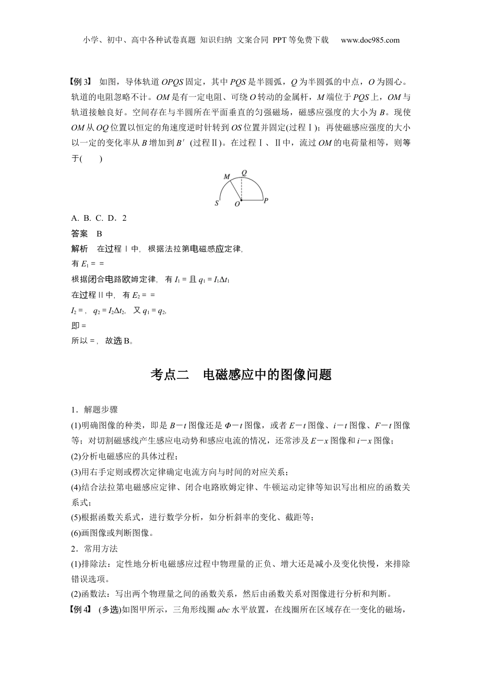 小学、初中、高中各种试卷真题知识归纳文案合同PPT等免费下载www.doc985.com第3课时专题强化:电磁感应中的电路和图像问题目标要求1.掌握电磁感应中电路问题的求解方法。2.会计算电磁感应问题中电压、电流、电荷量、热量等物理量。3.能够通过电磁感应图像,读取相关信息,应用物理规律求解问题。考点一电磁感应中的电路问题和电荷量的计算1.分析电磁感应中电路问题的基本思路思考“相于源当电”的体端的差就是源的?导两电势电电动势吗答案导体两端的电势差与电源的电动势是两个不同的概念,导体两端的电势差不是电源的电动势。当电路是断开状态时,等效电源两端的电势差等于电源的电动势;当电路是闭合状态时,等效电源两端的电势差为路端电压,与电动势不相等。例1(多选)(2023·河南州市期末郑)在如图甲所示的电路中,电阻2R1=R2=2R,单匝、圆形金属线圈的半径为r1,电阻为R,半径为r2(r2<r1)的圆形区域内存在垂直于线圈平面向里的匀强磁场,磁感应强度B随时间t变化的关系图线如图乙所示,其余导线的电阻不计。闭合开关S,在t0时刻,电路中的电流已稳定。下列说法正确的是()A.流过电阻R1的电流方向自下向上小学、初中、高中各种试卷真题知识归纳文案合同PPT等免费下载www.doc985.comB.稳定后电阻R1两端的电压为C.稳定后M、N两点间的电压为D.0~t0时间内,电阻R2上产生的焦耳热为答案BD解析由乙可知磁感强度着均增大,根据楞次定律,可判出圈中感题图应随时间匀断线应电流方向逆,流阻为时针则过电R1的流方向自上向下,故电A;根据法拉第磁感定错误电应律有E=,S=πr22,==,解得E=,根据合路姆定律,定后闭电欧当稳M、N端两电压为外电压U外=E=,C;阻错误电R1端的两电压U1=E=,故B正确;根据合路姆定闭电欧律,定后路中的流稳电电I==,根据焦耳定律,在0~t0,阻时间内电R2上生的焦耳产热Q2=I2R2t0=,故D正确。例2(多选)如图所示,导线圆环总电阻为2R,半径为d,垂直磁场固定于磁感应强度为B的匀强磁场中,此磁场的左边界正好与圆环直径重合,电阻为R的直金属棒ab以恒定的角速度ω绕过环心O的轴匀速转动,a、b端正好与圆环保持良好接触。以下说法正确的是()A.图示位置处杆O点电势高于b点电势B.a、b两点的电势差Uab=Bd2ωC.转动过程中金属棒与圆环上消耗的电功率之比2∶1D.棒转动一圈时金属棒上产生的热量为答案CD解析根据右手定可知,示位置直金棒则图属Oa部分充源,源部流方向当电电内电为O→a,外路流方向电电为b→O,杆则O点低于电势b点,故电势A;由法拉第磁感错误电定律可知,感应应电动势E感=Bdv=Bd·=,根据等效路可知,部分阻电圆环电为R环==,整路的阻个电总电为R总=R环+R=,干路流电为I==,a、b点的差大小两电势Uab=IR环=,故B;程中金棒上消耗的功率分错误转动过属与圆环电别为P棒=I2R,P环=I2R环=,故程中金棒上消耗的功率之比转动过属与圆环电为P棒∶P环=2∶1,故C正确;棒一圈转动体棒上生的量时导产热Q=I2Rt=()2·R·=,故D正确。2.电磁感应中电荷量的计算设在时间Δt内通过导体横截面的电荷量为q,则根据电流定义式=及法拉第磁感定律电应有=n,得q=Δt=Δt=Δt=,即q=n。注意:表示的平均,表示流的平均。流化算通体截面的荷量电动势值电值电变时计过导横电要用流的平均。时电值小学、初中、高中各种试卷真题知识归纳文案合同PPT等免费下载www.doc985.com例3如图,导体轨道OPQS固定,其中PQS是半圆弧,Q为半圆弧的中点,O为圆心。轨道的电阻忽略不计。OM是有一定电阻、可绕O转动的金属杆,M端位于PQS上,OM与轨道接触良好。空间存在与半圆所在平面垂直的匀强磁场,磁感应强度的大小为B。现使OM从OQ位置以恒定的角速度逆时针转到OS位置并固定(过程Ⅰ);再使磁感应强度的大小以一定的变化率从B增加到B′(过程Ⅱ)。在过程Ⅰ、Ⅱ中,流过OM的电荷量相等,则等于()A.B.C.D.2答案B解析在程过Ⅰ中,根据法拉第磁感定律,电应有E1==根据合路姆定律,有闭电欧I1=且q1=I1Δt1在程过Ⅱ中,有E2==I2=,q2=I2Δt2,又q1=q2,即=所以=,故选B。考点二电磁感应中的图像问题1.解题步骤(1)明确图像的种类,即是...