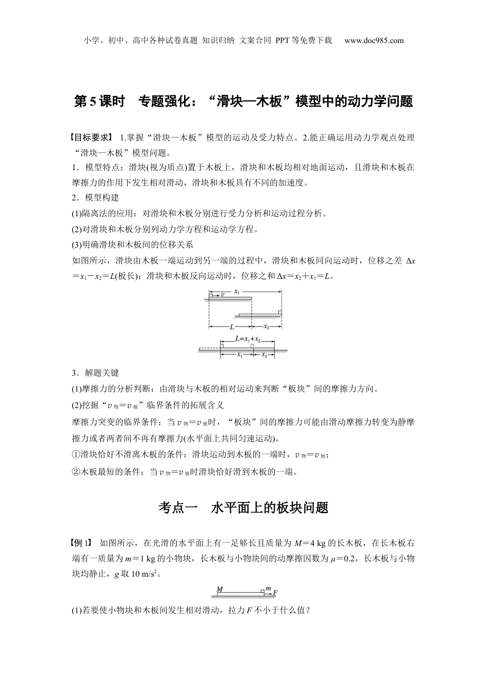 小学、初中、高中各种试卷真题知识归纳文案合同PPT等免费下载www.doc985.com第5课时专题强化:“滑块—木板”模型中的动力学问题目标要求1.掌握“滑块—木板”模型的运动及受力特点。2.能正确运用动力学观点处理“滑块—木板”模型问题。1.模型特点:滑块(视为质点)置于木板上,滑块和木板均相对地面运动,且滑块和木板在摩擦力的作用下发生相对滑动,滑块和木板具有不同的加速度。2.模型构建(1)隔离法的应用:对滑块和木板分别进行受力分析和运动过程分析。(2)对滑块和木板分别列动力学方程和运动学方程。(3)明确滑块和木板间的位移关系如图所示,滑块由木板一端运动到另一端的过程中,滑块和木板同向运动时,位移之差Δx=x1-x2=L(板长);滑块和木板反向运动时,位移之和Δx=x2+x1=L。3.解题关键(1)摩擦力的分析判断:由滑块与木板的相对运动来判断“板块”间的摩擦力方向。(2)挖掘“v物=v板”临界条件的拓展含义摩擦力突变的临界条件:当v物=v板时,“板块”间的摩擦力可能由滑动摩擦力转变为静摩擦力或者两者间不再有摩擦力(水平面上共同匀速运动)。①滑块恰好不滑离木板的条件:滑块运动到木板的一端时,v物=v板;②木板最短的条件:当v物=v板时滑块恰好滑到木板的一端。考点一水平面上的板块问题例1如图所示,在光滑的水平面上有一足够长且质量为M=4kg的长木板,在长木板右端有一质量为m=1kg的小物块,长木板与小物块间的动摩擦因数为μ=0.2,长木板与小物块均静止,g取10m/s2。(1)若要使小物块和木板间发生相对滑动,拉力F不小于什么值?小学、初中、高中各种试卷真题知识归纳文案合同PPT等免费下载www.doc985.com(2)现用F=14N的水平恒力向右拉长木板,经时间t=1s撤去水平恒力F,则:①在F的作用下,长木板的加速度为多大?②刚撤去F时,小物块离长木板右端多远?③最终长木板与小物块一起以多大的速度匀速运动?④最终小物块离长木板右端多远?答案(1)10N(2)①3m/s2②0.5m③2.8m/s④0.7m解析(1)物和木板恰好生相滑,摩擦力到最大,此的加速度当块发对动时静达值设时为a0,根据牛第二定律,小物有顿对块μmg=ma0,物和木板整体有对块F0=(m+M)a0,立解得联F0=10N,即若小物和木板生相滑,拉力不小于块发对动10N。(2)①木板,根据牛第二定律可得对长顿F-μmg=Ma,解得a=3m/s2②撤去F之前,小物只受摩擦力的作用块故am=a0=μg=2m/s2Δx1=at2-amt2=0.5m③撤去刚F时v=at=3m/s,vm=amt=2m/s撤去F后,木板的加速度大小长a′==0.5m/s2最速度终v′=vm+amt′=v-a′t′解得共同速度v′=2.8m/s④在t′,小物和木板的相位移内块长对Δx2=-,解得Δx2=0.2m最小物离木板右端的距离终块长为x=Δx1+Δx2=0.7m。例2(多选)如图甲所示,长木板B静止在光滑水平地面上,在t=0时刻,可视为质点、质量为1kg的物块A在水平外力F作用下,从长木板的左端从静止开始运动,1s后撤去外力F,物块A、长木板B的速度—时间图像如图乙所示,g=10m/s2,则下列说法正确的是()A.长木板的最小长度为2mB.A、B间的动摩擦因数是0.1小学、初中、高中各种试卷真题知识归纳文案合同PPT等免费下载www.doc985.comC.长木板的质量为0.5kgD.外力F的大小为4N答案ABD解析由乙可知,题图2s后物和木板到共速后一起速,明木板地面之无块达匀运动说与间摩擦,v-t像中图图线与t成的面表示物体的位移,故由乙可知,在轴围积题图2s物内块的位移为x1=4m,木板的位移为x2=2m,故木板的最小度长长为L=x1-x2=2m,A正确;由乙可知,题图1s撤去外力时F,在1~2s由物的受力及牛第二定律可知内块顿μmg=maA,由乙可知题图1~2s物的加速度大小内块为aA=1m/s2,解得A、B的摩擦因间动数为μ=0.1,B正确;由乙可知,木板的加速度大小题图为aB=1m/s2,由木板B的受力及牛第二定律可知顿μmg=MaB,解得木板的量长质为M=1kg,C;由错误0~1s物的受内块力及牛第二定律可知顿F-μmg=maA′,又此程中加速度的大小过为aA′=3m/s2,解得F=4N,D正确。例3(2024·广佛山市考东联)如图所示,质量均为m=1kg的物块A和B叠放在水平地面上,左边缘对齐。A与B、B与地面间的动摩擦因数均为μ=0.4...