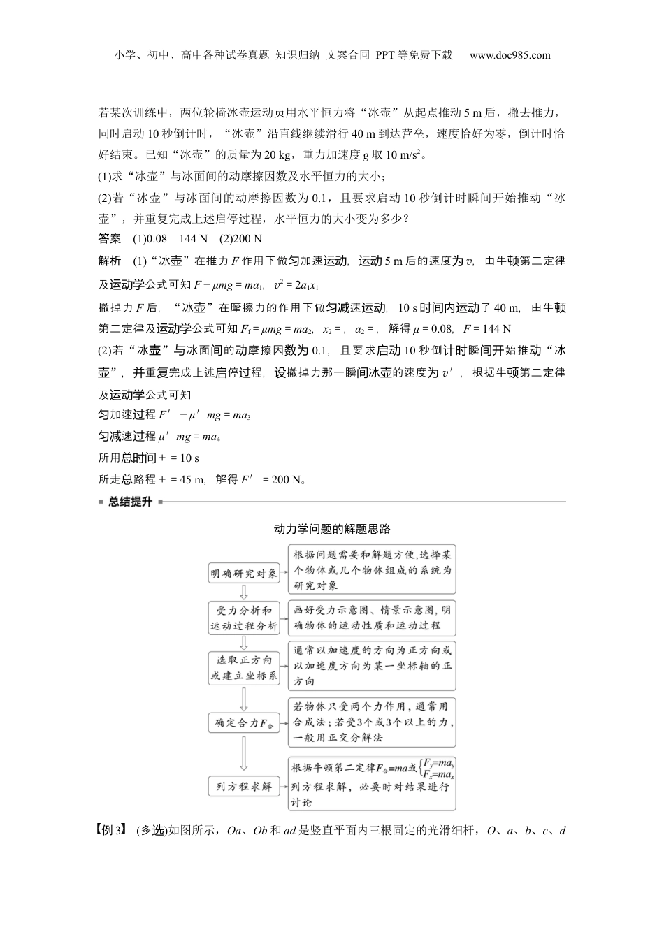 小学、初中、高中各种试卷真题知识归纳文案合同PPT等免费下载www.doc985.com第2课时牛顿第二定律的基本应用目标要求1.掌握动力学两类基本问题的求解方法。2.理解各种动力学图像,并能分析图像特殊点、斜率、截距、面积的物理意义。考点一动力学两类基本问题分析动力学两类基本问题的关键(1)做好两类分析:物体的受力分析和物体的运动过程分析;(2)搭建两个桥梁:加速度是联系运动和力的桥梁;连接点的速度是联系各物理过程的桥梁。例1(2023·广潮州市考东联)连续刹车时,刹车片和刹车盘产生大量热量,温度升高很快,刹车效率迅速降低,容易造成刹车失灵。为了避免刹车失灵造成的危害,高速公路在一些连续下坡路段设置用沙石铺成的紧急避险车道,如图所示。现将某次货车避险过程简化如下:一辆货车在倾角为30°的长直下坡路上以20m/s的速度匀速行驶,突然刹车失灵开始加速,此时货车所受阻力为车重的0.4倍(发动机关闭),加速前进15s后冲上了倾角为53°的避险车道,在避险车道上运动17.5m后停下,将货车的加速、减速过程视为匀变速直线运动,求货车:(sin53°=0.8,g取10m/s2)(1)冲上避险车道时速度的大小;(2)在避险车道上所受摩擦阻力是车重的多少倍。答案(1)35m/s(2)2.7解析(1)根据意,机后加速前的加速度大小题设货车关闭发动进为a1,冲上避道速险车时度的大小为v1,由牛第二定律有顿mgsin30°-0.4mg=ma1由公式有运动学v1=v0+a1t立代入据解得联数v1=35m/s(2)根据意,在避道上的加速度大小题设货车险车运动时为a2,在避道上所受摩擦阻力险车为Ff,由牛第二定律有顿mgsin53°+Ff=ma2由公式有运动学v12=2a2x,解得Ff=2.7mg即在避道上所受摩擦阻力是重的险车车2.7倍。例2(2023·山西太原市一模)2022北京冬残奥会开幕式倒计时是以轮椅冰壶的形式出现的。小学、初中、高中各种试卷真题知识归纳文案合同PPT等免费下载www.doc985.com若某次训练中,两位轮椅冰壶运动员用水平恒力将“冰壶”从起点推动5m后,撤去推力,同时启动10秒倒计时,“冰壶”沿直线继续滑行40m到达营垒,速度恰好为零,倒计时恰好结束。已知“冰壶”的质量为20kg,重力加速度g取10m/s2。(1)求“冰壶”与冰面间的动摩擦因数及水平恒力的大小;(2)若“冰壶”与冰面间的动摩擦因数为0.1,且要求启动10秒倒计时瞬间开始推动“冰壶”,并重复完成上述启停过程,水平恒力的大小变为多少?答案(1)0.08144N(2)200N解析(1)“冰壶”在推力F作用下做加速,匀运动运动5m后的速度为v,由牛第二定律顿及公式可知运动学F-μmg=ma1,v2=2a1x1撤掉力F后,“冰壶”在摩擦力的作用下做速,匀减运动10s了时间内运动40m,由牛顿第二定律及公式可知运动学Ff=μmg=ma2,x2=,a2=,解得μ=0.08,F=144N(2)若“冰壶”冰面的摩擦因与间动数为0.1,且要求启动10秒倒瞬始推计时间开动“冰壶”,重完成上述停程,撤掉力那一瞬冰的速度并复启过设间壶为v′,根据牛第二定律顿及公式可知运动学加速程匀过F′-μ′mg=ma3速程匀减过μ′mg=ma4所用+=总时间10s所走路程+=总45m,解得F′=200N。动力学问题的解题思路例3(多选)如图所示,Oa、Ob和ad是竖直平面内三根固定的光滑细杆,O、a、b、c、d小学、初中、高中各种试卷真题知识归纳文案合同PPT等免费下载www.doc985.com位于同一圆周上,c为圆周的最高点,a为最低点,O′为圆心。每根杆上都套着一个小滑环(未画出),两个滑环从O点无初速度释放,一个滑环从d点无初速度释放,用t1、t2、t3分别表示滑环沿Oa、Ob、da到达a或b所用的时间。下列关系正确的是()A.t1=t2B.t2>t3C.t1<t2D.t1=t3答案BCD解析想有一根光滑固定杆设还细ca,则ca、Oa、da三杆交于的最低点细圆a,三杆点顶均在周上,杆直方向的角圆设与竖夹为θ,有则2R·cosθ=g·cosθ·t2得t=2,可知从c、O、d无初速度放的小滑到释环达a点的相等,即时间tca=t1=t3;而由c→a由与O→b滑的小动滑相比,滑行位移大小相等,初速度均零,但加速度环较为aca>aOb,由x=at2可知,t2>tca,即t2>t1=t3,故B、C、D正确。拓展若沿cb放一光滑杆,小滑个细环从c放,处释运动时间为t4,t4和t1系如何?关答案t4=t1等时圆模...