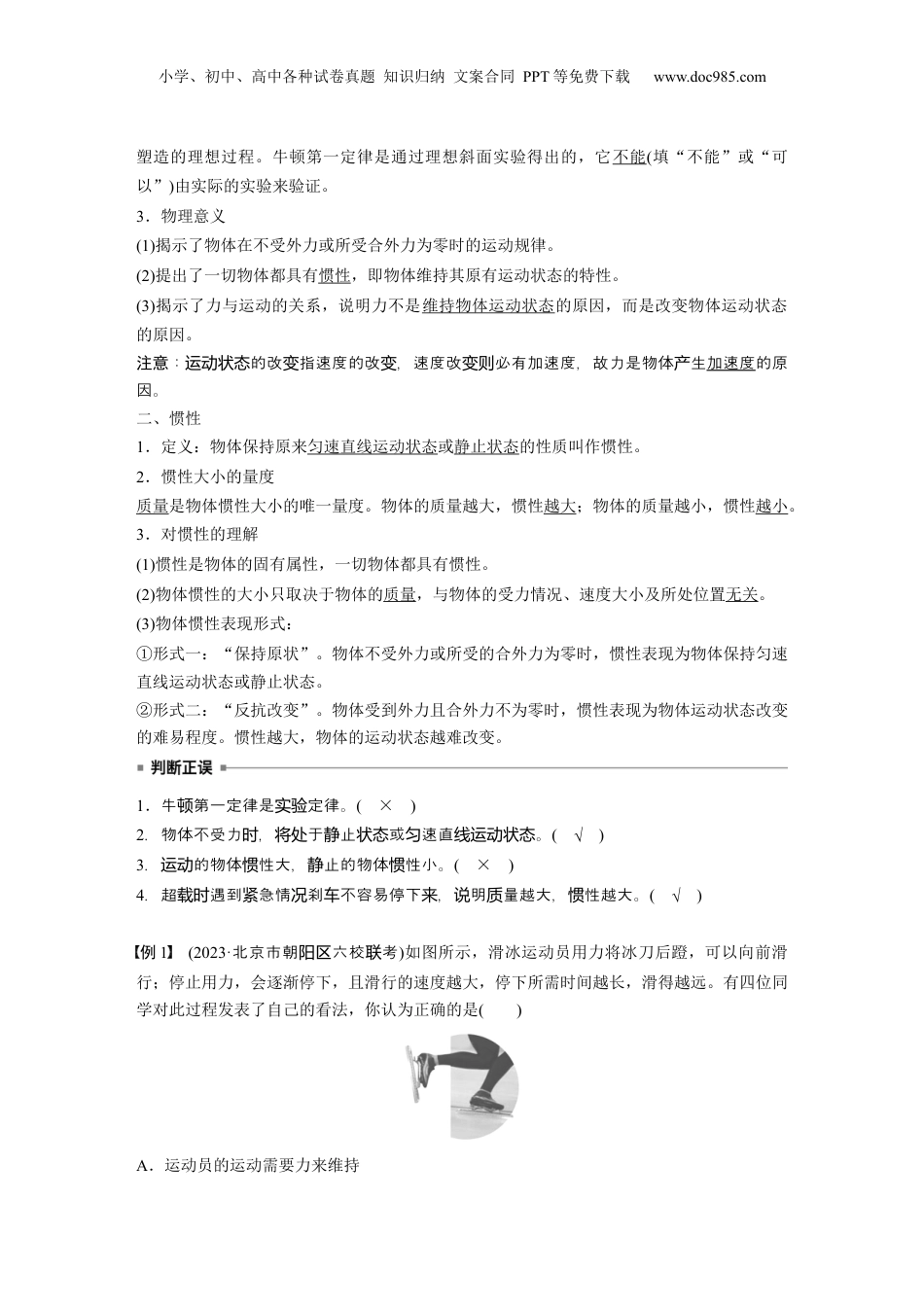 小学、初中、高中各种试卷真题知识归纳文案合同PPT等免费下载www.doc985.com考情分析试题情境生活实践类跳水、蹦床、蹦极、火箭发射、无人机、跳伞运动、电梯内的超重及失重学习探究类传送带模型,板块模型,探究加速度与力、质量的关系,测量动摩擦因数第1课时牛顿第一定律牛顿第二定律目标要求1.理解牛顿第一定律的内容和惯性的本质。2.掌握牛顿第二定律的内容及公式,能够应用牛顿第二定律解决问题。3.了解单位制,并知道国际单位制中的七个基本单位,会用国际单位制检查结果表达式是否正确。考点一牛顿第一定律一、牛顿第一定律1.内容:一切物体总保持匀速直线运动状态或静止状态,除非作用在它上面的力迫使它改变这种状态。2.理想实验:它是在经验事实基础上采用科学的抽象思维来展开的实验,是人们在思想上小学、初中、高中各种试卷真题知识归纳文案合同PPT等免费下载www.doc985.com塑造的理想过程。牛顿第一定律是通过理想斜面实验得出的,它不能(填“不能”或“可以”)由实际的实验来验证。3.物理意义(1)揭示了物体在不受外力或所受合外力为零时的运动规律。(2)提出了一切物体都具有惯性,即物体维持其原有运动状态的特性。(3)揭示了力与运动的关系,说明力不是维持物体运动状态的原因,而是改变物体运动状态的原因。注意:的改指速度的改,速度改必有加速度,故力是物体生运动状态变变变则产加速度的原因。二、惯性1.定义:物体保持原来匀速直线运动状态或静止状态的性质叫作惯性。2.惯性大小的量度质量是物体惯性大小的唯一量度。物体的质量越大,惯性越大;物体的质量越小,惯性越小。3.对惯性的理解(1)惯性是物体的固有属性,一切物体都具有惯性。(2)物体惯性的大小只取决于物体的质量,与物体的受力情况、速度大小及所处位置无关。(3)物体惯性表现形式:①形式一:“保持原状”。物体不受外力或所受的合外力为零时,惯性表现为物体保持匀速直线运动状态或静止状态。②形式二:“反抗改变”。物体受到外力且合外力不为零时,惯性表现为物体运动状态改变的难易程度。惯性越大,物体的运动状态越难改变。1.牛第一定律是定律。顿实验(×)2.物体不受力,于止或速直。时将处静状态匀线运动状态(√)3.的物体性大,止的物体性小。运动惯静惯(×)4.超遇到急情刹不容易停下,明量越大,性越大。载时紧况车来说质惯(√)例1(2023·北京市朝六校考阳区联)如图所示,滑冰运动员用力将冰刀后蹬,可以向前滑行;停止用力,会逐渐停下,且滑行的速度越大,停下所需时间越长,滑得越远。有四位同学对此过程发表了自己的看法,你认为正确的是()A.运动员的运动需要力来维持小学、初中、高中各种试卷真题知识归纳文案合同PPT等免费下载www.doc985.comB.停止用力,运动员停下来是具有惯性的表现C.停止用力,运动员停下来是由于摩擦力的作用D.速度越大,停下所需时间越长,说明惯性的大小和速度有关答案C解析力是改物体的原因,不是持物体的原因,故变运动状态维运动A;停止用力,错误停下是由于摩擦力的作用,而是因性,故运动员来继续运动为惯B,错误C正确;摩擦力一定,根据公式可知,速度越大,停下所需越,但性自身的量有,时运动学时间长惯与质关与速度无,故关D。错误例2(2023·江省州中期末苏苏学)大型油罐车内部设置了一些固定挡板,如图所示,油罐车在水平路面上行驶,下列说法正确的是()A.油罐车匀速前进时,油没有惯性B.油罐车加速前进时,油的液面仍然保持水平C.油罐车减速前进时,两挡板间油的液面前低后高D.挡板间油的质量相对小,可以有效减弱变速时油的涌动答案D解析性的大小只取于物体的量,和物体的无,故惯决质运动状态关A;油罐加错误当车速前,由于性油向后涌,所以油的液面前低后高,故进时惯动应B;油罐速前错误当车减,油向前涌,油的液面前高后低,故进时动C;板油的量相小,油的错误当挡间质对时惯性小,可以有效弱速油的涌,故减变时动D正确。考点二牛顿第二定律1.内容:物体加速度的大小跟它受到的作用力成正比,跟它的质量成反比,加速度的方向跟作用力的方向相同。2.表达式:F=ma。3.对牛顿第二定律的理解小学、初中、高中各种试卷真题...