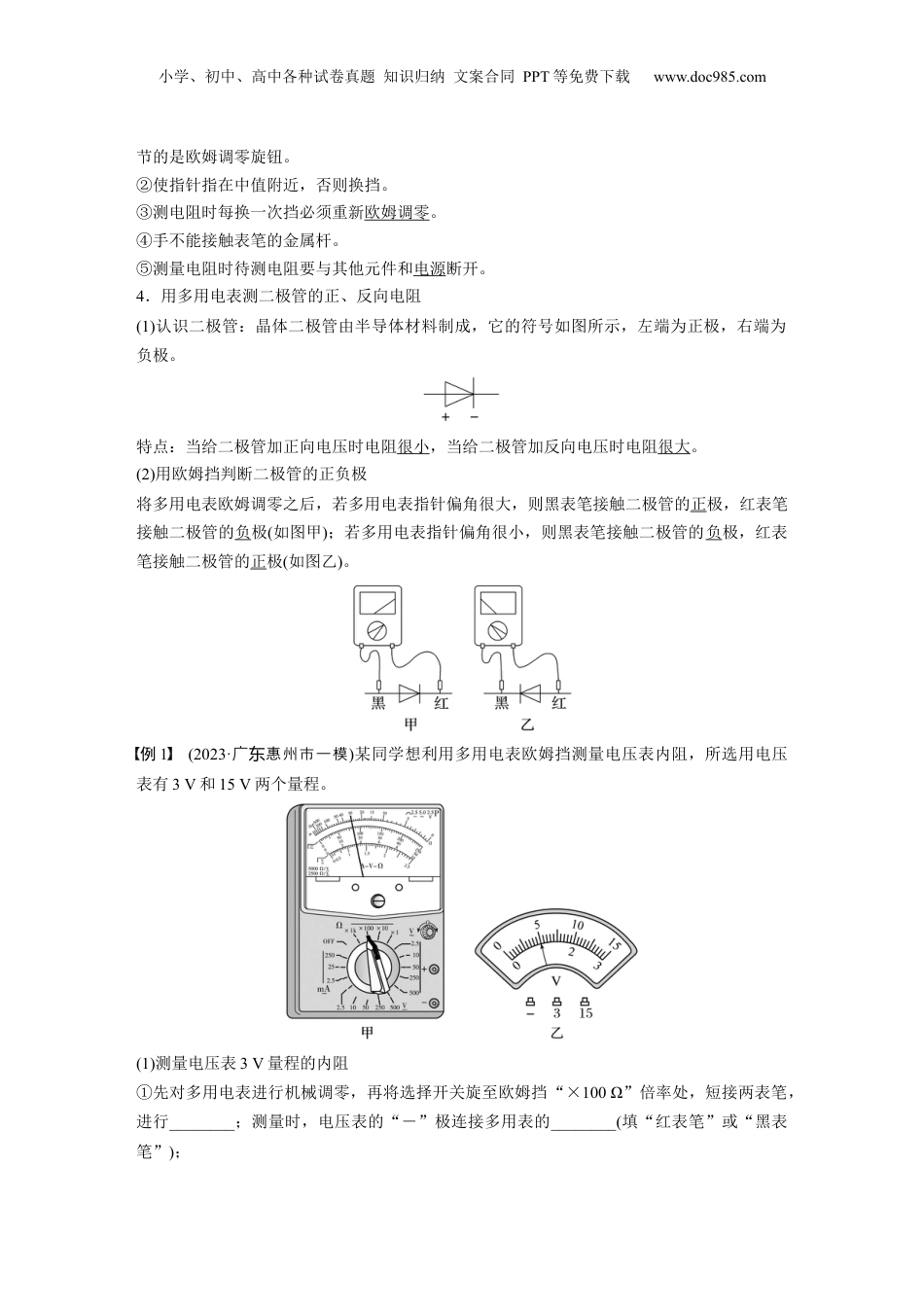 小学、初中、高中各种试卷真题知识归纳文案合同PPT等免费下载www.doc985.com第6课时实验十三:用多用电表测量电学中的物理量目标要求1.了解多用电表的构造和工作原理。2.会用多用电表测量电压、电流。3.测量定值电阻和判断二极管的正负极。4.会用多用电表进行简单的电路故障分析。考点一实验技能储备1.认识多用电表(1)多用电表可以用来测量电流、电压、电阻等物理量,并且每一种测量项目都有几个量程。(2)外形如图所示:上半部分为表盘,表盘上有电流、电压、电阻等多种量程的刻度;下半部分为选择开关,它的四周刻有各种测量项目和量程。(3)多用电表面板上还有:欧姆表的欧姆调零旋钮(使电表指针指在右端零欧姆处)、指针定位螺丝(使电表指针指在左端的“0”位置)、表笔的正、负插孔(红表笔插入“+”插孔,黑表笔插入“-”插孔)。(4)原理图:2.用多用电表测量小灯泡的电压和电流按如图甲所示的电路图连好电路,将多用电表选择开关置于直流电压挡,测小灯泡两端的电压。红表笔接电势高(选填“高”或“低”)的点。小学、初中、高中各种试卷真题知识归纳文案合同PPT等免费下载www.doc985.com按如图乙所示的电路图连好电路,将选择开关置于直流电流挡,测量通过小灯泡的电流。此时电流从红表笔流入多用电表。3.用多用电表测定值电阻的阻值(1)原理电路图I与Rx的对应关系相当于待测电阻Rx=0,调节R使I=Ig=,此指指时针在偏流满电Ig处(欧姆表内阻RΩ=Rg+r+R)相当于待测电阻Rx=∞,此时I=0,指针不偏转待测电阻为Rx,I=,指指到某确定位置,此针时Rx=-RΩ刻度特点表头电流满偏Ig处,对应欧姆表零刻度(最右侧)表头电流I=0处,对应欧姆表∞刻度(最左侧)表头电流I与电阻Rx一一对应,但不是线性关系,表盘刻度不均匀两点说明(1)黑表笔与电源的正极连接,红表笔与电源的负极连接,电流方向为“红进黑出”。(2)当多用电表指针指在中央时=,故中阻值电R中=RΩ。(2)测量步骤①估测待测电阻阻值,选择合适的量程。②欧姆调零。③将被测电阻接在红、黑表笔之间。④读数:指针示数乘以倍率。⑤使用完毕:选择开关置于“OFF”挡,长期不用应取出电池。(3)注意事项①区分“机械零点”与“欧姆零点”。机械零点是表盘刻度左侧的“0”位置,机械调零调节的是表盘下边中间的指针定位螺丝;欧姆零点是指刻度盘右侧的“0”位置,欧姆调零调小学、初中、高中各种试卷真题知识归纳文案合同PPT等免费下载www.doc985.com节的是欧姆调零旋钮。②使指针指在中值附近,否则换挡。③测电阻时每换一次挡必须重新欧姆调零。④手不能接触表笔的金属杆。⑤测量电阻时待测电阻要与其他元件和电源断开。4.用多用电表测二极管的正、反向电阻(1)认识二极管:晶体二极管由半导体材料制成,它的符号如图所示,左端为正极,右端为负极。特点:当给二极管加正向电压时电阻很小,当给二极管加反向电压时电阻很大。(2)用欧姆挡判断二极管的正负极将多用电表欧姆调零之后,若多用电表指针偏角很大,则黑表笔接触二极管的正极,红表笔接触二极管的负极(如图甲);若多用电表指针偏角很小,则黑表笔接触二极管的负极,红表笔接触二极管的正极(如图乙)。例1(2023·广惠州市一模东)某同学想利用多用电表欧姆挡测量电压表内阻,所选用电压表有3V和15V两个量程。(1)测量电压表3V量程的内阻①先对多用电表进行机械调零,再将选择开关旋至欧姆挡“×100Ω”倍率处,短接两表笔,进行________;测量时,电压表的“―”极连接多用表的________(填“红表笔”或“黑表笔”);小学、初中、高中各种试卷真题知识归纳文案合同PPT等免费下载www.doc985.com②测量时欧姆表的指针如图甲,则电压表3V量程的内阻为________Ω。(2)电压表15V量程和3V量程由同一个表头改装的,则可推算出15V量程的内阻等于________Ω。(3)若该多用电表欧姆挡可选用电动势为“1.5V”或“9V”两个规格的干电池,根据图甲、乙中欧姆表盘及电压表示数,可以推断选择“×100Ω”倍率时所用干电池电动势为_____V。答案(1)①欧姆调零红表笔②3000(2)15000(3)1.5解析(1)①先多用表行机械零,再旋至姆对电进调将选择开关欧挡“×100Ω”倍率,短处接表,行姆零。两...