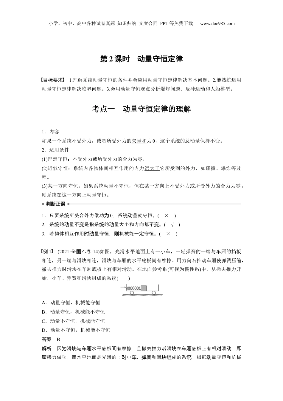 小学、初中、高中各种试卷真题知识归纳文案合同PPT等免费下载www.doc985.com第2课时动量守恒定律目标要求1.理解系统动量守恒的条件并会应用动量守恒定律解决基本问题。2.能熟练运用动量守恒定律解决临界问题。3.会用动量守恒观点分析爆炸问题、反冲运动和人船模型。考点一动量守恒定律的理解1.内容如果一个系统不受外力,或者所受外力的矢量和为0,这个系统的总动量保持不变。2.适用条件(1)理想守恒:不受外力或所受外力的合力为零。(2)近似守恒:系统内各物体间相互作用的内力远大于它所受到的外力,如碰撞、爆炸等过程。(3)某一方向守恒:如果系统动量不守恒,但在某一方向上不受外力或所受外力的合力为零,则系统在这一方向上动量守恒。1.只要系所受合外力做功统为0,系量就守恒。统动(×)2.系的量不是指系的量大小和方向都不。统动变统动变(√)3.若物体相互作用量守恒,机械能一定守恒。时动则(×)例1(2021·全乙卷国·14)如图,光滑水平地面上有一小车,一轻弹簧的一端与车厢的挡板相连,另一端与滑块相连,滑块与车厢的水平底板间有摩擦。用力向右推动车厢使弹簧压缩,撤去推力时滑块在车厢底板上有相对滑动。在地面参考系(可视为惯性系)中,从撤去推力开始,小车、弹簧和滑块组成的系统()A.动量守恒,机械能守恒B.动量守恒,机械能不守恒C.动量不守恒,机械能守恒D.动量不守恒,机械能不守恒答案B解析因滑水平底板有摩擦,且撤去推力后滑在底板上有相滑,即为块与车厢间块车厢对动摩擦力做功,而水平地面是光滑的;小、簧和滑成的系,根据量守恒和机械对车弹块组统动小学、初中、高中各种试卷真题知识归纳文案合同PPT等免费下载www.doc985.com能守恒的件可知撤去推力后系量守恒,机械能不守恒,故条该统动选B。例2(2023·宁丹市期末辽东)如图,水平地面上有一小车C,顶端有一轻滑轮,质量完全相同的两个小木块A、B由通过滑轮的轻绳相连接,初始时用手托住小木块A,使A、B、C均处于静止状态。某时刻突然将手撤去,A、B、C开始运动,则对小车C、小木块A、B三者组成的系统,下列说法正确的是(所有摩擦均忽略不计)()A.动量不守恒,机械能不守恒B.动量守恒,机械能守恒C.竖直方向上动量守恒,机械能不守恒D.水平方向上动量守恒,机械能守恒答案D解析所有摩擦均忽略不,只有能和能相互化,的机械能不,机械能守恒;初计动势转总变始用手托住小木时块A,使A、B、C均于止。松手后,整系直方向上合力处静状态个统竖不零,量不守恒,但水平方向上合力零,水平方向上量守恒。故为动为动D正确。考点二动量守恒定律的基本应用1.动量守恒定律的表达式(1)p=p′或m1v1+m2v2=m1v1′+m2v2′。即系统相互作用前的总动量等于相互作用后的总动量。(2)Δp1=-Δp2,相互作用的两个物体动量的变化量等大反向。2.动量守恒定律的五个特性:矢量性动量守恒定律的表达式为矢量方程,解题应选取统一的正方向相对性各物体的速度必须是相对同一参考系的速度(一般是相对于地面)同时性动量是一个瞬时量,表达式中的p1、p2…应是系统中各物体在相互作用前同一时刻的动量,p1′、p2′…应是系统中各物体在相互作用后同一时刻的动量系统性研究的对象是相互作用的两个或多个物体组成的系统普适性动量守恒定律不仅适用于低速宏观物体组成的系统,还适用于接近光速运动的微观粒子组成的系统例3(2023·江西宜春市樟中模树学拟)如图,质量M=9kg的小车A以大小为v0=8m/s的速度沿光滑水平面匀速运动,小车左端固定的支架光滑水平台面上放置质量m=1kg的小球小学、初中、高中各种试卷真题知识归纳文案合同PPT等免费下载www.doc985.comB(可看作质点),小球距离车上表面H=0.8m。某一时刻,小车与静止在水平面上的质量m0=6kg的物块C发生碰撞并粘连在一起(碰撞时间可忽略),此后,小球刚好落入小车右端固定的桶中(桶的尺寸可忽略),不计空气阻力,取重力加速度g=10m/s2,求:(1)小车的最终速度的大小v;(2)初始时小球与桶的水平距离Δx。答案(1)5m/s(2)1.28m解析(1)整程中,小球个过B、小车A和物块C成的系水平方向不受外力,系水平组统统方向量守恒,系最速度动设统终为v,取水平向右正方向,由水平...