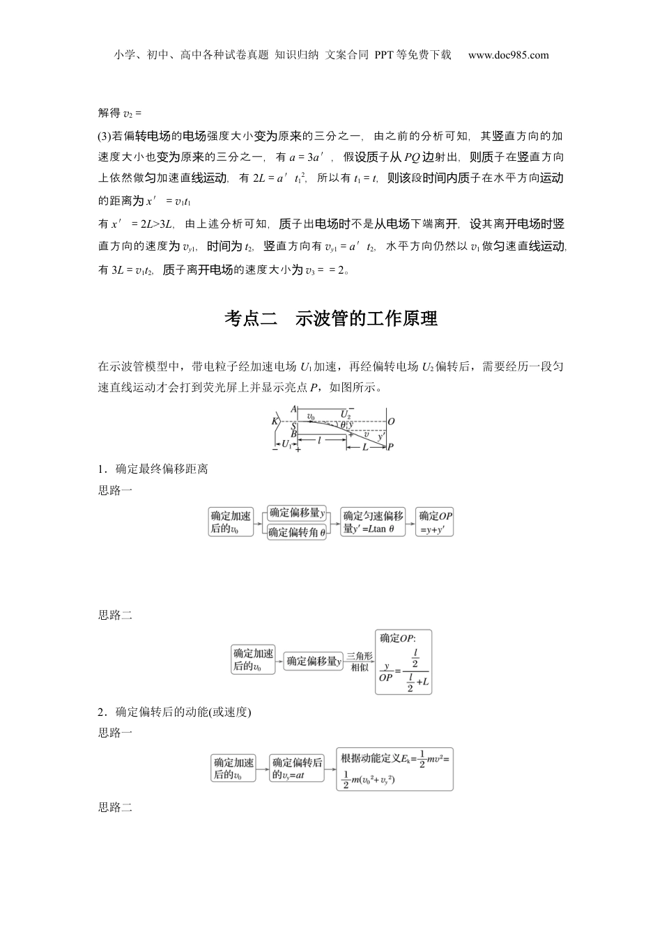 小学、初中、高中各种试卷真题知识归纳文案合同PPT等免费下载www.doc985.com第5课时带电粒子在电场中的偏转目标要求1.掌握带电粒子在电场中偏转的规律。2.理解带电粒子在示波管中的运动。3.掌握带电粒子在电场和重力场的叠加场中的运动规律。考点一带电粒子在匀强电场中的偏转1.运动规律(1)沿初速度方向做匀速直线运动,t=(如图)。(2)沿静电力方向做匀加速直线运动①加速度:a===;②离开电场时的偏移量:y=at2=;③离开电场时的偏转角:tanθ==。2.功能关系当讨论带电粒子的末速度v时也可以从能量的角度进行求解:qUy=mv2-mv02,其中Uy=y,指初、末位置间的电势差。3.粒子经电场偏转后射出时,速度的反向延长线与初速度延长线的交点O为粒子水平位移的中点,即O到偏转电场边缘的距离为偏转极板长度的一半。思考不同的粒子带电(同性带种电)在加速的同一位置由止始加速后再入同一偏电场静开进,粒子的迹是重合的?转电场带电轨吗答案由qU0=mv02y=at2=··2tanθ==得y=,tanθ=,y、θ均与m、q无关。即偏移量和偏转角总是相同的,所以它们的轨迹是重合的。例1(多选)(2023·河北唐山市模拟)如图所示,空间存在竖直向上的匀强电场,一个带电粒子电荷量为q,以一定的水平初速度由P点射入匀强电场,当粒子从Q点射出电场时,其速度方向与竖直方向成30°角。已知匀强电场的宽度为d,P、Q两点的电势差为U,不计粒子重力,设Q点的电势为零。则下列说法正确的是()小学、初中、高中各种试卷真题知识归纳文案合同PPT等免费下载www.doc985.comA.带电粒子在P点的电势能为UqB.带电粒子带负电C.匀强电场电场强度大小为E=D.匀强电场电场强度大小为E=答案AD解析粒子的迹向上,所受的力向上,方向相同,所以粒子正。粒子轨则静电与电场该带电从P到Q,力做正功静电为W=qU,粒子的能少了则电势减qU,Q点的零,知电势为则带粒子在电P点的能电势为Uq,故A正确,B;粒子在错误设带电P点的速度时为v0,以垂直于电场线为x,平行于轴电场线为y,由平抛的律和几何知求得在轴类运动规识Q点粒时子在y方向的分速度轴为vy=v0,粒子在y方向上的平均速度轴为y=,粒子在设y方向上轴的位移为y0,粒子在中的电场运动时间为t,直方向有则竖y0=yt=,水平方向有d=v0t,可得y0=,所以强度电场为E=,立得联E==,故C,错误D正确。例2(2024·江江市期中苏镇)如图,静止于A处的质子(质量为m、电荷量为e),经电压为U的加速电场加速后,沿图中虚线垂直MP进入方向竖直向下的矩形有界匀强偏转电场区域MNQP,区域边界MN=3L、MP=2L,质子经加速偏转后恰好能从PQ边距P点为2L处射出,质子重力不计。(结果均用e、U、m表示)(1)求质子离开加速电场时的速度大小;(2)求质子离开偏转电场时的速度大小;(3)若偏转电场的电场强度大小变为原来的三分之一、方向不变,求质子离开该区域时的速度大小。答案(1)(2)(3)2解析(1)子在加速中做加速直,由能定理有质电场线运动动eU=mv12-0,解得v1=(2)由意知,子在直方向做初速度零的加速直,在水平方向做速度大小的题质竖为线运动为速直,偏的强度匀线运动设转电场电场为E,直方向有竖eE=ma,2L=at2,vy=at,水平方向有2L=v1t子离偏速度质开转电场时为v2=小学、初中、高中各种试卷真题知识归纳文案合同PPT等免费下载www.doc985.com解得v2=(3)若偏的强度大小原的三分之一,由之前的分析可知,其直方向的加转电场电场变为来竖速度大小也原的三分之一,有变为来a=3a′,假子设质从PQ射出,子在直方向边则质竖上依然做加速直,有匀线运动2L=a′t12,所以有t1=t,段子在水平方向则该时间内质运动的距离为x′=v1t1有x′=2L>3L,由上述分析可知,子出不是下端离,其离质电场时从电场开设开电场时竖直方向的速度为vy1,时间为t2,直方向有竖vy1=a′t2,水平方向仍然以v1做速直匀线运动,有3L=v1t2,子离的速度大小质开电场为v3==2。考点二示波管的工作原理在示波管模型中,带电粒子经加速电场U1加速,再经偏转电场U2偏转后,需要经历一段匀速直线运动才会打到荧光屏上并显示亮点P,如图所示。1.确定最终偏移距离思路一思路二2.确定偏转后的动能(或速度)思...
