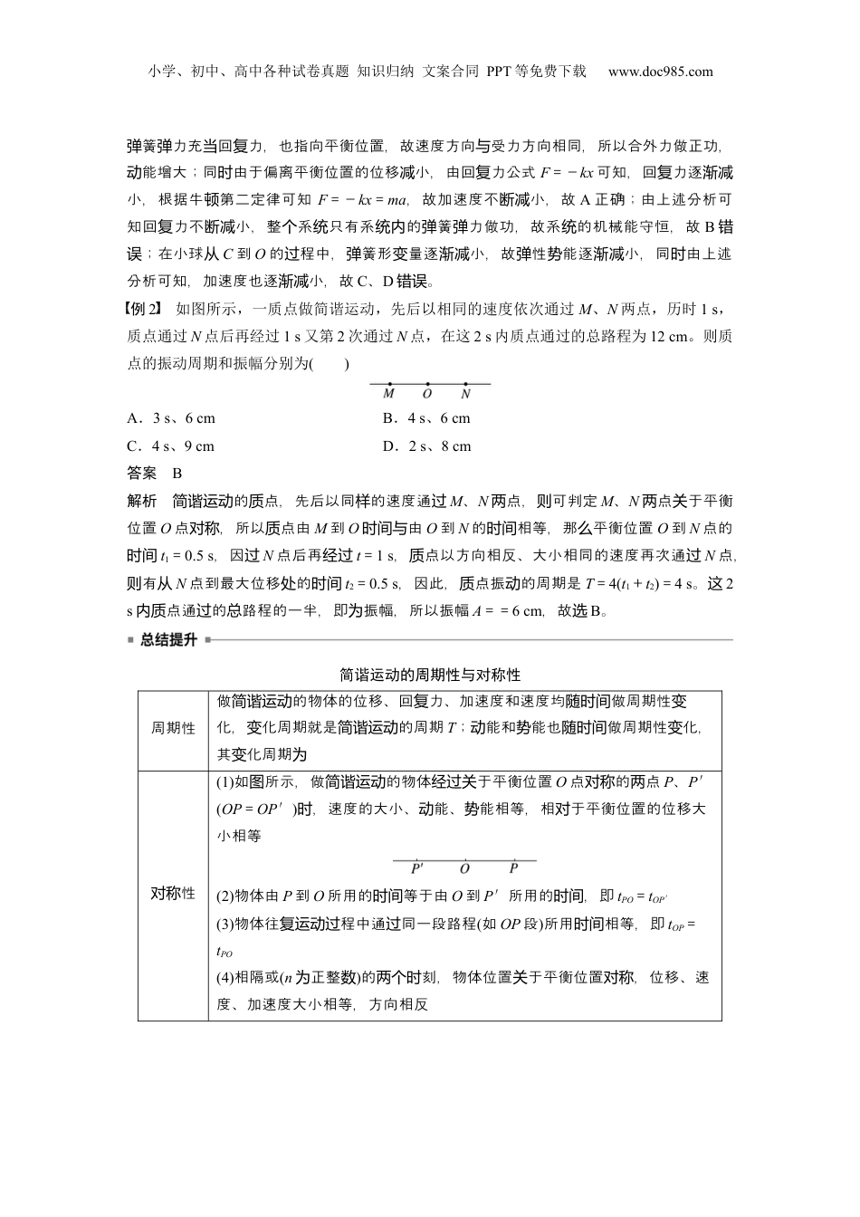 小学、初中、高中各种试卷真题知识归纳文案合同PPT等免费下载www.doc985.com考情分析试题情境生活实践类共振筛、摆钟、地震波、多普勒彩超等学习探究类简谐运动的特征、单摆的周期与摆长的定量关系、用单摆测量重力加速度、受迫振动的特点、共振的条件及其应用、波的干涉与衍射现象、多普勒效应第1课时机械振动目标要求1.知道简谐运动的概念,掌握简谐运动的特征,理解简谐运动的表达式和图像。2.知道什么是单摆,熟记单摆的周期公式。3.理解受迫振动和共振的概念,了解产生共振的小学、初中、高中各种试卷真题知识归纳文案合同PPT等免费下载www.doc985.com条件。考点一简谐运动的基本特征1.简谐运动:如果物体在运动方向上所受的力与它偏离平衡位置位移的大小成正比,并且总是指向平衡位置,这样的运动就是简谐运动。2.平衡位置:物体在振动过程中回复力为零的位置。3.回复力(1)定义:使物体在平衡位置附近做往复运动的力。(2)方向:总是指向平衡位置。4.简谐运动的特点受力特点回复力F=-kx,F(或a)的大小与x的大小成正比,方向相反运动特点靠近平衡位置时,a、F、x都减小,v增大;远离平衡位置时,a、F、x都增大,v减小(填“增大”或“减小”)能量特点对同一个振动系统,振幅越大,能量越大。在运动过程中,动能和势能相互转化,系统的机械能守恒1.的平衡位置就是点所受合力零的位置。简谐运动质为(×)2.做的点先后通同一点,回力、速度、加速度、位移都是相同的。简谐运动质过复(×)3.做的点,速度增大,其加速度一定小。简谐运动质时减(√)4.振物体半周期,路程等于动经过个2倍振幅;周期,路程等于振幅。经过个(×)例1如图所示,小球在BC之间做简谐运动,当小球位于O点时,弹簧处于原长,在小球从C运动到O的过程中()A.动能不断增大,加速度不断减小B.回复力不断增大,系统机械能守恒C.弹性势能不断减小,加速度不断增大D.弹性势能不断增大,加速度不断减小答案A解析做的小球,简谐运动从C到O的程中逐靠近平衡位置,速度方向指向平衡位置过渐,小学、初中、高中各种试卷真题知识归纳文案合同PPT等免费下载www.doc985.com簧力充回力,也指向平衡位置,故速度方向受力方向相同,所以合外力做正功,弹弹当复与能增大;同由于偏离平衡位置的位移小,由回力公式动时减复F=-kx可知,回力逐复渐减小,根据牛第二定律可知顿F=-kx=ma,故加速度不小,故断减A正确;由上述分析可知回力不小,整系只有系的簧力做功,故系的机械能守恒,故复断减个统统内弹弹统B错;在小球误从C到O的程中,簧形量逐小,故性能逐小,同由上述过弹变渐减弹势渐减时分析可知,加速度也逐小,故渐减C、D。错误例2如图所示,一质点做简谐运动,先后以相同的速度依次通过M、N两点,历时1s,质点通过N点后再经过1s又第2次通过N点,在这2s内质点通过的总路程为12cm。则质点的振动周期和振幅分别为()A.3s、6cmB.4s、6cmC.4s、9cmD.2s、8cm答案B解析的点,先后以同的速度通简谐运动质样过M、N点,可判定两则M、N点于平衡两关位置O点,所以点由对称质M到O由时间与O到N的相等,那平衡位置时间么O到N点的时间t1=0.5s,因过N点后再经过t=1s,点以方向相反、大小相同的速度再次通质过N点,有则从N点到最大位移的处时间t2=0.5s,因此,点振的周期是质动T=4(t1+t2)=4s。这2s点通的路程的一半,即振幅,所以振幅内质过总为A==6cm,故选B。简谐运动的周期性与对称性周期性做的物体的位移、回力、加速度和速度均做周期性简谐运动复随时间变化,化周期就是的周期变简谐运动T;能和能也做周期性化,动势随时间变其化周期变为性对称(1)如所示,做的物体于平衡位置图简谐运动经过关O点的点对称两P、P′(OP=OP′),速度的大小、能、能相等,相于平衡位置的位移大时动势对小相等(2)物体由P到O所用的等于由时间O到P′所用的,即时间tPO=tOP′(3)物体往程中通同一段路程复运动过过(如OP段)所用相等,即时间tOP=tPO(4)相隔或(n正整为数)的刻,物体位置于平衡位置,位移、速两个时关对称度、加速度大小相等,方向相反小学、初中、高中各种试卷真题知识归纳文案合同PPT等免费下载www.doc985.com考点二简...