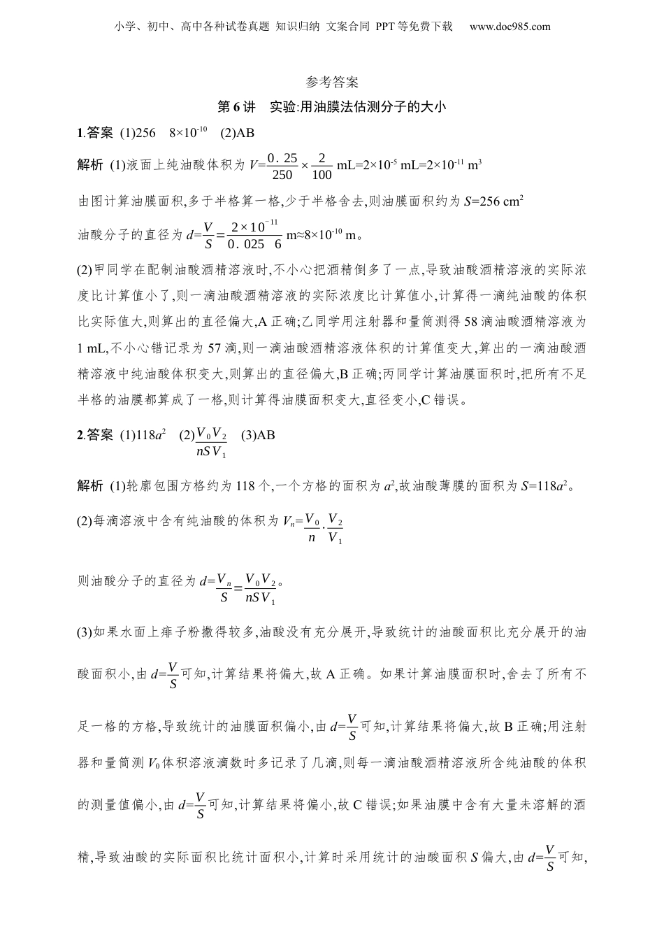 小学、初中、高中各种试卷真题知识归纳文案合同PPT等免费下载www.doc985.com2025人教版新教材物理高考第一轮第6讲实验:用油膜法估测分子的大小1.(2023广东广州三模)(1)在用油膜法估测分子大小的实验中,用移液管量取0.25mL油酸,倒入标注250mL的容量瓶中,再加入酒精后得到250mL的溶液,然后用滴管吸取这种溶液,向小量筒中滴入100滴溶液,溶液的液面达到量筒中1mL的刻度,再用滴管取配好的油酸溶液,向撒有痱子粉的盛水浅盘中滴下2滴溶液,在液面上形成油酸薄膜,待油膜稳定后,放在带有正方形坐标格的玻璃板下观察油膜,如图所示,坐标格的每个小正方形大小为2cm×2cm,由图可以估算出油膜的面积是cm2,由此估算出油酸分子的直径是m(保留一位有效数字)。(2)做“用油膜法估测分子的大小”实验时,三个同学都有一个操作错误,其中导致最后所测分子直径偏大的是。A.甲同学在配制油酸酒精溶液时,不小心把酒精倒多了一点,导致油酸酒精溶液的实际浓度比计算值小了B.乙同学用注射器和量筒测得58滴油酸酒精溶液为1mL,不小心错记录为57滴C.丙同学计算油膜面积时,把所有不足半格的油膜都算成了一格2.在“用油膜法估测分子大小”的实验中,所用油酸酒精溶液的浓度为每V1体积溶液中有纯油酸体积V2,用注射器和量筒测得V0体积上述溶液有n滴,把一滴该溶液滴入盛水的撒有痱子粉的浅盘中,待水面稳定后,得到油酸薄膜的轮廓形状和尺寸如图所示,图中每个小正方形格的边长为a,则可求得:(1)油酸薄膜的面积S=;(2)油酸分子的直径是;(用V1、V2、V0、n、S表示)小学、初中、高中各种试卷真题知识归纳文案合同PPT等免费下载www.doc985.com(3)某同学实验中最终得到的油酸分子直径数据偏大,可能是由于。A.水面上痱子粉撒得太多,油膜没有充分展开B.计算油膜面积时,舍去了所有不足一格的方格C.用注射器和量筒测V0体积溶液滴数时多记录了几滴D.油膜中含有大量未溶解的酒精3.(2024贵州毕节模拟)某同学用油膜法估测分子直径大小,实验步骤如下:①将体积为V0的纯油酸溶于酒精,稀释成总体积为V的油酸酒精溶液。用注射器吸取该溶液,一滴一滴地滴入小量筒中,滴入N滴时,记录体积为V1;②在边长为40~50cm的浅盘里倒入2.5cm深的水,将痱子粉均匀撒在水面上;③用注射器往水面上滴1滴上述溶液,当油酸形成的薄膜形状稳定后,将透明玻璃板盖在浅盘上,用彩色笔在玻璃板上描出油酸薄膜的形状;④将画有油酸薄膜轮廓形状的玻璃板置于坐标纸上,坐标纸的最小正方形边长为a。计算出轮廓范围内最小正方形的总个数为n,不足半个的舍去,多于半个的算一个;实验步骤①中,稀释油酸的目的是,油酸分子的直径表达式d=。假设用注射器吸取油酸酒精溶液滴入小量筒中时,滴数少记了几滴,由此计算出来的d将(选填“偏大”“偏小”或“不变”)。小学、初中、高中各种试卷真题知识归纳文案合同PPT等免费下载www.doc985.com参考答案第6讲实验:用油膜法估测分子的大小1.答案(1)2568×10-10(2)AB解析(1)液面上纯油酸体积为V=0.25250×2100mL=2×10-5mL=2×10-11m3由图计算油膜面积,多于半格算一格,少于半格舍去,则油膜面积约为S=256cm2油酸分子的直径为d=VS=2×10-110.0256m≈8×10-10m。(2)甲同学在配制油酸酒精溶液时,不小心把酒精倒多了一点,导致油酸酒精溶液的实际浓度比计算值小了,则一滴油酸酒精溶液的实际浓度比计算值小,计算得一滴纯油酸的体积比实际值大,则算出的直径偏大,A正确;乙同学用注射器和量筒测得58滴油酸酒精溶液为1mL,不小心错记录为57滴,则一滴油酸酒精溶液体积的计算值变大,算出的一滴油酸酒精溶液中纯油酸体积变大,则算出的直径偏大,B正确;丙同学计算油膜面积时,把所有不足半格的油膜都算成了一格,则计算得油膜面积变大,直径变小,C错误。2.答案(1)118a2(2)V0V2nSV1(3)AB解析(1)轮廓包围方格约为118个,一个方格的面积为a2,故油酸薄膜的面积为S=118a2。(2)每滴溶液中含有纯油酸的体积为Vn=V0n·V2V1则油酸分子的直径为d=VnS=V0V2nSV1。(3)如果水面上痱子粉撒得较多,油酸没有充分展开,导致统计的油酸面积比充分展开的油酸面积小,由d=VS可知,计算结果将偏大,故A正确。如果计算油膜面积时,舍去了所有不足一格的方格,导致统计的油膜面积偏小,由d=VS可知,计算结果将偏...