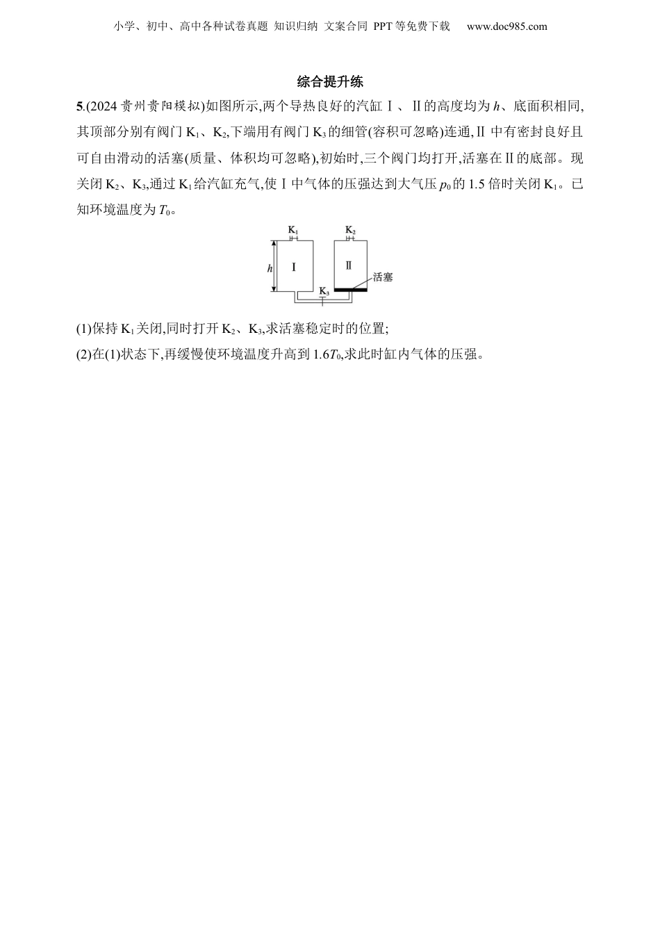 小学、初中、高中各种试卷真题知识归纳文案合同PPT等免费下载www.doc985.com2025人教版新教材物理高考第一轮第3讲专题提升:气体实验定律的综合应用基础对点练题组一玻璃管液柱模型1.如图所示,两端开口的U形玻璃管竖直放置,其右侧水银柱之间封住一段高h=5cm的空气柱。空气柱下方的水银面与玻璃管左侧水银面的高度差也为h。已知大气压强与75cm水银柱产生的压强相同,空气柱中的气体可视为理想气体,周围环境温度保持不变,玻璃管的导热性良好且玻璃管粗细均匀,水银的密度为ρ。下列说法正确的是()A.右侧玻璃管中空气柱上方的水银柱高度小于5cmB.封闭空气柱中气体的压强与70cm水银柱产生的压强相同C.从玻璃管右侧管口缓慢注入少量水银,空气柱的压强一定变大D.从玻璃管左侧管口缓慢注入少量水银,空气柱的压强一定变大2.如图所示,内径相同,导热良好的“T”形细玻璃管上端开口,下端、右端封闭,管中用水银封闭着A、B两部分理想气体,各部分长度如图。已知大气压强p0与76cm水银柱产生的压强相同,设外界温度不变,重力加速度为g。现沿管壁向竖直管缓慢灌入一定量的水银,水银的密度为ρ,B部分气体长度缩短1cm,则灌入水银后B部分气体的压强为()A.77cm·ρgB.86cm·ρgC.88cm·ρgD.90cm·ρg题组二汽缸活塞模型3.(多选)(2024黑龙江哈师大附中模拟)导热性能良好、内壁光滑的汽缸内用不计厚度的活塞封住一定质量的理想气体,现用弹簧连接活塞,将整个汽缸悬挂起来,如图所示。静止小学、初中、高中各种试卷真题知识归纳文案合同PPT等免费下载www.doc985.com时,弹簧长度为L,活塞距离地面高度为h,汽缸底部距离地面高度为H,汽缸内气体压强为p,体积为V,下列说法正确的是()A.当外界温度不变,大气压强变小时,L变小,H变大,p变大,V变小B.当外界温度不变,大气压强变小时,L不变,H变小,p变小,V变大C.当大气压强不变,外界温度升高时,h变小,H变大,p变小,V变大D.当大气压强不变,外界温度升高时,h不变,H变小,p不变,V变大4.(2023辽宁葫芦岛二模)如图甲所示,一水平固定放置的汽缸由两个粗细不同的圆柱形筒组成,汽缸中活塞Ⅰ与活塞Ⅱ之间封闭有一定量的理想气体,两活塞用长度为2L、不可伸长的轻质细线连接,活塞Ⅱ恰好位于汽缸的粗细缸连接处,此时细线拉直且无张力。现把汽缸竖直放置,如图乙所示,活塞Ⅰ在上方,稳定后活塞Ⅰ、Ⅱ到汽缸的粗细缸连接处的距离均为L。已知活塞Ⅰ与活塞Ⅱ的质量分别为2m、m,面积分别为2S、S,重力加速度大小为g,大气压强和环境温度保持不变,忽略活塞与汽缸壁的摩擦,汽缸不漏气,汽缸与活塞导热性良好,不计细线的体积。求:大气压强和图乙状态时细线上的拉力。小学、初中、高中各种试卷真题知识归纳文案合同PPT等免费下载www.doc985.com综合提升练5.(2024贵州贵阳模拟)如图所示,两个导热良好的汽缸Ⅰ、Ⅱ的高度均为h、底面积相同,其顶部分别有阀门K1、K2,下端用有阀门K3的细管(容积可忽略)连通,Ⅱ中有密封良好且可自由滑动的活塞(质量、体积均可忽略),初始时,三个阀门均打开,活塞在Ⅱ的底部。现关闭K2、K3,通过K1给汽缸充气,使Ⅰ中气体的压强达到大气压p0的1.5倍时关闭K1。已知环境温度为T0。(1)保持K1关闭,同时打开K2、K3,求活塞稳定时的位置;(2)在(1)状态下,再缓慢使环境温度升高到1.6T0,求此时缸内气体的压强。小学、初中、高中各种试卷真题知识归纳文案合同PPT等免费下载www.doc985.com6.气体弹簧是车辆上常用的一种减震装置,其简化结构如图所示。直立圆柱形密闭汽缸导热良好,横截面积为S的活塞通过连杆与车轮轴连接,初始时汽缸内密闭一段长度为L0,压强为p1的理想气体,汽缸与活塞间的摩擦忽略不计,车辆载重时相当于在汽缸顶部增加一个物体A,稳定时汽缸下降了0.75L0,气体温度保持不变。(1)求物体A的重力大小;(2)如果大气压强为p0,为使汽缸升到原位置,求需向汽缸内充入与汽缸温度相同大气的体积。小学、初中、高中各种试卷真题知识归纳文案合同PPT等免费下载www.doc985.com小学、初中、高中各种试卷真题知识归纳文案合同PPT等免费下载www.doc985.com参考答案第3讲专题提升:气体实验定律的综合应用1.C解析同一液面压强相等,则封闭气体的压强为p=ρg(h1+h2)=80cm·ρg,所以右侧玻璃管中空气柱上方的水...