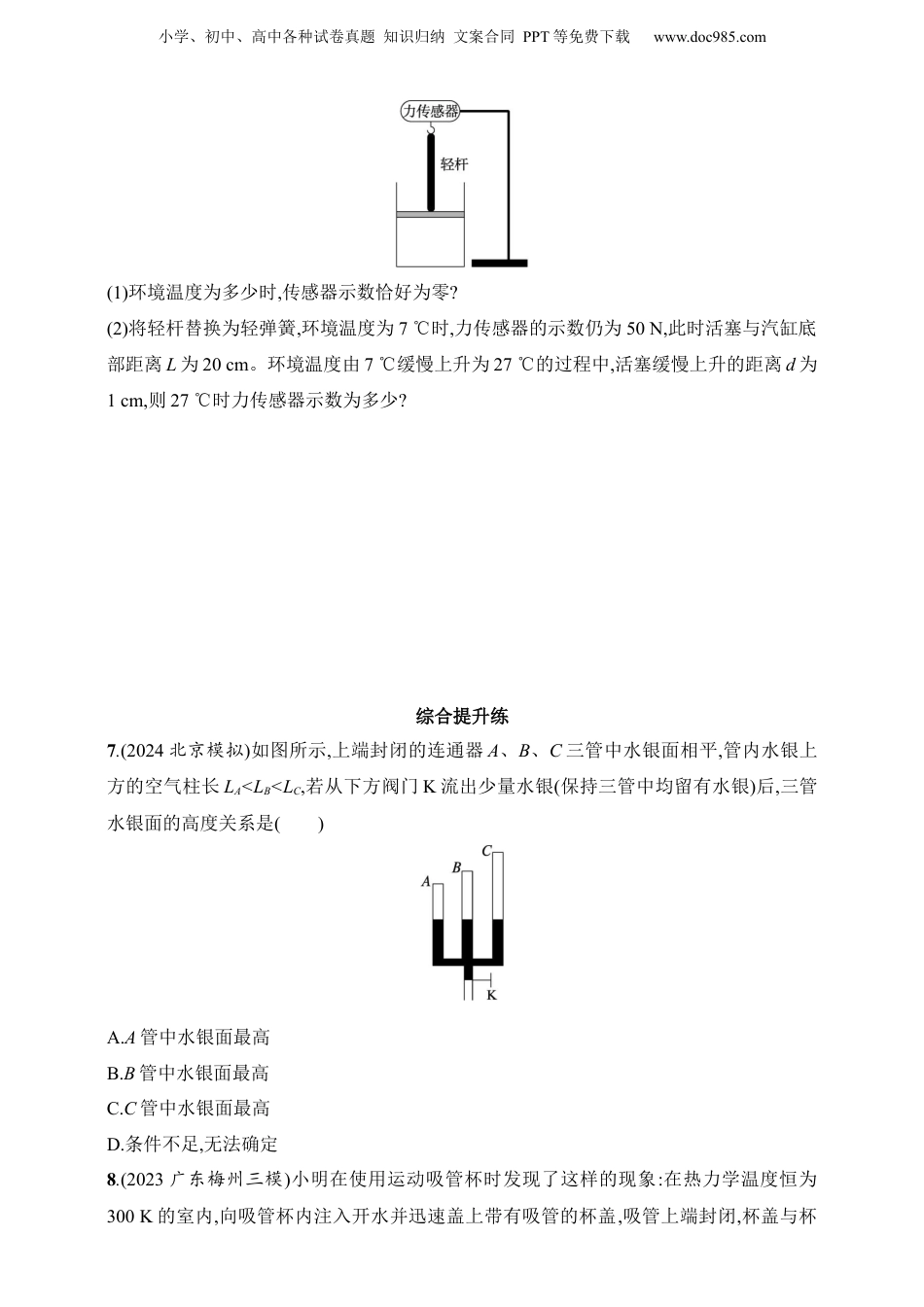 小学、初中、高中各种试卷真题知识归纳文案合同PPT等免费下载www.doc985.com2025人教版新教材物理高考第一轮第2讲固体液体气体基础对点练题组一固体液体性质1.(2024河南校联考模拟)下列关于物理现象的说法正确的是()A.水黾和轮船都能漂浮在水面上而不会沉入水中,都是因为液体表面张力的作用B.在空间站内可以做出很大的水球和几十毫米长的“液桥”,是因为在微重力环境下水的表面张力明显增大C.插入水中的细玻璃管,管内水面会比管外水面高并稳定在一定的高度,说明表面张力方向垂直液面向上D.液体表面张力有使液面收缩到最小的趋势2.(2023江苏南京六校联考二模)下列四幅图所涉及的物理知识,论述正确的是()A.图甲表明晶体熔化过程中分子平均动能变大B.图乙水黾可以在水面自由活动,说明它所受的浮力大于重力C.图丙是显微镜下三颗小炭粒的运动位置连线图,连线表示小炭粒的运动轨迹D.图丁中A是浸润现象,B是不浸润现象题组二气体的压强3.医院为病人输液的部分装置如图所示,图中A为输液瓶,B为滴壶,C为进气管,与大气相通。则在输液过程中(瓶A中尚有液体),下列说法正确的是()小学、初中、高中各种试卷真题知识归纳文案合同PPT等免费下载www.doc985.comA.瓶A中上方气体的压强随液面的下降而减小B.瓶A中液面下降,但A中上方气体的压强不变C.滴壶B中的气体压强随A中液面的下降而减小D.在瓶中药液输完以前,滴壶B中的气体压强保持不变题组三气体实验定律4.(2023上海二模)一定质量的气体保持体积不变,温度由0℃升高到10℃时,其压强的增加量为Δp1;当温度由100℃升高到110℃时,其压强的增加量为Δp2。则Δp1与Δp2之比是()A.1∶1B.1∶10C.10∶110D.273∶2835.如图所示,两端封闭的玻璃管在常温下竖直放置,管内充有理想气体,一段汞柱将气体封闭成上下两部分,两部分气体的长度分别为l1、l2,且l1=l2,下列判断正确的是()A.将玻璃管转至水平,稳定后两部分气体长度l1'>l2'B.将玻璃管转至水平,稳定后两部分气体长度l1'<l2'C.保持玻璃管竖直,使两部分气体升高相同温度,稳定后两部分气体长度l1'>l2'D.保持玻璃管竖直,使两部分气体升高相同温度,稳定后两部分气体长度l1'=l2'题组四理想气体状态方程的理解和应用6.某科技小组自制了一个用力传感器测量温度的装置。如图所示,导热性能良好的汽缸固定在水平地面上,汽缸横截面积S为0.01m2。质量m为5kg的活塞与汽缸间无摩擦且不漏气,活塞上方通过一刚性轻杆连接一个固定的力传感器,传感器可以直接显示出传感器对轻杆的力,传感器示数为正表示传感器对轻杆的作用力竖直向上。环境温度为7℃时,力传感器的示数F为50N。整个装置静止,大气压p0恒为1.0×105Pa,g取10m/s2,0℃取273K。小学、初中、高中各种试卷真题知识归纳文案合同PPT等免费下载www.doc985.com(1)环境温度为多少时,传感器示数恰好为零?(2)将轻杆替换为轻弹簧,环境温度为7℃时,力传感器的示数仍为50N,此时活塞与汽缸底部距离L为20cm。环境温度由7℃缓慢上升为27℃的过程中,活塞缓慢上升的距离d为1cm,则27℃时力传感器示数为多少?综合提升练7.(2024北京模拟)如图所示,上端封闭的连通器A、B、C三管中水银面相平,管内水银上方的空气柱长LA<LB<LC,若从下方阀门K流出少量水银(保持三管中均留有水银)后,三管水银面的高度关系是()A.A管中水银面最高B.B管中水银面最高C.C管中水银面最高D.条件不足,无法确定8.(2023广东梅州三模)小明在使用运动吸管杯时发现了这样的现象:在热力学温度恒为300K的室内,向吸管杯内注入开水并迅速盖上带有吸管的杯盖,吸管上端封闭,杯盖与杯小学、初中、高中各种试卷真题知识归纳文案合同PPT等免费下载www.doc985.com体未拧紧,这时有大量气泡从吸管底逸出,过了一会儿,吸管底端不再有气泡逸出,此时水与吸管内气体热力学温度均为367.2K,测得杯体水面与吸管顶端的高度差h=2cm,吸管总长L=22cm。已知水面上方气体的压强始终与外界大气压强相同,外界大气压强p0=1.0×105Pa,吸管内气体可视为理想气体,重力加速度g取10m/s2,水的密度ρ=1.0×103kg/m3,求:(1)吸管底端不再有气泡逸出时,吸管内气体的压强;(2)从吸管内逸出气体的质量与吸管内初始气体质量的比值。9.如图所示,热气球的下端有一小口,使球内外的...