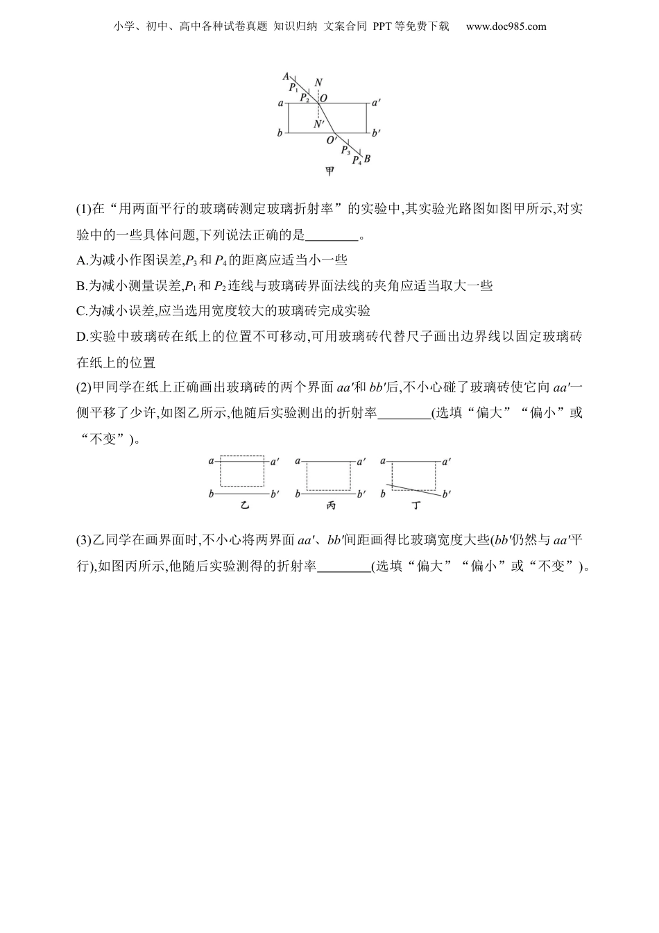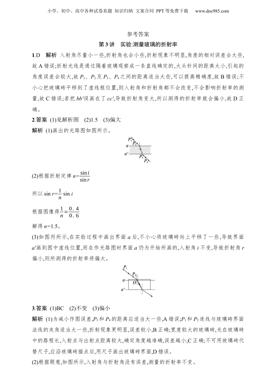小学、初中、高中各种试卷真题知识归纳文案合同PPT等免费下载www.doc985.com2025人教版新教材物理高考第一轮第3讲实验:测量玻璃的折射率1.(2023江苏南京二模)如图所示,某同学用“插针法”测量两面平行玻璃砖的折射率,他先在纸上紧贴玻璃砖画出参考线aa'bb',钉上大头针P1、P2,然后继续实验。并画出光路图,则下列说法正确的是()A.入射角i尽量小一些,可以减小误差B.P1、P2及P3、P4之间的距离取的小一些,可以减小误差C.若在钉大头针P3时不小心使玻璃板平移到了虚线框位置,则最终测得的折射率偏大D.若把bb'误画在了cc',其他操作均正确,则测得的折射率偏小2.在“测定玻璃的折射率”的实验中,在白纸上放好平行玻璃砖,a和a'分别是玻璃砖与空气的两个界面,如图甲所示。在玻璃砖的一侧插上两枚大头针P1和P2,然后在另一侧透过玻璃砖观察,并插上大头针P3,使其挡住P2、P1的像;接着插上大头针P4,使其挡住P3、P2和P1的像,用“·”表示大头针的位置,这样大头针P1、P2就确定了射入玻璃砖的光线。(1)根据以上信息,请在图甲中画出光路图。(2)正确作出光路图后,测量a分界面上的入射角i和折射角r。多次改变入射角,测得多组入射角和折射角,根据测得的入射角和折射角的正弦值,画出了如图乙所示的图像,由图像可知该玻璃的折射率n=(保留两位有效数字)。(3)如图丙所示,在实验过程中画出界面a后,不小心将玻璃砖向上平移了一些,导致界面a'画到图中虚线位置,而在作光路图时界面a仍为开始所画的,则所测得的折射率将(选填“偏大”“偏小”或“不变”)。3.(2024湖北校联考模拟)在用“插针法”测量玻璃折射率的实验中:小学、初中、高中各种试卷真题知识归纳文案合同PPT等免费下载www.doc985.com(1)在“用两面平行的玻璃砖测定玻璃折射率”的实验中,其实验光路图如图甲所示,对实验中的一些具体问题,下列说法正确的是。A.为减小作图误差,P3和P4的距离应适当小一些B.为减小测量误差,P1和P2连线与玻璃砖界面法线的夹角应适当取大一些C.为减小误差,应当选用宽度较大的玻璃砖完成实验D.实验中玻璃砖在纸上的位置不可移动,可用玻璃砖代替尺子画出边界线以固定玻璃砖在纸上的位置(2)甲同学在纸上正确画出玻璃砖的两个界面aa'和bb'后,不小心碰了玻璃砖使它向aa'一侧平移了少许,如图乙所示,他随后实验测出的折射率(选填“偏大”“偏小”或“不变”)。(3)乙同学在画界面时,不小心将两界面aa'、bb'间距画得比玻璃宽度大些(bb'仍然与aa'平行),如图丙所示,他随后实验测得的折射率(选填“偏大”“偏小”或“不变”)。小学、初中、高中各种试卷真题知识归纳文案合同PPT等免费下载www.doc985.com参考答案第3讲实验:测量玻璃的折射率1.D解析入射角尽量小一些,折射角也会小些,折射现象不明显,角度的相对误差会大些,故A错误;折射光线是通过隔着玻璃观察成一条直线确定的,大头针间的距离太小,引起的角度误差会较大,故P1、P2及P3、P4之间的距离适当大些,可以提高精确度,故B错误;不小心把玻璃砖平移到了虚线框位置,则入射角和折射角都不会改变,不会影响折射率的测量,故C错误;若把bb'误画在了cc',导致折射角变大,所以测得的折射率就会偏小,故D正确。2.答案(1)见解析图(2)1.5(3)偏大解析(1)画出的光路图如图所示。(2)根据折射定律n=sinisinr所以sinr=1n·sini根据图像得1n=0.40.6解得n=1.5。(3)如图丙所示,在实验过程中画出界面a后,不小心将玻璃砖向上平移了一些,导致界面a'画到图中虚线位置,而在作光路图时界面a仍为开始所画的,入射角i不变,导致折射角r偏小,则所测得的折射率将偏大。3.答案(1)BC(2)不变(3)偏小解析(1)为减小作图误差,P3和P4的距离应适当大一些,A错误;P1和P2连线与玻璃砖界面法线的夹角适当大一些,折射现象更明显,误差较小,B正确;宽度较大的玻璃砖,光在玻璃砖中的路程长,入射点与出射点距离较大,确定角度越准确,误差越小,C正确;不可用玻璃砖代替尺子,应沿玻璃砖描点后,用尺子画出玻璃砖界面,D错误。(2)根据题意,如图所示,入射角与折射角没有误差,测量的折射率不变。小学、初中、高中各种试卷真题知识归纳文案合同PPT等免费下载www.doc985.com(3)根据题意,如图所示,入射角不受影响,当折射角的测量值大于真实值,根据n=sinisinr,因此测得折射率偏小。