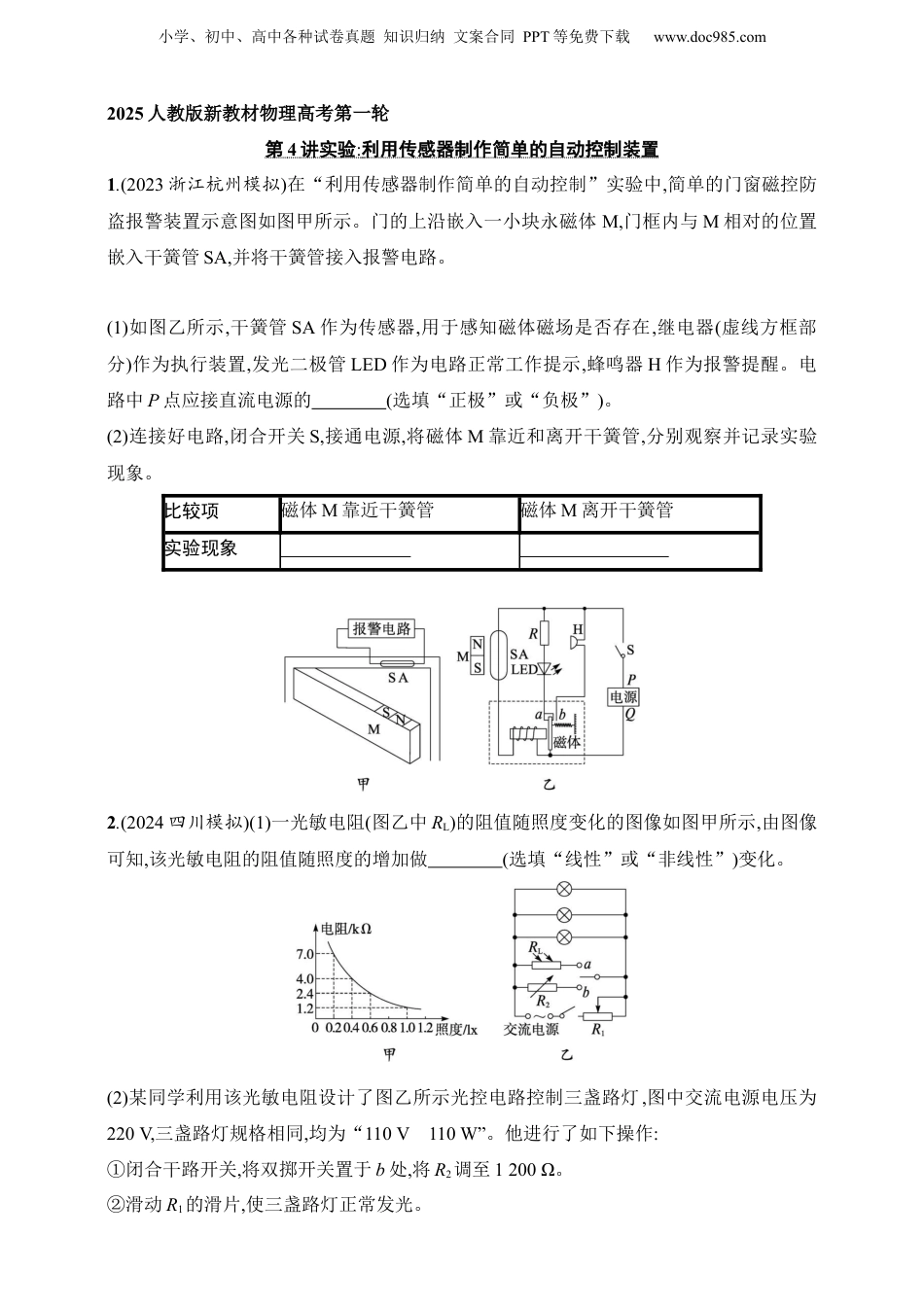 小学、初中、高中各种试卷真题知识归纳文案合同PPT等免费下载www.doc985.com2025人教版新教材物理高考第一轮第4讲实验:利用传感器制作简单的自动控制装置1.(2023浙江杭州模拟)在“利用传感器制作简单的自动控制”实验中,简单的门窗磁控防盗报警装置示意图如图甲所示。门的上沿嵌入一小块永磁体M,门框内与M相对的位置嵌入干簧管SA,并将干簧管接入报警电路。(1)如图乙所示,干簧管SA作为传感器,用于感知磁体磁场是否存在,继电器(虚线方框部分)作为执行装置,发光二极管LED作为电路正常工作提示,蜂鸣器H作为报警提醒。电路中P点应接直流电源的(选填“正极”或“负极”)。(2)连接好电路,闭合开关S,接通电源,将磁体M靠近和离开干簧管,分别观察并记录实验现象。比较项磁体M靠近干簧管磁体M离开干簧管实验现象2.(2024四川模拟)(1)一光敏电阻(图乙中RL)的阻值随照度变化的图像如图甲所示,由图像可知,该光敏电阻的阻值随照度的增加做(选填“线性”或“非线性”)变化。(2)某同学利用该光敏电阻设计了图乙所示光控电路控制三盏路灯,图中交流电源电压为220V,三盏路灯规格相同,均为“110V110W”。他进行了如下操作:①闭合干路开关,将双掷开关置于b处,将R2调至1200Ω。②滑动R1的滑片,使三盏路灯正常发光。小学、初中、高中各种试卷真题知识归纳文案合同PPT等免费下载www.doc985.com③将双掷开关置于a处。则当照度低到1.0lx(lx为照度的单位)时,路灯会正常发光。若有“50Ω5A”及“5kΩ1A”两个滑动变阻器可供选择,则图中R1应选择规格。安装该电路时,光敏电阻RL应(选填“远离”或“靠近”)路灯。(3)图乙所示光控电路的缺点较多,从节能和实际操作的角度分析均有不足,通过你的观察,请指出一种不足:(写出一条即可)。3.某同学利用热敏电阻自制了一个简易温度计,其内部电路装置如图甲所示,使用的器材有:直流电源(E=4.5V,内阻不计)、毫安表(量程未知)、电阻箱R(最大阻值为999.9Ω)、热敏电阻一个、开关S1和S2、导线若干。(1)为了确定毫安表的量程和内阻,先把电阻箱的阻值调到最大,然后将开关S2接至a端,闭合开关S1,逐渐调节电阻箱的阻值,发现当毫安表指针刚好偏转至满偏刻度的12处,电阻箱的示数如图乙所示,此时电阻箱的阻值R=Ω。将电阻箱的阻值调为540.0Ω时,毫安表指针刚好偏转至满偏刻度的34处,由此知毫安表的满偏电流Ig=mA,内阻Rg=Ω。(后两问计算结果均保留两位有效数字)(2)将开关S2接至b端,闭合开关S1,该温度计可开始工作,为了得到摄氏温度与电流之间的关系,该同学通过查阅资料,发现自己使用的热敏电阻为负温度系数热敏电阻,其阻值在测量范围(包括0℃)内随摄氏温度的降低而线性增加,比例系数为k(k<0),已知该电阻在0℃时的阻值为R0,则该简易温度计所测摄氏温度t与电流I之间满足t=(用E、k、R0、Rg、I表示)。4.(2023广东广州模拟)热敏电阻的阻值随温度变化的图像如图甲所示,用此热敏电阻和继电器组成的一简易温控开关如图乙所示,继电器的电阻为60Ω。当继电器电流超过10mA时,衔铁吸合,加热器停止加热,实现温控。为继电器线圈供电的电池E的内阻不计。图中的“电源”是恒温箱加热器的电源。小学、初中、高中各种试卷真题知识归纳文案合同PPT等免费下载www.doc985.com甲乙(1)提供以下实验器材:电源E1(3V),电源E2(6V),滑动变阻器R1(0~20Ω),滑动变阻器R2(0~220Ω),为使该装置实现对20~60℃之间任意温度的控制,电源应选(选填“E1”或“E2”);滑动变阻器应选(选填“R1”或“R2”)。(2)为了实现恒温箱系统保持温度为40℃,实验时进行了以下操作:①断开开关,滑动变阻器调节至(选填“最大”或“最小”),需将电阻箱调到一固定的阻值Ω;②将单刀双掷开关向c端闭合;③缓慢调节滑动变阻器的阻值观察到继电器的衔铁恰好被吸合;④保持滑动变阻器的位置不变,将单刀双掷开关向另一端闭合,恒温箱系统正常工作;(3)若恒温箱系统要保持温度为40℃,则需把滑动变阻器调节到Ω;若恒温箱系统要保持温度为35℃,则滑动变阻器正常工作时须向(选填“左”或“右”)移动滑片。5.(2024陕西高三校联考开学考试)某同学根据所学知识制作了一台简易电子秤,原理图如图甲所示,图中电压表可视为理想电压表(量程为0~3V),滑动变阻器的最大阻值为R=12...