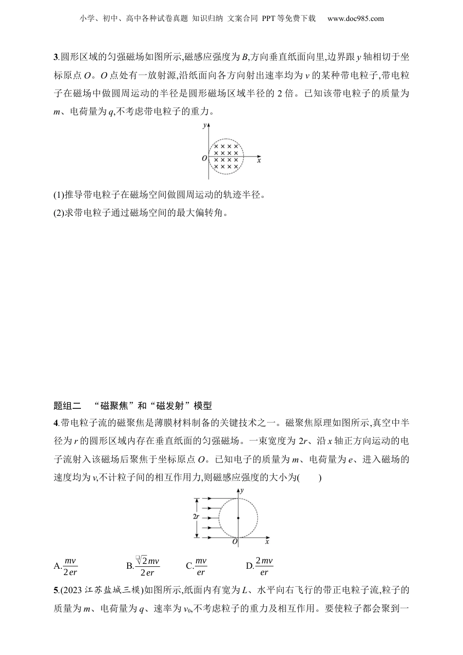 小学、初中、高中各种试卷真题知识归纳文案合同PPT等免费下载www.doc985.com2025人教版新教材物理高考第一轮第4讲专题提升:“平移圆”“放缩圆”“旋转圆”“磁聚焦”和“磁发散”模型基础对点练题组一“动态圆”模型1.(多选)利用如图所示装置可以选择一定速度范围内的带电粒子。图中板MN上方是磁感应强度大小为B、方向垂直纸面向里的匀强磁场,板上有两条宽度分别为2d和d的缝,两缝近端相距为L。一群质量为m、电荷量为q、速度不同的粒子,从宽度为2d的缝垂直于板MN进入磁场,不计粒子间的相互作用和重力,对于能够从宽度为d的缝射出的粒子,下列说法正确的是()A.射出粒子带正电B.射出粒子的最大速度为qB\(3d+L\)2mC.保持d和L不变,增大B,射出粒子的最大速度与最小速度之差增大D.保持d和B不变,增大L,射出粒子的最大速度与最小速度之差增大2.(2024广东梅州模拟)如图所示,正方形abcd内有一垂直纸面向里的匀强磁场(图中未画出),一束电子以不同的速度沿ab方向垂直磁场射入,形成从c点离开磁场区域和从d点离开磁场区域的甲、乙两种轨迹。设沿甲、乙轨迹运动的电子速度大小分别为v甲、v乙,在磁场中运动的时间分别为t甲、t乙,则()A.v甲=12v乙,t甲=t乙B.v甲=12v乙,t甲=12t乙C.v甲=2v乙,t甲=t乙D.v甲=2v乙,t甲=12t乙小学、初中、高中各种试卷真题知识归纳文案合同PPT等免费下载www.doc985.com3.圆形区域的匀强磁场如图所示,磁感应强度为B,方向垂直纸面向里,边界跟y轴相切于坐标原点O。O点处有一放射源,沿纸面向各方向射出速率均为v的某种带电粒子,带电粒子在磁场中做圆周运动的半径是圆形磁场区域半径的2倍。已知该带电粒子的质量为m、电荷量为q,不考虑带电粒子的重力。(1)推导带电粒子在磁场空间做圆周运动的轨迹半径。(2)求带电粒子通过磁场空间的最大偏转角。题组二“磁聚焦”和“磁发射”模型4.带电粒子流的磁聚焦是薄膜材料制备的关键技术之一。磁聚焦原理如图所示,真空中半径为r的圆形区域内存在垂直纸面的匀强磁场。一束宽度为2r、沿x轴正方向运动的电子流射入该磁场后聚焦于坐标原点O。已知电子的质量为m、电荷量为e、进入磁场的速度均为v,不计粒子间的相互作用力,则磁感应强度的大小为()A.mv2erB.❑√2mv2erC.mverD.2mver5.(2023江苏盐城三模)如图所示,纸面内有宽为L、水平向右飞行的带正电粒子流,粒子的质量为m、电荷量为q、速率为v0,不考虑粒子的重力及相互作用。要使粒子都会聚到一小学、初中、高中各种试卷真题知识归纳文案合同PPT等免费下载www.doc985.com点,可以在粒子流的右侧虚线框内设计一匀强磁场区域,设B0=mv0qL。选项A、B、C中的曲线均为半径是L的四分之一圆弧,其中A、B的磁感应强度B=B0,C的磁感应强度B=2B0;选项D中曲线是直径为L的圆,磁感应强度B=B0。则磁场区域的形状及对应的磁感应强度可能是()6.(多选)如图所示,坐标原点O处有一粒子源,能向坐标平面一、二象限内发射大量质量为m、电荷量为q的带正电粒子(不计重力),所有粒子速度大小相等。圆心在(0,R)、半径为R的圆形区域内,有垂直于坐标平面向外的匀强磁场,磁感应强度为B,磁场右侧有一长度为R且平行于y轴的荧光屏,其中心O1位于(2R,R)。已知初速度沿y轴正向的粒子经过磁场后,恰能垂直射在光屏上,则下列说法正确的是()A.所有粒子的初速度大小为qBRmB.从O点发射的所有粒子都能垂直射在光屏上C.能射在光屏上的粒子,在磁场中运动时间最长为πmqBD.能射在光屏上的粒子初速度方向与x轴夹角满足60°≤θ≤120°综合提升练7.(多选)(2024四川绵阳模拟)如图所示,在PQ之间有水平向右的匀强电场,在QM之间的两个半径为R的圆形内(不包含边界)存在方向相反的圆形磁场,两个圆形磁场相切且与边界Q也相切,磁感应强度均为B,在两个圆形磁场右边并与圆形磁场相切有一个足够大的挡板。在下边圆形磁场的最低点A处有一个粒子源可以在平面内向磁场内各个方向发射速率为qBRm、电荷量为q、质量为m的带正电粒子,PQ之间的距离为2R,电场强度为小学、初中、高中各种试卷真题知识归纳文案合同PPT等免费下载www.doc985.comqB2R2m,不计粒子的重力和粒子间的相互作用力,粒子不发生碰撞,下列说法正确的是()A.粒子速度减到零时刚好运动到电场左边界PB.粒子水平向左...
