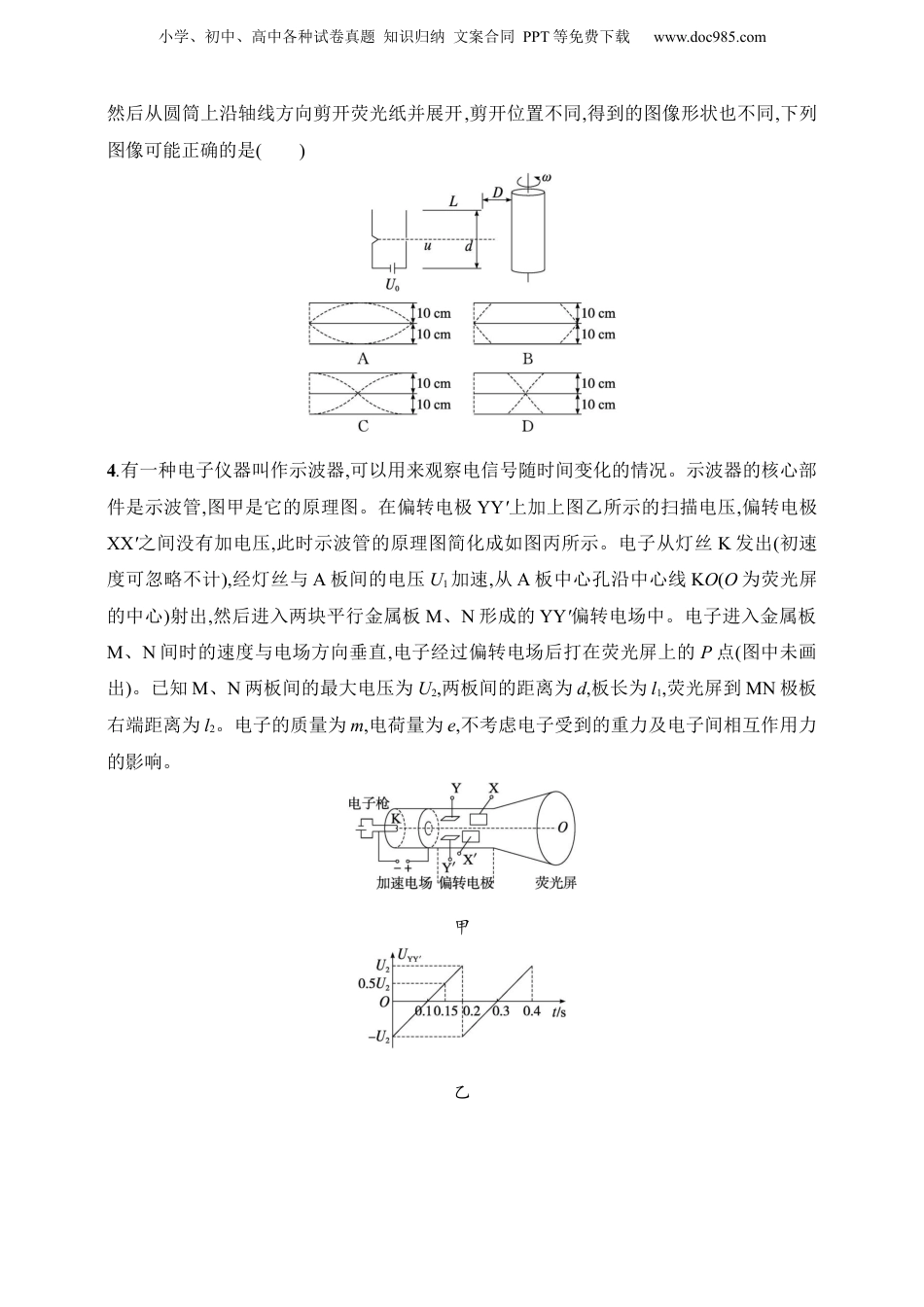 小学、初中、高中各种试卷真题知识归纳文案合同PPT等免费下载www.doc985.com2025人教版新教材物理高考第一轮第5讲专题提升:带电粒子在电场中运动的综合问题基础对点练题组一等效法在电场中的应用1.(多选)(2022全国甲卷)地面上方某区域存在方向水平向右的匀强电场,将一带正电荷的小球自电场中P点水平向左射出。小球所受的重力和静电力的大小相等,重力势能和电势能的零点均取在P点。则射出后,()A.小球的动能最小时,其电势能最大B.小球的动能等于初始动能时,其电势能最大C.小球速度的水平分量和竖直分量大小相等时,其动能最大D.从射出时刻到小球速度的水平分量为零时,重力做的功等于小球电势能的增加量2.(多选)(2024安徽安庆模拟)如图所示,AC是圆O的一条水平直径,BD是竖直方向的另外一条直径,M点是圆上的点,OM连线与OC的夹角为60°,该圆处于方向与圆面平行的匀强电场中。将电荷量为q、质量为m的带正电油滴从圆心O点以相同的初动能Ek0射出,射出方向不同时,油滴可以经过圆周上的所有点。在这些点中,经过C点时油滴的动能最小且为Ek04,已知重力加速度的大小为g,匀强电场的电场强度E=2mgq,则()A.电场线与MO垂直且B点电势高于C点电势B.油滴经过B点时的动能为4-❑√34Ek0C.油滴经过A点时的动能为74Ek0D.油滴经过CD连线中点时的动能为58Ek0题组二带电粒子在交变电场中的运动3.(多选)(2023浙江三模)如图所示,电子枪产生初速度为零的电子经过U0=100V的电场加速,沿中间进入平行板电容器,板间电压u=400sin2πtV,板长L和板间距离d均为10cm,距板右侧D=5cm处有一竖直圆筒,圆筒外侧粘贴涂有感光材料的荧光纸,圆筒以角速度ω=4πrad/s转动,不计电子通过平行板时极板上电压的变化,电子打到荧光纸上留下印迹,小学、初中、高中各种试卷真题知识归纳文案合同PPT等免费下载www.doc985.com然后从圆筒上沿轴线方向剪开荧光纸并展开,剪开位置不同,得到的图像形状也不同,下列图像可能正确的是()4.有一种电子仪器叫作示波器,可以用来观察电信号随时间变化的情况。示波器的核心部件是示波管,图甲是它的原理图。在偏转电极YY'上加上图乙所示的扫描电压,偏转电极XX'之间没有加电压,此时示波管的原理图简化成如图丙所示。电子从灯丝K发出(初速度可忽略不计),经灯丝与A板间的电压U1加速,从A板中心孔沿中心线KO(O为荧光屏的中心)射出,然后进入两块平行金属板M、N形成的YY'偏转电场中。电子进入金属板M、N间时的速度与电场方向垂直,电子经过偏转电场后打在荧光屏上的P点(图中未画出)。已知M、N两板间的最大电压为U2,两板间的距离为d,板长为l1,荧光屏到MN极板右端距离为l2。电子的质量为m,电荷量为e,不考虑电子受到的重力及电子间相互作用力的影响。甲乙小学、初中、高中各种试卷真题知识归纳文案合同PPT等免费下载www.doc985.com丙(1)求电子穿过A板时的速度大小。(2)每个电子穿过偏转电场的时间极短,可以认为这个过程中两极板间的电压是不变的,偏转电场可看作匀强电场。在t=0.15s时刻进入偏转电场的电子打在屏上P位置,求OP长。(3)分析物理量的数量级,是解决物理问题的常用方法。在解决第(2)问时忽略了每个电子穿过电场过程中两极板间电压的变化,请结合下列数据分析说明其原因。已知l1=4.0×10-2m,电子的比荷em=1.76×1011C/kg,U1=1375V。题组三电场中的力电综合问题5.(多选)如图所示,光滑绝缘水平地面上有一水平绝缘轻弹簧左端固定,右端与一质量为m、电荷量为+q(q>0)的滑块P(可视作质点)连接,沿水平方向建立x轴,沿x轴加一水平方向电场(图中未画出),x轴上的电势φ随位置x的变化关系如图所示。滑块从弹簧原长处静止释放(未超出弹性限度),沿x轴正方向运动直至速度为零的过程中()小学、初中、高中各种试卷真题知识归纳文案合同PPT等免费下载www.doc985.comA.电场的电势越来越低,电场强度越来越小B.滑块的加速度先增大后减小C.当滑块的速度最大时,弹簧弹性势能与滑块动能之和最大D.滑块克服弹力做的功等于电势能的减少量6.(多选)(2022海南卷)如图甲所示,带正电3×10-5C的物块A放在水平桌面上,利用细绳通过光滑的滑轮与物块B相连,A处在匀强电场中,E=4×105N/C,从O开始,A与桌面的动摩擦因数μ随x的变化如图乙所示,取O点电势能为...
