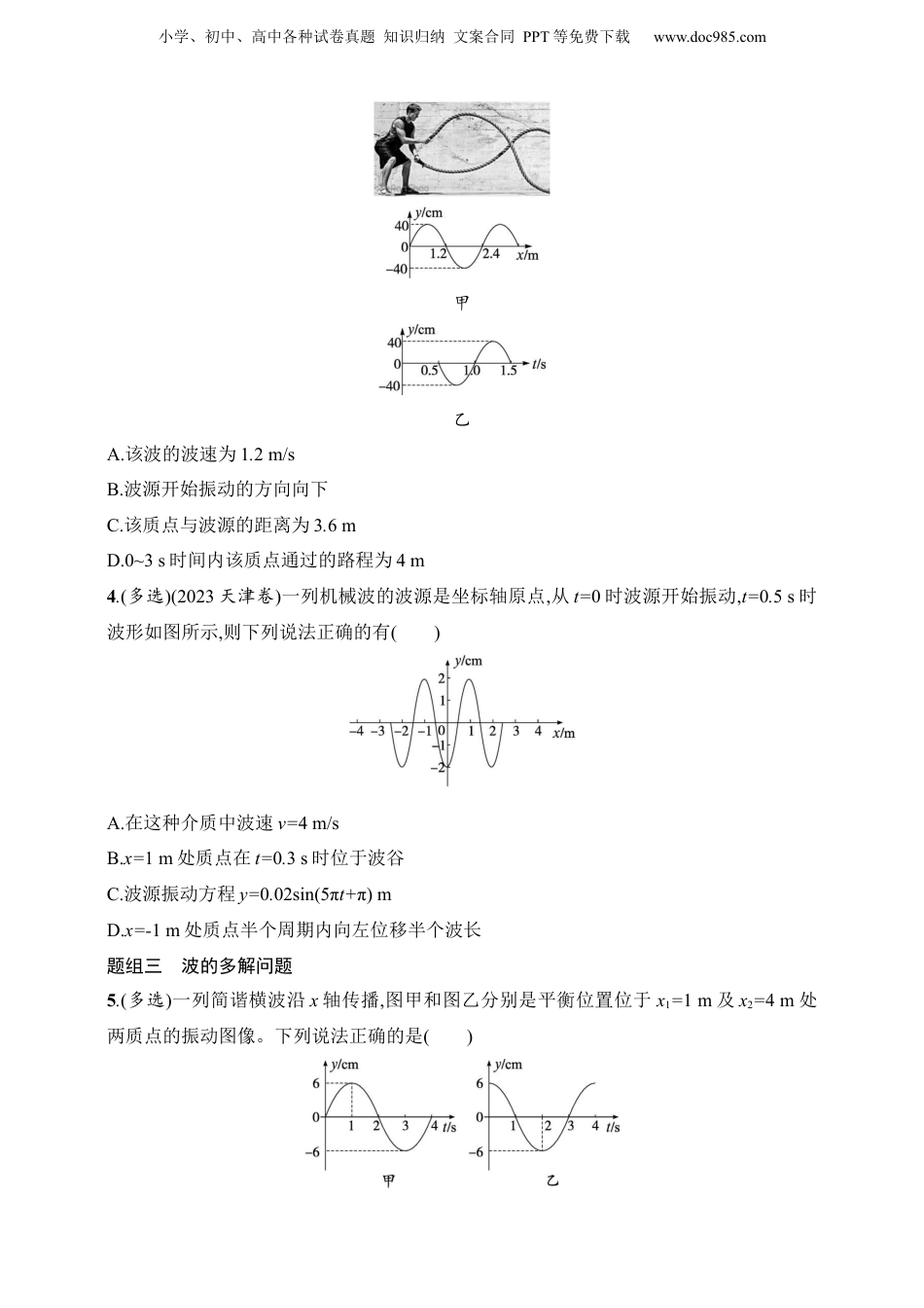 小学、初中、高中各种试卷真题知识归纳文案合同PPT等免费下载www.doc985.com2025人教版新教材物理高考第一轮第3讲机械波基础对点练题组一波的传播与图像1.(2023北京卷)位于坐标原点处的波源发出一列沿x轴正方向传播的简谐横波。t=0时波源开始振动,其位移y随时间t变化的关系式为y=Asin2πTt,则t=T时的波形图为()2.(多选)如图所示,左边为竖直弹簧振动系统,小球连接一根水平的很长的轻软绳,沿绳方向取x轴。小球从平衡位置O以某一初速度开始做简谐运动,经t=1s,x=5cm处的绳开始振动,则下列说法正确的是()A.此绳波的周期为4sB.绳上产生的波的传播速度与弹簧振子振动的频率无关C.绳上各质点都沿x轴方向运动,因此绳波为横波D.若小球振动频率f=10Hz,则绳波波长为0.5cm题组二波的图像与振动图像的关联应用3.(多选)战绳运动是健身房设计用来减脂的一项爆发性运动,人们在做战绳运动时,用手抓紧绳子,做出甩绳子的动作,使得绳子呈波浪状向前推进,形成横波(可视为简谐横波)。t=3s时波形如图甲所示,图乙是绳上某质点的振动图像,下列说法正确的是()小学、初中、高中各种试卷真题知识归纳文案合同PPT等免费下载www.doc985.com甲乙A.该波的波速为1.2m/sB.波源开始振动的方向向下C.该质点与波源的距离为3.6mD.0~3s时间内该质点通过的路程为4m4.(多选)(2023天津卷)一列机械波的波源是坐标轴原点,从t=0时波源开始振动,t=0.5s时波形如图所示,则下列说法正确的有()A.在这种介质中波速v=4m/sB.x=1m处质点在t=0.3s时位于波谷C.波源振动方程y=0.02sin(5πt+π)mD.x=-1m处质点半个周期内向左位移半个波长题组三波的多解问题5.(多选)一列简谐横波沿x轴传播,图甲和图乙分别是平衡位置位于x1=1m及x2=4m处两质点的振动图像。下列说法正确的是()小学、初中、高中各种试卷真题知识归纳文案合同PPT等免费下载www.doc985.comA.波长可能为3mB.波长可能为125mC.波速可能为37m/sD.波速可能为65m/s6.(多选)沿x轴传播的简谐横波在t1=0时刻的波形如图中实线所示,在t2=0.4s时刻的波形如图中虚线所示。已知波的周期0.2s<T<0.4s,P为波中的一个振动质点。则下列说法正确的是()A.波的传播速度可能为20m/sB.在t3=0.6s时刻,质点P的振动方向一定向下C.在t3=0.6s时刻,质点P的加速度方向一定向上D.质点P在2.4s内运动的路程可能为96cm题组四波的衍射、干涉和多普勒效应7.(2024江苏南京模拟)超声波是一种频率高于20000Hz的声波,波长很短,广泛应用于生活与生产实践。关于超声波及应用,下列说法正确的是()A.在同种介质中,超声波的速度大于次声波的速度B.超声波的频率越高,衍射本领越强C.高速公路上的测速仪发出超声波波长大于所接收波的波长,说明此时车正在靠近测速仪D.“彩超”检查身体时,超声波迎着血液流动方向发射,仪器接收到的反射回来的波的频率低于其发射的超声波的频率8.(多选)(2023福建福州模拟)两列频率相同、振幅分别为5cm和7cm的横波发生干涉时,某一时刻的图样如图所示,实线表示波峰,虚线表示波谷,下列关于K、M、N三点的说法正确的是()A.质点K为振动减弱点B.经过一段时间,质点M、N的位移大小可能相等C.质点N的振幅为2cm小学、初中、高中各种试卷真题知识归纳文案合同PPT等免费下载www.doc985.comD.由图中时刻再经过14周期时,质点M的位移为零综合提升练9.(2023湖南卷)如图甲所示,在均匀介质中有A、B、C和D四点,其中A、B、C三点位于同一直线上,AC=BC=4m,DC=3m,DC垂直AB。t=0时,位于A、B、C处的三个完全相同的横波波源同时开始振动,振动图像均如图乙所示,振动方向与平面ABD垂直,已知波长为4m。下列说法正确的是()甲乙A.这三列波的波速均为2m/sB.t=2s时,D处的质点开始振动C.t=4.5s时,D处的质点向y轴负方向运动D.t=6s时,D处的质点与平衡位置的距离是6cm10.(多选)如图甲所示,一列简谐横波沿x轴传播,实线和虚线分别为t1时刻和t2时刻的波形图,其中t2>t1,P、Q分别是平衡位置为x1=1.0m和x2=4.0m的两质点。图乙为质点Q的振动图像,下列说法正确的是()A.t2-t1可能等于0.35sB.t1时刻质点Q的加速度达到最大C.简谐横波沿x轴传播的速度大小为40m/sD.t1到t2时间内,质点P随波向右移动了3m小学、初中、高中各种试卷真题知识归纳文案合同PPT等免费下载...