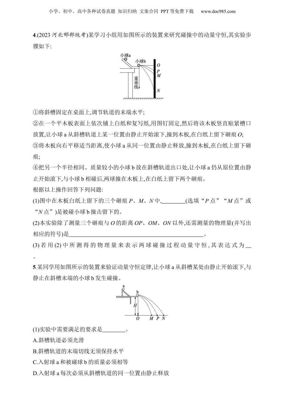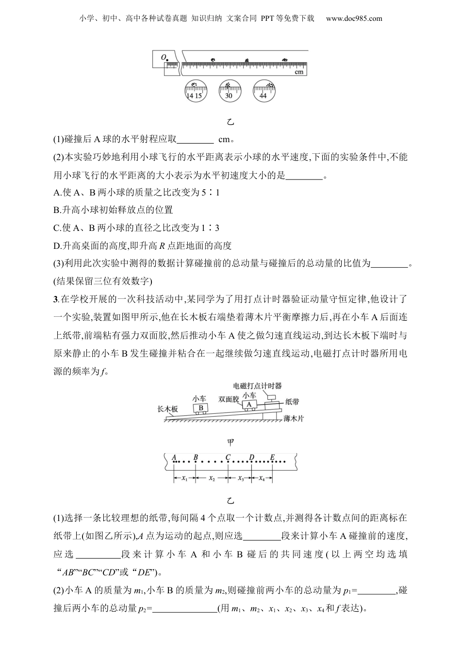 小学、初中、高中各种试卷真题知识归纳文案合同PPT等免费下载www.doc985.com2025人教版新教材物理高考第一轮第6讲实验:验证动量守恒定律1.“探究碰撞中的不变量”的实验装置如图所示,阻力很小的滑轨上有两辆小车A、B,给小车A一定速度去碰撞静止的小车B,小车A、B碰撞前后的速度大小可由速度传感器测得。(1)实验应进行的操作有。A.测量滑轨的长度B.测量小车的长度和高度C.碰撞前将滑轨调成水平(2)下表是某次实验时测得的数据:A的质量/kgB的质量/kg碰撞前A的速度大小/(m·s-1)碰撞后A的速度大小/(m·s-1)碰撞后B的速度大小/(m·s-1)0.2000.3001.0100.2000.800由表中数据可知,碰撞后小车A、B所构成系统的总动量大小是kg·m/s。(结果保留3位有效数字)2.用如图甲所示的装置,来验证碰撞过程中的动量守恒。图中PQ是斜槽,QR为水平槽。O点是水平槽末端R在记录纸上的垂直投影点,A、B两球的质量之比mA∶mB=3∶1。先使A球从斜槽上某一高度处由静止释放,在水平地面的记录纸上留下落点痕迹P,重复10次,得到10个落点。再把B球放在水平槽上的末端R处,让A球仍从同一高度处由静止释放,与B球碰撞,碰后A、B球分别在记录纸上留下各自的落点痕迹,重复10次。A、B两球在记录纸上留下的落点痕迹如图乙所示,其中刻度尺的零点与O点对齐。甲小学、初中、高中各种试卷真题知识归纳文案合同PPT等免费下载www.doc985.com乙(1)碰撞后A球的水平射程应取cm。(2)本实验巧妙地利用小球飞行的水平距离表示小球的水平速度,下面的实验条件中,不能用小球飞行的水平距离的大小表示为水平初速度大小的是。A.使A、B两小球的质量之比改变为5∶1B.升高小球初始释放点的位置C.使A、B两小球的直径之比改变为1∶3D.升高桌面的高度,即升高R点距地面的高度(3)利用此次实验中测得的数据计算碰撞前的总动量与碰撞后的总动量的比值为。(结果保留三位有效数字)3.在学校开展的一次科技活动中,某同学为了用打点计时器验证动量守恒定律,他设计了一个实验,装置如图甲所示,他在长木板右端垫着薄木片平衡摩擦力后,再在小车A后面连上纸带,前端粘有强力双面胶,然后推动小车A使之做匀速直线运动,到达长木板下端时与原来静止的小车B发生碰撞并粘合在一起继续做匀速直线运动,电磁打点计时器所用电源的频率为f。甲乙(1)选择一条比较理想的纸带,每间隔4个点取一个计数点,并测得各计数点间的距离标在纸带上(如图乙所示),A点为运动的起点,则应选段来计算小车A碰撞前的速度,应选段来计算小车A和小车B碰后的共同速度(以上两空均选填“AB”“BC”“CD”或“DE”)。(2)小车A的质量为m1,小车B的质量为m2,则碰撞前两小车的总动量为p1=,碰撞后两小车的总动量p2=(用m1、m2、x1、x2、x3、x4和f表达)。小学、初中、高中各种试卷真题知识归纳文案合同PPT等免费下载www.doc985.com4.(2023河北邯郸统考)某学习小组用如图所示的装置来研究碰撞中的动量守恒,其实验步骤如下:①将斜槽固定在桌面上,调节轨道的末端水平;②在一个平木板表面上依次铺上白纸和复写纸,用图钉固定,然后将该木板竖直贴紧槽口放置,让小球a从斜槽轨道上某一位置由静止开始滚下,撞到木板,在白纸上留下砸痕O;③将木板向右平移适当距离,使小球a从同一位置由静止释放,撞到木板,在白纸上留下砸痕;④把另一个半径相同、质量较小的小球b放在斜槽轨道出口处,让小球a仍从原位置由静止开始滚下,与小球b相碰后,两球撞在木板上,在白纸上留下两个砸痕。根据以上操作回答下列问题:(1)图中在木板白纸上留下的三个砸痕P、M、N中,(选填“P点”“M点”或“N点”)是被碰小球b撞击留下的。(2)本实验除了测量三个砸痕与O的距离OP、OM、ON以外,还需测量的物理量(并写出相应的符号)是。(3)若用(2)中所测得的物理量来表示两球碰撞过程动量守恒,其表达式为。5.某同学用如图所示的装置来验证动量守恒定律,让小球a从斜槽某处由静止开始滚下,与静止在斜槽末端的小球b发生碰撞。(1)实验中需要满足的要求是。A.斜槽轨道必须光滑B.斜槽轨道的末端切线无须保持水平C.入射球a和被碰球b的质量必须相等D.入射球a每次必须从斜槽轨道的同一位置由静止释放小学、初中、高中各种试卷真题知识归纳文案合同PPT等免费下载www.doc985.com(2)本实验...