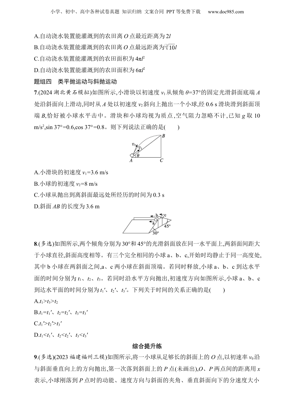 小学、初中、高中各种试卷真题知识归纳文案合同PPT等免费下载www.doc985.com2025人教版新教材物理高考第一轮第2讲抛体运动基础对点练题组一平抛运动规律的应用1.(2023全国甲卷)一同学将铅球水平推出,不计空气阻力和转动的影响,铅球在平抛运动过程中()A.机械能一直增加B.加速度保持不变C.速度大小保持不变D.被推出后瞬间动能最大2.(2024江苏无锡模拟)某人在河谷边以一定初速度水平抛出一小石块,抛出的小石块可以落在抛出点左侧的任何位置,其简化模型如图所示,下列说法正确的是()A.初速度越大,小石块落地时间越长B.初速度越大,小石块落地时间越短C.以不同的初速度水平抛出,小石块落地速度与水平方向的夹角可能相同D.初速度越大,小石块落地速度与水平方向的夹角越小题组二落点有约束条件的平抛运动3.跳台滑雪是一项勇敢者的运动,某运动员从跳台A处沿水平方向飞出,在斜面AB上的B处着陆,斜面AB与水平方向夹角为30°且足够长,不计空气阻力,下列说法正确的是()A.运动员在空中相同时间内的速度变化相同B.运动员在斜面上的落点到A点的距离与初速度成正比C.运动员落在B处的速度与水平方向夹角为60°D.运动员的质量越大,落点离A越远4.(多选)A、D分别是斜面的顶端和底端,B、C是斜面上的两个点,lAB=lBC=lCD,E点在D点的正上方,与A等高。从E点以一定的水平速度抛出质量相等的两个小球,球1落在B点,小学、初中、高中各种试卷真题知识归纳文案合同PPT等免费下载www.doc985.com球2落在C点,关于球1和球2从抛出到落在斜面上的运动过程,下列说法正确的是()A.球1和球2运动的时间之比为2∶1B.球1和球2动能增加量之比为1∶2C.球1和球2抛出时初速度之比为2❑√2∶1D.球1和球2运动时的加速度之比为1∶2题组三平抛运动中的临界、极值问题5.(2023广东江门一模)如图所示,正方体空间图形ABCD-A1B1C1D1的边长为1m,其下表面在水平地面上,将可视为质点的小球从顶点A在∠BAD所在范围内(包括边界)分别沿不同的水平方向抛出,落点都在A1B1C1D1平面范围内(包括边界)。不计空气阻力,g取10m/s2,则()A.小球落在B1点时,初速度为❑√10m/s,是抛出速度的最小值B.小球落在C1点时,初速度为❑√5m/s,是抛出速度的最大值C.落在B1D1线段上的小球,平抛时初速度的最小值与最大值之比是1∶2D.落在B1D1线段上的小球,平抛时初速度的最小值与最大值之比是1∶❑√26.(2023浙江绍兴联考)某农场安装的一种自动浇水装置可以简化为如图所示的模型。农田中央O点处装有高度为h的竖直细水管,其上端安装有长度为l的水平喷水嘴。水平喷水嘴可以绕轴转动,角速度为ω=❑√g2ℎ,出水速度v0可调节,其调节范围满足ωl≤v0≤2ωl,重力加速度大小为g,忽略空气阻力。则下列说法正确的是()小学、初中、高中各种试卷真题知识归纳文案合同PPT等免费下载www.doc985.comA.自动浇水装置能灌溉到的农田离O点最近距离为2lB.自动浇水装置能灌溉到的农田离O点最远距离为❑√10lC.自动浇水装置能灌溉到的农田面积为4πl2D.自动浇水装置能灌溉到的农田面积为6πl2题组四类平抛运动与斜抛运动7.(2024湖北黄石模拟)如图所示,小滑块以初速度v1从倾角θ=37°的固定光滑斜面底端A处沿斜面向上滑动,同时从A处以初速度v2斜向上抛出一个小球,经0.6s滑块滑到斜面顶端B,恰好被小球水平击中。滑块和小球均视为质点,空气阻力忽略不计,已知g取10m/s2,sin37°=0.6,cos37°=0.8。则下列说法正确的是()A.小滑块的初速度v1=3.6m/sB.小球的初速度v2=8m/sC.小球从抛出到离斜面最远处所经历的时间为0.3sD.斜面AB的长度为3.6m8.(多选)如图所示,两个倾角分别为30°和45°的光滑斜面放在同一水平面上,两斜面间距大于小球直径,斜面高度相等。有三个完全相同的小球a、b、c,开始时均静止于同一高度处,其中b小球在两斜面之间,a、c两小球在斜面顶端。若同时释放,小球a、b、c到达水平面的时间分别为t1、t2、t3。若同时沿水平方向抛出,初速度方向如图所示,小球a、b、c到达水平面的时间分别为t1'、t2'、t3'。下列关于时间的关系正确的是()A.t1>t3>t2B.t1=t1'、t2=t2'、t3=t3'C.t1'>t2'>t3'D.t1<t1'、t2<t2'、t3<t3'综合提升练9.(多选)(2023福建福州三模)如图所示,将一小球从足够长的斜面上的O点,以初速率v0...