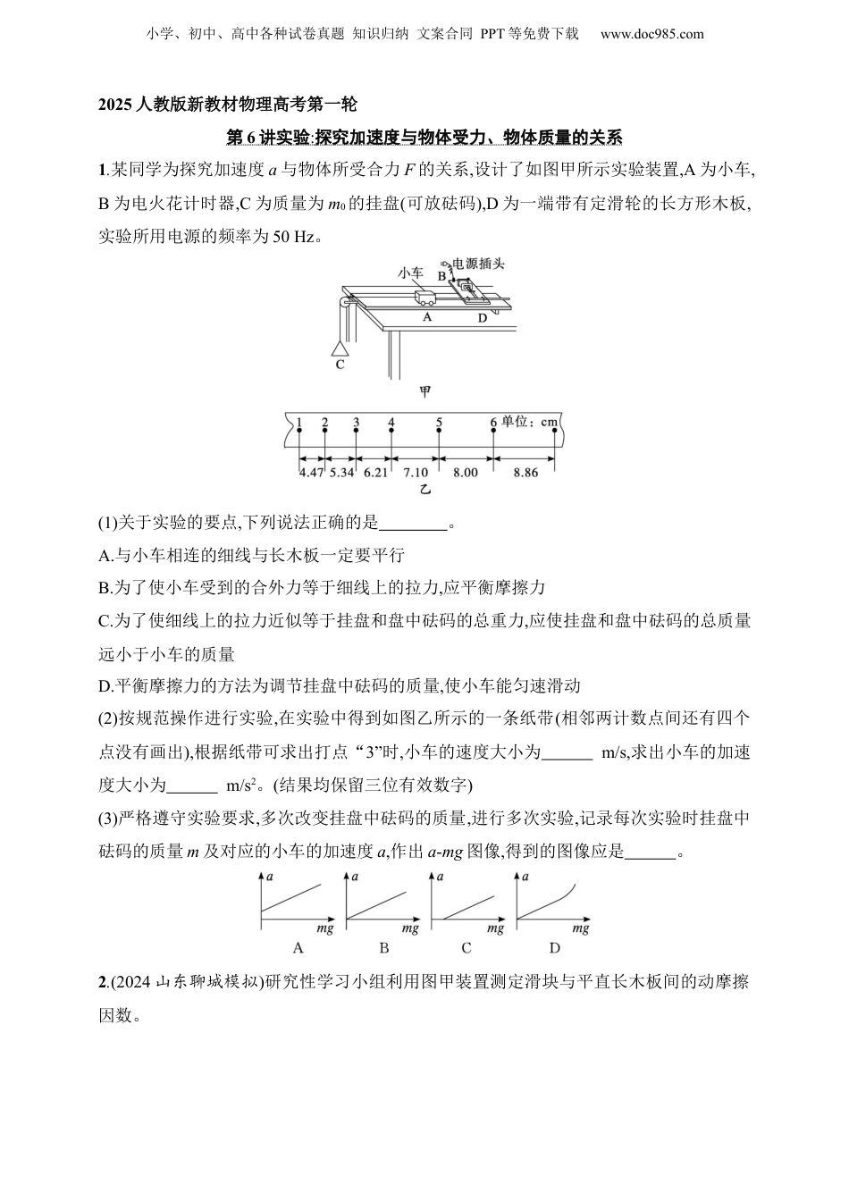 小学、初中、高中各种试卷真题知识归纳文案合同PPT等免费下载www.doc985.com2025人教版新教材物理高考第一轮第6讲实验:探究加速度与物体受力、物体质量的关系1.某同学为探究加速度a与物体所受合力F的关系,设计了如图甲所示实验装置,A为小车,B为电火花计时器,C为质量为m0的挂盘(可放砝码),D为一端带有定滑轮的长方形木板,实验所用电源的频率为50Hz。(1)关于实验的要点,下列说法正确的是。A.与小车相连的细线与长木板一定要平行B.为了使小车受到的合外力等于细线上的拉力,应平衡摩擦力C.为了使细线上的拉力近似等于挂盘和盘中砝码的总重力,应使挂盘和盘中砝码的总质量远小于小车的质量D.平衡摩擦力的方法为调节挂盘中砝码的质量,使小车能匀速滑动(2)按规范操作进行实验,在实验中得到如图乙所示的一条纸带(相邻两计数点间还有四个点没有画出),根据纸带可求出打点“3”时,小车的速度大小为m/s,求出小车的加速度大小为m/s2。(结果均保留三位有效数字)(3)严格遵守实验要求,多次改变挂盘中砝码的质量,进行多次实验,记录每次实验时挂盘中砝码的质量m及对应的小车的加速度a,作出a-mg图像,得到的图像应是。2.(2024山东聊城模拟)研究性学习小组利用图甲装置测定滑块与平直长木板间的动摩擦因数。小学、初中、高中各种试卷真题知识归纳文案合同PPT等免费下载www.doc985.com(1)实验过程如下:①将长木板固定在水平桌面上,其右端安装定滑轮,左端固定位移传感器;总质量为m0的滑块(含拉力传感器)在长木板上紧靠位移传感器放置,拉力传感器通过细绳跨过定滑轮与质量为m的重物连接,调节长木板右端定滑轮使细绳与长木板平行;②由静止释放滑块,记录拉力传感器和位移传感器的数据,用计算机拟合得到滑块位移x随时间t变化的图像如图乙所示,该图线的函数表达式是x=0.60t2(m),可得滑块加速度a=m/s2(计算结果保留三位有效数字)。(2)当滑块的加速度为a时,拉力传感器示数为F,则滑块与长木板间的动摩擦因数μ=(用F、m0、m、a表示)。(3)本实验中(选填“需要”或“不需要”)满足滑块质量远大于重物质量。3.某探究学习小组的同学用如图甲所示装置测量滑块和木板间的动摩擦因数。装置由弹簧测力计、两个光电门、滑块、长木板和砝码盘(含砝码)等组成。光电门可以测出滑块上的遮光条依次通过两个光电门的时间Δt1、Δt2,游标卡尺测出遮光条的宽度d,导轨标尺可以测出两个光电门间的距离L,不计滑轮的质量和摩擦。(1)测量d时,游标卡尺的示数如图乙所示,则遮光条的宽度为cm。小学、初中、高中各种试卷真题知识归纳文案合同PPT等免费下载www.doc985.com(2)改变砝码盘中的砝码,记录弹簧测力计的示数F和用所测数据求出滑块对应的加速度a。以弹簧测力计的示数F为横坐标,加速度a为纵坐标,画出的a-F图像是一条直线,直线与横坐标的截距为b,直线的斜率为k,重力加速度为g。则滑块与木板间的动摩擦因数可表示为(用b、k、g表示)。(3)如果换成表面更加粗糙的木板重新进行实验,则得到的a-F图像的斜率k将(选填“变大”“变小”或“不变”)。4.(2023湖北卷)某同学利用测质量的小型家用电子秤,设计了测量木块和木板间动摩擦因数μ的实验。如图甲所示,木板和木块A放在水平桌面上,电子秤放在水平地面上,木块A和放在电子秤上的重物B通过跨过定滑轮的轻绳相连。调节滑轮,使其与木块A间的轻绳水平,与重物B间的轻绳竖直。在木块A上放置n(n=0,1,2,3,4,5)个砝码(电子秤称得每个砝码的质量m0为20.0g),向左拉动木板的同时,记录电子秤的对应示数m。(1)实验中,拉动木板时(选填“必须”或“不必”)保持匀速。(2)用mA和mB分别表示木块A和重物B的质量,则m和mA、mB、m0、μ、n所满足的关系式为m=。(3)根据测量数据在坐标纸上绘制出m-n图像,如图乙所示,可得木块A和木板间的动摩擦因数μ=。(保留2位有效数字)5.(2023山东烟台一模)某实验兴趣小组利用如图甲所示装置做探究加速度与力的关系的实验时,实验操作如下:小学、初中、高中各种试卷真题知识归纳文案合同PPT等免费下载www.doc985.com甲①挂上托盘和砝码,调整木板的倾角,使质量为m0的小车沿木板匀速下滑;②取下托盘和砝码,测出其总质量为m,让小车沿木板下滑。设小车受到的合外力为F,通过计算机可得到小车与位...
