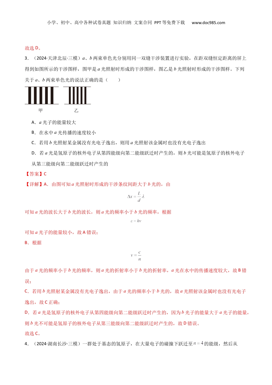 小学、初中、高中各种试卷真题知识归纳文案合同PPT等免费下载www.doc985.com专题突破卷19近代物理专题(光电效应的规律以及方程的应用、氢原子能级跃迁、核反应方程与核能的计算)60分钟考点考向题型分布近代物理专题(光电效应的规律以及方程的应用、氢原子能级跃迁、核反应方程与核能的计算)考向1:光电效应的规律和方程的应用考向2:氢原子能级跃迁考向3:原子核的衰变、半衰期考向4:核反应类型以及核反应方程考向5:核力与核能的计算考向6:光的波粒二象性、物质波17单选+3多选近代物理专题(光电效应的规律以及方程的应用、氢原子能级跃迁、核反应方程与核能的计算)(17单选+3多选)1.(2024·广西玉林·模拟预测)关于对黑体的认识,下列说法正确的是()A.黑体只吸收电磁波,不反射电磁波,看上去是黑的B.科学家在研究黑体辐射的实验规律时发现,随着温度的升高,各种波长的辐射强度都有增加,另一方面,辐射强度的极大值向波长较短的方向移动C.爱因斯坦的光电效应方程成功地解释了黑体辐射的实验规律D.黑体辐射电磁波的强度按波长的分布除与温度有关外,还与材料的种类及表面状况有关【答案】B【详解】A.黑体只吸收电磁波,不反射电磁波,但是黑体能够自身辐射电磁波,可知,黑体不一定是黑的,故A错误;小学、初中、高中各种试卷真题知识归纳文案合同PPT等免费下载www.doc985.comB.科学家在研究黑体辐射的实验规律时发现,随着温度的升高,各种波长的辐射强度都有增加,另一方面,辐射强度的极大值向波长较短的方向移动,故B正确;C.普朗克提出能量子概念,成功地解释了黑体辐射的实验规律,故C错误;D.黑体辐射电磁波的强度按波长的分布只与黑体的温度有关,与材料的种类及表面状况无关,故D错误。故选B。2.(2024·天津滨海新·三模)如图所示,氢原子从能级跃迁到能级发出a种光,氢原子从能级跃迁到能级发出b种光。关于这两种光的特性,以下说法中正确的是()A.在真空中传播同样的距离,b光所用时间更长B.从水中斜射入空气时,b光更容易发生全反射C.照射同样的金属板发生光电效应时,b光的遏止电压更大D.在条件相同的情况下做杨氏干涉实验,b光的条纹间距更宽【答案】D【详解】A.真空中各种光传播速度相同,所以在真空中传播同样的距离,两种光所用时间相同,故A错误;B.根据氢原子能级差可知b光能量小,所以频率小,折射率小,从水中斜射入空气时,b光不容易发生全反射,故B错误;C.照射同样的金属板发生光电效应时,根据爱因斯坦光电效应方程,可知a光的遏止电压更大,故C错误;D.因为b光的频率小,波长大,所以在条件相同的情况下做杨氏干涉实验Δx=Ldλb光的条纹间距更宽,故D正确。小学、初中、高中各种试卷真题知识归纳文案合同PPT等免费下载www.doc985.com故选D。3.(2024·天津北辰·三模)a、b两束单色光分别用同一双缝干涉装置进行实验,在距双缝恒定距离的屏上得到如图所示的干涉图样,图甲是a光照射时形成的干涉图样,图乙是b光照射时形成的干涉图样。下列关于a、b两束单色光的说法正确的是()A.a光子的能量较大B.在水中a光传播的速度较小C.若用b光照射某金属没有光电子逸出,则用a光照射该金属时也没有光电子逸出D.若a光是氢原子的核外电子从第四能级向第二能级跃迁时产生的,则b光可能是氢原子的核外电子从第三能级向第二能级跃迁时产生的【答案】C【详解】A.由图可知a光照射时形成的干涉条纹间距大于b光的,由可知a光的波长大于b光的波长,则a光的频率小于b光的频率,根据可知a光子的能量较小,故A错误;B.根据由于a光的频率小于b光的频率,则a光的折射率小于b光的折射率,a光在水中的传播速度较大,故B错误;C.若用b光照射某金属没有光电子逸出,由于a光的频率小于b光的,故a光照射该金属时也没有光电子逸出,故C正确;D.若a光是氢原子的核外电子从第四能级向第二能级跃迁时产生的,因为b光子的能量大于a光子的能量,则b光不可能是氢原子的核外电子从第三能级向第二能级跃迁时产生的,故D错误。故选C。4.(2024·湖南长沙·三模)一群处于基态的氢原子,在大量电子的碰撞下跃迁至的能级,然后从小学、初中、高中各种...
