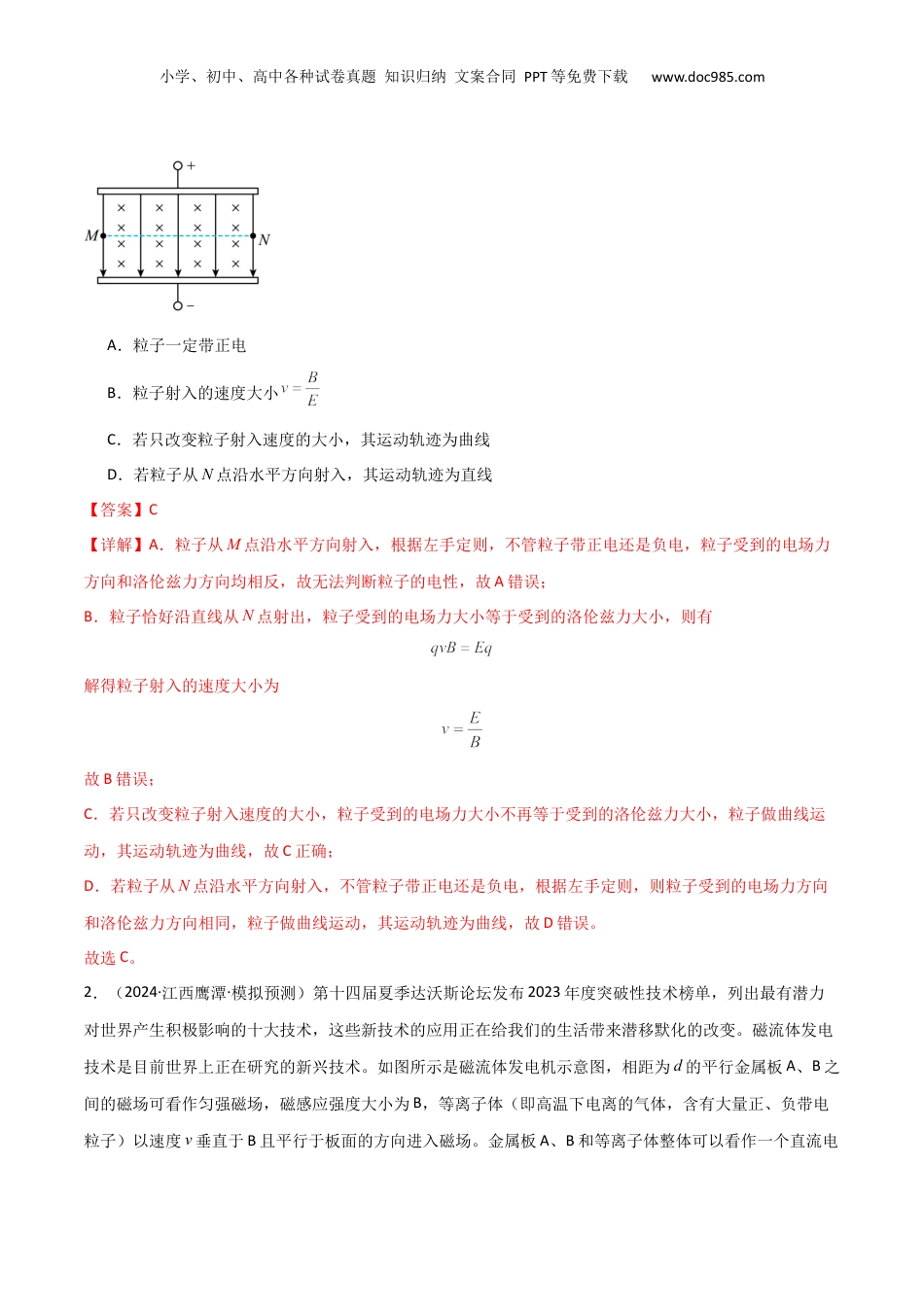 小学、初中、高中各种试卷真题知识归纳文案合同PPT等免费下载www.doc985.com专题突破卷15物理科技的理解应用(速度选择器、质谱仪、回旋加速器、霍尔元件、电磁流量计、磁流体发电机)60分钟考点考向题型分布物理科技的理解应用(速度选择器、质谱仪、回旋加速器、霍尔元件、电磁流量计、磁流体发电机等)考向1:速度选择器考向2:质谱仪考向3:回旋加速器考向4:霍尔元件考向5:电磁流量计考向6:磁流体发电机10单选+7多选+3计算物理科技的理解应用(速度选择器、质谱仪、回旋加速器、霍尔元件、电磁流量计、磁流体发电机等)(10单选+7多选+3计算)1.(2024·北京昌平·二模)如图所示,水平放置的两平行金属板间存在着相互垂直的匀强电场和匀强磁场。一带电粒子(重力不计)从M点沿水平方向射入到两板之间,恰好沿直线从N点射出。电场强度为E,磁感应强度为B。下列说法正确的是()。小学、初中、高中各种试卷真题知识归纳文案合同PPT等免费下载www.doc985.comA.粒子一定带正电B.粒子射入的速度大小C.若只改变粒子射入速度的大小,其运动轨迹为曲线D.若粒子从N点沿水平方向射入,其运动轨迹为直线【答案】C【详解】A.粒子从M点沿水平方向射入,根据左手定则,不管粒子带正电还是负电,粒子受到的电场力方向和洛伦兹力方向均相反,故无法判断粒子的电性,故A错误;B.粒子恰好沿直线从N点射出,粒子受到的电场力大小等于受到的洛伦兹力大小,则有解得粒子射入的速度大小为故B错误;C.若只改变粒子射入速度的大小,粒子受到的电场力大小不再等于受到的洛伦兹力大小,粒子做曲线运动,其运动轨迹为曲线,故C正确;D.若粒子从N点沿水平方向射入,不管粒子带正电还是负电,根据左手定则,则粒子受到的电场力方向和洛伦兹力方向相同,粒子做曲线运动,其运动轨迹为曲线,故D错误。故选C。2.(2024·江西鹰潭·模拟预测)第十四届夏季达沃斯论坛发布2023年度突破性技术榜单,列出最有潜力对世界产生积极影响的十大技术,这些新技术的应用正在给我们的生活带来潜移默化的改变。磁流体发电技术是目前世界上正在研究的新兴技术。如图所示是磁流体发电机示意图,相距为d的平行金属板A、B之间的磁场可看作匀强磁场,磁感应强度大小为B,等离子体(即高温下电离的气体,含有大量正、负带电粒子)以速度v垂直于B且平行于板面的方向进入磁场。金属板A、B和等离子体整体可以看作一个直流电小学、初中、高中各种试卷真题知识归纳文案合同PPT等免费下载www.doc985.com源。将金属板A、B与电阻R相连,当发电机稳定发电时,假设两板间磁流体的等效电阻为r,则A、B两金属板间的电势差为()A.B.C.D.【答案】A【详解】由左手定则可知,正离子受向下的洛伦兹力偏向B板,则B板带正电,B板是电源的正极,当达到平衡时有解得电动势根据闭合电路欧姆定律可知,A、B两金属板间的电势差故选A。3.(2024·广东东莞·模拟预测)关于下列四幅图理解正确的是()A.甲图中干电池的电动势为1.5V,则通过电源的电荷量为1C时,电源内静电力做功为1.5JB.乙图中等离子体进入上、下极板之间后上极板A带正电C.丙图中通过励磁线圈的电流越大,电子的运动径迹半径越小D.丁图中回旋加速器带电粒子的最大动能与加速电压的大小有关【答案】C小学、初中、高中各种试卷真题知识归纳文案合同PPT等免费下载www.doc985.com【详解】A.甲图中干电池的电动势为1.5V,则通过电源的电荷量为1C时,电源内非静电力做功为A错误;B.乙图中等离子体进入上、下极板之间后,正离子受到向下的洛伦兹力,向下偏,负离子受到向上的洛伦兹力,向上偏,故上极板A带负电,B错误;C.丙图中通过励磁线圈的电流越大,线圈产生的磁场越强,电子运动半径公式为则半径越小,C正确;D.由可知所以回旋加速器带电粒子的最大动能与加速电压的大小无关,D错误。故选C。4.(2024·北京海淀·模拟预测)磁流体发电的原理如图所示。将一束速度为v的等离子体(含有大量正、负带电粒子)垂直于磁场方向喷入磁感应强度为B的匀强磁场中,在相距为d、宽为a、长为b的两平行金属板间便产生电压。如果把上、下板和电阻R连接,上、下板就是一个直流电源...