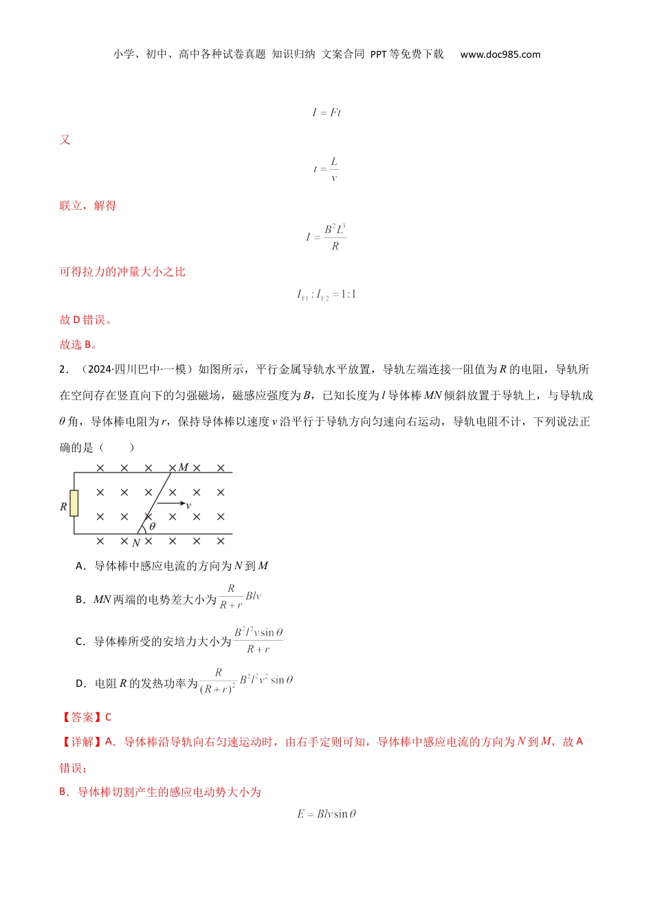 小学、初中、高中各种试卷真题知识归纳文案合同PPT等免费下载www.doc985.com专题突破卷13电磁感应中的电路问题和图像问题建议用时:75分钟考点考向题型分布电磁感应中的电路问题和图像问题考向1:电磁感应等效电路(电压、电流、电阻的计算)考向2:电路中焦耳热和功率的计算考向3:电路中流过电荷量的计算考向4:U-t图像考向5:I-t图像考向6:F-t、a-t图像等5单选+13多选+2计算电磁感应中的电路问题和图像问题(5单选+13多选+2计算)1.(2024·北京海淀·三模)如图所示,先后用一垂直于cd边的恒定外力以速度和匀速把一正方形导线框拉出有界的匀强磁场区域,,拉出过程中ab边始终平行于磁场边界。先后两次把导线框拉出磁场情况下,下列结论正确的是()小学、初中、高中各种试卷真题知识归纳文案合同PPT等免费下载www.doc985.comA.感应电流之比B.外力大小之比C.拉力的功率之比D.拉力的冲量大小之比【答案】B【详解】A.根据可得感应电流之比故A错误;B.根据可得外力大小之比故B正确;C.根据可得拉力的功率之比故C错误;D.根据小学、初中、高中各种试卷真题知识归纳文案合同PPT等免费下载www.doc985.com又联立,解得可得拉力的冲量大小之比故D错误。故选B。2.(2024·四川巴中·一模)如图所示,平行金属导轨水平放置,导轨左端连接一阻值为R的电阻,导轨所在空间存在竖直向下的匀强磁场,磁感应强度为B,已知长度为l导体棒MN倾斜放置于导轨上,与导轨成θ角,导体棒电阻为r,保持导体棒以速度v沿平行于导轨方向匀速向右运动,导轨电阻不计,下列说法正确的是()A.导体棒中感应电流的方向为N到MB.MN两端的电势差大小为C.导体棒所受的安培力大小为D.电阻R的发热功率为【答案】C【详解】A.导体棒沿导轨向右匀速运动时,由右手定则可知,导体棒中感应电流的方向为N到M,故A错误;B.导体棒切割产生的感应电动势大小为小学、初中、高中各种试卷真题知识归纳文案合同PPT等免费下载www.doc985.com故导体棒两端的电势差大小为故B错误;C.导体棒所受的安培力大小为故C正确;D.电阻R的发热功率为故D错误。故选C。3.(2024·河北沧州·三模)如图所示,“凹”字形金属线框右侧有一宽度为3L的匀强磁场区域,磁场方向垂直于纸面向里。线框在纸面内向右匀速通过磁场区域,t0时,线框开始进入磁场。设逆时针方向为感应电流的正方向,则线框中感应电流i随时间t变化的图像可能正确的是()A.B.小学、初中、高中各种试卷真题知识归纳文案合同PPT等免费下载www.doc985.comC.D.【答案】A【详解】设运动的速度为v,线框总电阻为R,线框进入磁场0~L时,只有最右侧的两个短边切割磁感线,感应电流的方向为逆时针,大小为线框进入磁场L~3L时,金属线切割磁感线的有效长度为3L,感应电流方向为逆时针,大小为线框离开磁场0~L时,金属线切割磁感线的有效长度为2L,从左侧长边进入磁场,至右侧的中间短边离开磁场,感应电流方向为顺时针,大小为线框离开磁场L~3L时,金属线切割磁感线的有效长度为3L,从右侧中间短边离开磁场,至左侧长边离开磁场,感应电流方向为顺时针,大小为故选A。4.(2024·山东济南·三模)如图所示,半径为的半圆形闭合金属线框可绕圆心在纸面内逆时针匀速转动,过点的边界上方存在垂直于纸面向外的匀强磁场,磁感应强度大小为。初始时线框直径与虚线边界垂直。已知线框的电阻为,线框匀速转动的角速度为,从图示位置开始计时,以顺时针为感应电流的正方向,下列关于线圈中的感应电流随时间的变化关系正确的是()小学、初中、高中各种试卷真题知识归纳文案合同PPT等免费下载www.doc985.comA.B.C.D.【答案】D【详解】如图所示在时间内,穿过线圈的磁通量向外增加,根据楞次定律可知,线圈中的感应电流方向为顺时针方向(正方向),线圈切割磁感线的有效长度为则线圈转动切割磁感线产生的电动势为线圈中的感应电流为小学、初中、高中各种试卷真题知识归纳文案合同PPT等免费下载www.doc985.com在时间内,整个线圈都在磁场中,线圈的感应电流为0;在时间内,穿过线圈的磁通量向外减小,根据楞次定律可知,线圈中的感应电流方向为逆时针方向(负方向),线圈切...