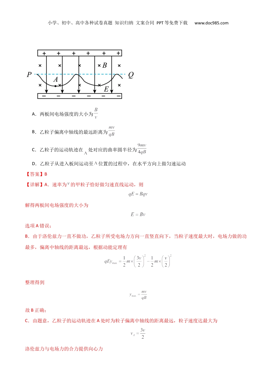 小学、初中、高中各种试卷真题知识归纳文案合同PPT等免费下载www.doc985.com专题突破卷12带电粒子在组合场、复合场、叠加场、交变电磁场中的运动60分钟考点考向题型分布带电粒子在组合场、复合场、叠加场、交变电磁场中的运动考向1:电场、磁场、重力场组合场模型考向2:电场、磁场、重力场复合场模型考向3:电场、磁场、重力场叠加场模型考向4:交变电场与磁场重力场综合模型6单选+6多选+4计算带电粒子在组合场、复合场、叠加场、交变电磁场中的运动(6单选+6多选+4计算)1.(2024·湖南·三模)如图所示,直角坐标系位于竖直平面内,y轴竖直向上,第III、IV象限内有垂直于坐标平面向外的匀强磁场,第IV象限同时存在方向平行于y轴的匀强电场(图中未画出),一质量为m、带电量绝对值为q的小球从x轴上的A点由静止释放,恰好从P点垂直于y轴进入第IV象限,然后做圆周运动,从Q点以速度v垂直于x轴进入第I象限,重力加速度为g,不计空气阻力。则()小学、初中、高中各种试卷真题知识归纳文案合同PPT等免费下载www.doc985.comA.从A点到Q点的过程小球的机械能守恒B.电场方向竖直向上C.小球在第IV象限运动的时间为D.小球能够返回到A点【答案】C【详解】AB.根据左手定则和小球从A运动到P的轨迹可知小球带负电。从P到Q过程中小球做圆周运动可知此时小球受到的向下的重力与向上的电场力平衡,又因为小球带负电所以电场方向竖直向下。A到Q的过程中,洛伦兹力不做功,电场力做正功,机械能增加。故AB错误;C.小球恰好从P点垂直于y轴进入第IV象限,然后做圆周运动,从Q点以速度v垂直于x轴进入第Ⅰ象限,所以设小球做圆周运动的半径为,则在到过程中,根据动能定理可得mgℎ=12mv2−0,小球做圆周运动的周期小球在第IV象限运动的时间为故C正确。D.根据竖直上抛运动规律可知小球会从Q点以速度大小为垂直于轴向下进入磁场,此后根据左手定则,小球不会有向左的运动,不能够返回A点。故D错误。故选C。2.(2024·黑龙江大庆·模拟预测)如图所示,两平行极板水平放置,两板间有垂直纸面向里的匀强磁场和竖直向下的匀强电场,磁场的磁感应强度为。一束质量均为、电荷量均为的粒子,以不同速率沿着两板中轴线方向进入板间后,速率为的甲粒子恰好做匀速直线运动;速率为的乙粒子在板间的运动轨迹如图中曲线所示,为乙粒子第一次到达轨迹最低点的位置,乙粒子全程速率在和之间变化。研究一般的曲线运动时,可将曲线分割成许多很短的小段,这样质点在每一小段的运动都可以看做圆周运动的一部分,对应小段圆弧的半径叫该处曲率圆半径。不计粒子受到的重力及粒子间的相互作用,下列说法正确的是()小学、初中、高中各种试卷真题知识归纳文案合同PPT等免费下载www.doc985.comA.两板间电场强度的大小为B.乙粒子偏离中轴线的最远距离为C.乙粒子的运动轨迹在处对应的曲率圆半径为D.乙粒子从进入板间运动至位置的过程中,在水平方向上做匀速运动【答案】B【详解】A.速率为的甲粒子恰好做匀速直线运动,则解得两板间电场强度的大小为选项A错误;B.由于洛伦兹力一直不做功,乙粒子所受电场力方向一直竖直向下,当粒子速度最大时,电场力做的功最多,偏离中轴线的距离最远,根据动能定理有整理得到故B正确;C.由题意,乙粒子的运动轨迹在A处时为粒子偏离中轴线的距离最远,粒子速度达最大为洛伦兹力与电场力的合力提供向心力小学、初中、高中各种试卷真题知识归纳文案合同PPT等免费下载www.doc985.com所以对应圆周的半径为故C错误。D.由题意,速率为的乙粒子在板间的运动轨迹如图中曲线所示,根据左手定则判断知,粒子受到的洛伦兹力总是垂直指向每一小段圆弧的中心,可知乙粒子在水平方向上的合力一直水平向右,所以粒子从进入板间运动至A位置的过程中,在水平方向上做加速运动,故D错误;故选B。3.(2024·江苏南京·模拟预测)如图所示,xOy坐标平面在竖直面内,x轴沿水平方向,y轴正方向竖直向上,在图示空间内有垂直于xOy平面的水平匀强磁场,磁感应强度大小为B。一带电量为、质量为m的小球从O点由静止释放,运动轨迹如图中曲线所示。则()A.OAB轨迹为半圆B.磁场垂直于纸面向里C.小球运...