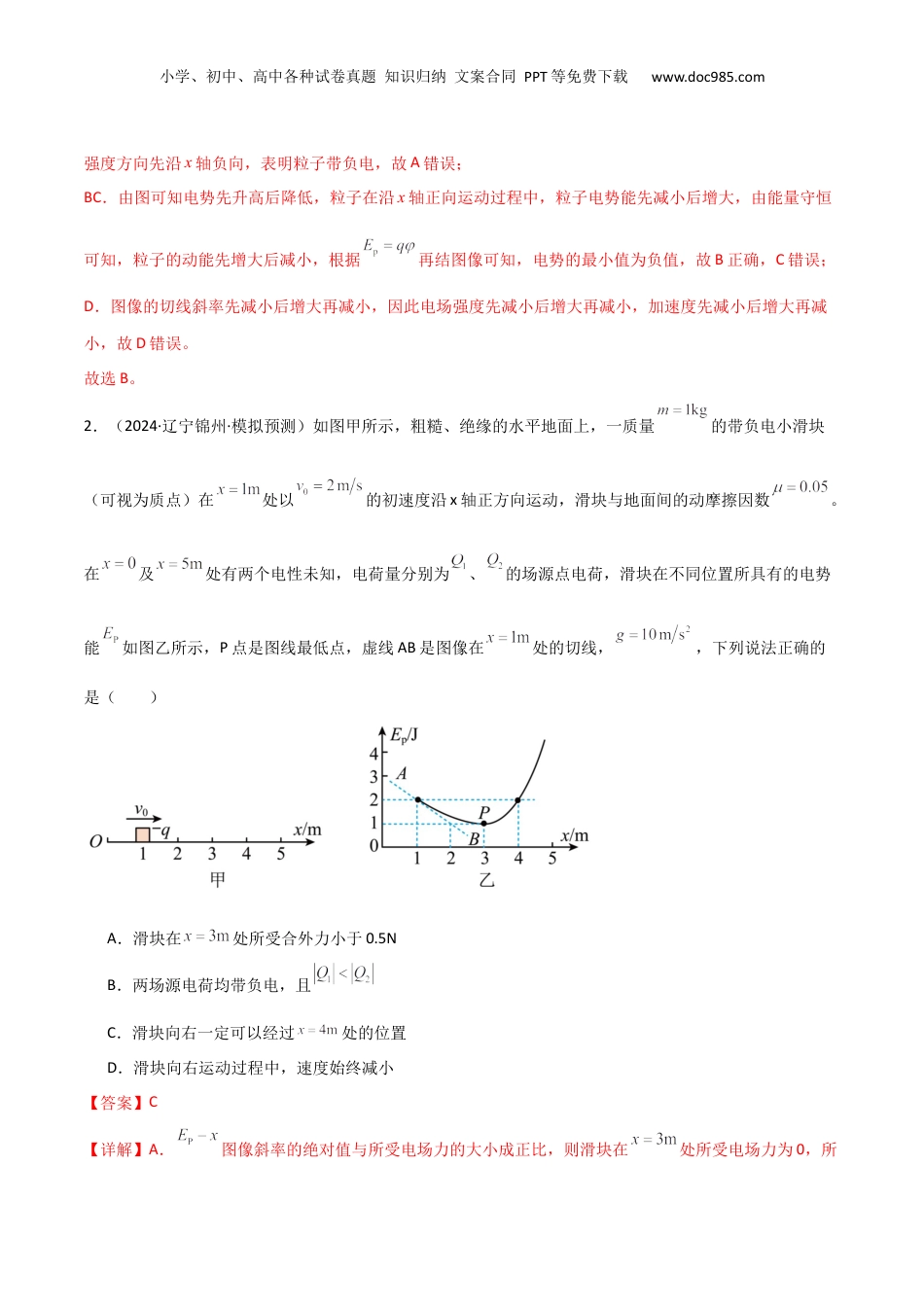 小学、初中、高中各种试卷真题知识归纳文案合同PPT等免费下载www.doc985.com专题突破卷08电场中的图像专题和电容器专题建议用时:50分钟考点序号考点考向题型分布考点1电场中的图像问题考向1:E-X图像的理解应用考向2:EP-X图像的理解应用考向3:Ψ-X图像的理解应用7单选+3多选考点2电容器动态平衡问题考向1:电容和电容器的理解应用考向2:电容器的动态分析考向3:电容器中的平衡问题考向4:电容器中的能量问题5单选+5多选电场中的图像问题(7单选+3多选)1.(2024·河北保定·三模)如图所示为某静电场中x正半轴上电势φ随x变化的规律图像,一个带电粒子在x轴坐标原点O由静止释放,粒子仅在电场力作用下沿x轴正向运动,粒子沿x轴正向运动过程中,下列说法正确的是()A.粒子带正电B.电势能先减小后增大C.电势能的最小值为零D.加速度先减小后增大【答案】B【详解】A.粒子从静止开始沿x轴正向运动,可知电场力方向先沿x轴正向,由图可知电势先升高则电场小学、初中、高中各种试卷真题知识归纳文案合同PPT等免费下载www.doc985.com强度方向先沿x轴负向,表明粒子带负电,故A错误;BC.由图可知电势先升高后降低,粒子在沿x轴正向运动过程中,粒子电势能先减小后增大,由能量守恒可知,粒子的动能先增大后减小,根据再结图像可知,电势的最小值为负值,故B正确,C错误;D.图像的切线斜率先减小后增大再减小,因此电场强度先减小后增大再减小,加速度先减小后增大再减小,故D错误。故选B。2.(2024·辽宁锦州·模拟预测)如图甲所示,粗糙、绝缘的水平地面上,一质量的带负电小滑块(可视为质点)在处以的初速度沿x轴正方向运动,滑块与地面间的动摩擦因数。在及处有两个电性未知,电荷量分别为、的场源点电荷,滑块在不同位置所具有的电势能如图乙所示,P点是图线最低点,虚线AB是图像在处的切线,,下列说法正确的是()A.滑块在处所受合外力小于0.5NB.两场源电荷均带负电,且C.滑块向右一定可以经过处的位置D.滑块向右运动过程中,速度始终减小【答案】C【详解】A.图像斜率的绝对值与所受电场力的大小成正比,则滑块在处所受电场力为0,所小学、初中、高中各种试卷真题知识归纳文案合同PPT等免费下载www.doc985.com受合外力为摩擦力故A错误;B.滑块在x=3m处电势能最低,因为滑块带负电,则该处的电势最高,因此两场源电荷均带负电。在处电场强度为0,则又由则故B错误;C.如图乙所示,滑块在处的电势能与在处的电势能相等,根据能量守恒定律可知,若滑块能够经过处,则应满足由,由此可知,滑块一定可以经过处的位置,故C正确;D.滑块在处所受电场力大小为因此,滑块在该处所受电场力大小大于滑动摩擦力,且方向相反,则滑块加速运动,故D错误。故选C。3.(2024·湖南衡阳·模拟预测)某静电场沿x轴分布,其电势φ随x变化规律如图所示,x轴上a、b两点切线斜率的绝对值,下列说法正确的是()小学、初中、高中各种试卷真题知识归纳文案合同PPT等免费下载www.doc985.comA.a点场强大小小于b点的B.同一电荷在a点受到的电场力大小可能等于在b点的C.同一正电荷在a点的电势能大于在b点的电势能D.将一负电荷从a点移到b点,电场力做正功【答案】D【详解】A.由题意可知,φ~x图像的斜率表示场强的大小,由于所以a点场强大于b点场强,故A错误;B.根据同一电荷在a点受到的电场力大于在b点受到的电场力,故B错误;C.由图可知根据可知,同一正电荷在a点的电势能小于在b点的电势能,故C错误;D.将一负电荷从低电势移到高电势处,电势能减小,电场力做正功,故D正确。故选D。4.(2024·四川成都·模拟预测)如图所示是电视机显像管主聚焦电场中的电场线分布图,中间一根电场线是直线,电子从O点由静止开始只在电场力作用下运动到A点。取O点为坐标原点,沿直线向右为x轴正方向,在此过程中,关于电子运动速度v随时间t的变化图线,运动径迹上电势、加速度a、电子动能Ek随位移x的变化图线,下列一定不正确的是()小学、初中、高中各种试卷真题知识归纳文案合同PPT等免费下载www.doc985.comA.B.C.D.【答案】C【详解】AC.在v-t图像中,斜率表示加速度,而加速度由电场力...