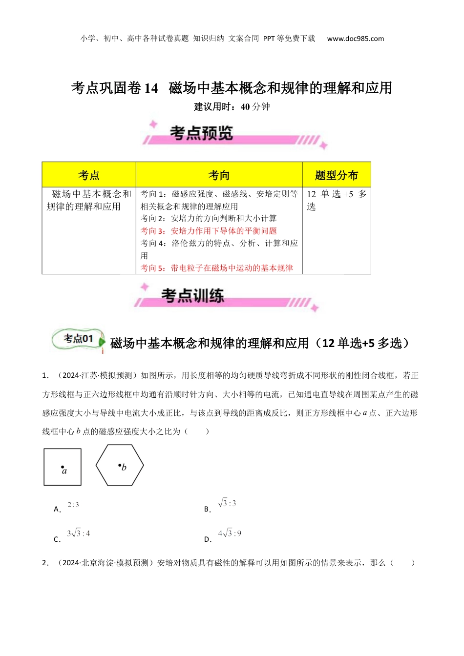 小学、初中、高中各种试卷真题知识归纳文案合同PPT等免费下载www.doc985.com考点巩固卷14磁场中基本概念和规律的理解和应用建议用时:40分钟考点考向题型分布磁场中基本概念和规律的理解和应用考向1:磁感应强度、磁感线、安培定则等相关概念和规律的理解应用考向2:安培力的方向判断和大小计算考向3:安培力作用下导体的平衡问题考向4:洛伦兹力的特点、分析、计算和应用考向5:带电粒子在磁场中运动的基本规律12单选+5多选磁场中基本概念和规律的理解和应用(12单选+5多选)1.(2024·江苏·模拟预测)如图所示,用长度相等的均匀硬质导线弯折成不同形状的刚性闭合线框,若正方形线框与正六边形线框中均通有沿顺时针方向、大小相等的电流,已知通电直导线在周围某点产生的磁感应强度大小与导线中电流大小成正比,与该点到导线的距离成反比,则正方形线框中心a点、正六边形线框中心b点的磁感应强度大小之比为()A.B.C.D.2.(2024·北京海淀·模拟预测)安培对物质具有磁性的解释可以用如图所示的情景来表示,那么()小学、初中、高中各种试卷真题知识归纳文案合同PPT等免费下载www.doc985.comA.甲图代表了被磁化的铁棒的内部情况B.乙图代表了被磁化的铁棒的内部情况C.磁体在常温环境与高温环境下磁性强弱相同D.磁体在高温环境下磁性会加强3.(2024·辽宁·三模)如图所示,ACD为一等边三角形,两根通过电流相等的长直导线分别垂直纸面置于A、D两个顶点,A处导线中的电流方向垂直纸面向里,D处导线中的电流方向垂直纸面向外。已知通电长直导线在其周围某点处产生的磁感应强度大小为,k为常量,为该点到通电直导线的距离。已知C处磁感应强度大小为,则CD边中点E的磁感应强度大小为()A.B.C.D.4.(2024·陕西·模拟预测)如图所示,等边三角形线框由三根相同的导体棒连接而成,O为线框的几何中心。线框顶点M、N与直流电源两端相接,已知电流为I的直导线产生的磁场的磁感应强度计算公式为(k为常数,r为某点到直导线的距离),若MN边在O点产生的磁场的磁感应强度大小为,则ML、LN两边在O点产生的合磁场磁感应强度大小及方向为()小学、初中、高中各种试卷真题知识归纳文案合同PPT等免费下载www.doc985.comA.0B.,垂直纸面向里C.,垂直纸面向外D.2,垂直纸面向里5.(2024·江西上饶·模拟预测)如图所示,边长为L的正方形金属线框abed放置在绝缘水平面上,空间存在竖直向下的匀强磁场,将大小为I的恒定电流从线框a端流入、b端流出,此时线框整体受安培力大小为,将线框绕ab边转过60°静止不动,此时线框整体受安培力大小为,则()A.B.C.D.6.(2024·浙江金华·三模)如图甲所示,a、b是两个等量同种正电荷的连线上关于O点对称的两点,与此类似,两根相互平行的长直导线垂直纸面通过M、N两点,两导线中通有等大反向的恒定电流,c、d同样关于中心点对称,忽略其他作用力作用,下列说法正确的是()A.a与b两点的电场强度相同小学、初中、高中各种试卷真题知识归纳文案合同PPT等免费下载www.doc985.comB.O点电场强度为零,点磁感应强度也为零C.M导线与N导线有相互靠近的趋势D.在O点给质子一个向上的初速度,质子会向上做直线运动且速度在增加,加速度先增加后减少7.(2024·黑龙江·模拟预测)如图所示,三角形闭合线框ABC由弹性较好的导线制成;线框中通有沿逆时针方向的恒定电流,三角形的三个顶点A、B、C固定在绝缘水平面上,带有绝缘层的长直导线MN紧贴线框固定在线框上方。给直导线通入从M到N的恒定电流,不考虑闭合线框各边之间的作用力,此后该线框的形状可能是()A.B.C.D.8.(2024·广西桂林·模拟预测)如图所示为电磁轨道炮的工作原理图,质量为m的待发射弹体与轨道保持良好接触,并可在宽为d、长为L的两平行水平轨道之间无摩擦滑动,轨道间加有磁感应强度大小为B、方向竖直向下的匀强磁场,恒定电流I从一条轨道流入,通过弹体流回另一条轨道。不计空气阻力,则弹体通过这一装置可以获得的最大速度为()小学、初中、高中各种试卷真题知识归纳文案合同PPT等免费下载www.doc985.comA.B.C.D.9.(2024·江苏南通·三模)如图所示,...