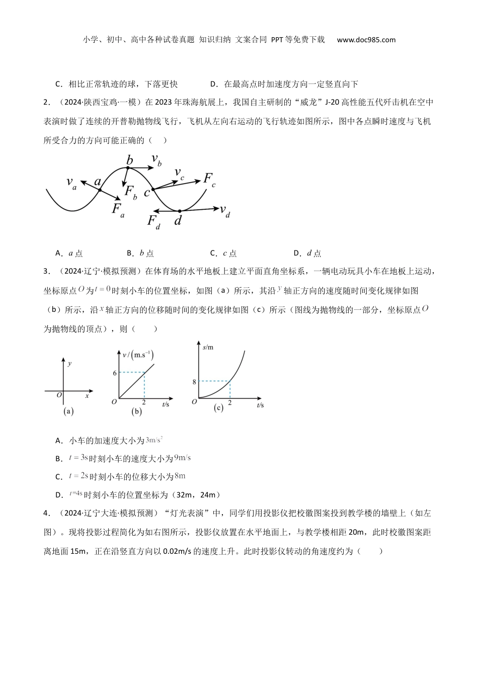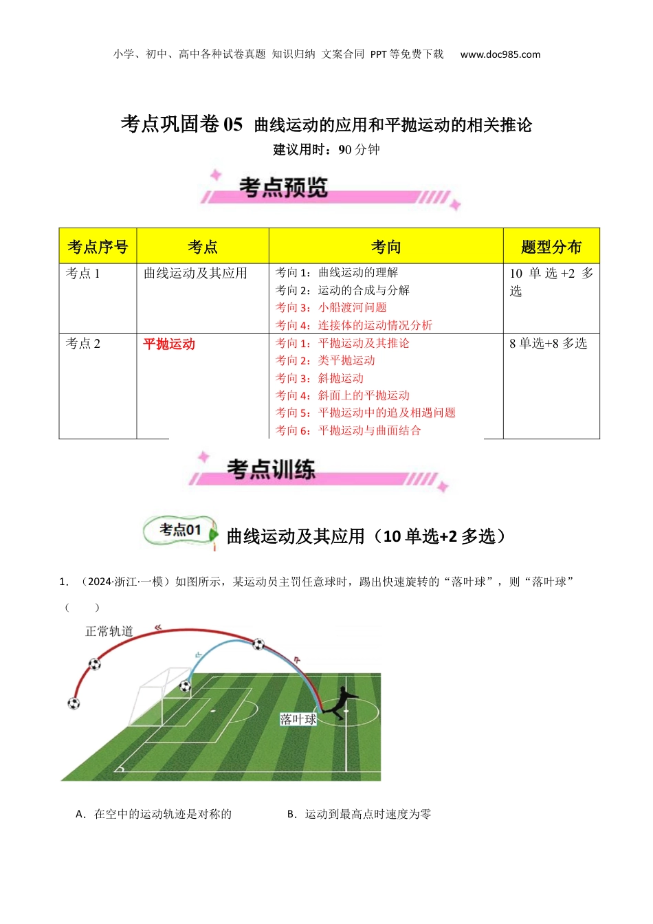 小学、初中、高中各种试卷真题知识归纳文案合同PPT等免费下载www.doc985.com考点巩固卷05曲线运动的应用和平抛运动的相关推论建议用时:90分钟考点序号考点考向题型分布考点1曲线运动及其应用考向1:曲线运动的理解考向2:运动的合成与分解考向3:小船渡河问题考向4:连接体的运动情况分析10单选+2多选考点2平抛运动考向1:平抛运动及其推论考向2:类平抛运动考向3:斜抛运动考向4:斜面上的平抛运动考向5:平抛运动中的追及相遇问题考向6:平抛运动与曲面结合8单选+8多选曲线运动及其应用(10单选+2多选)1.(2024·浙江·一模)如图所示,某运动员主罚任意球时,踢出快速旋转的“落叶球”,则“落叶球”()A.在空中的运动轨迹是对称的B.运动到最高点时速度为零小学、初中、高中各种试卷真题知识归纳文案合同PPT等免费下载www.doc985.comC.相比正常轨迹的球,下落更快D.在最高点时加速度方向一定竖直向下2.(2024·陕西宝鸡·一模)在2023年珠海航展上,我国自主研制的“威龙”J-20高性能五代歼击机在空中表演时做了连续的开普勒抛物线飞行,飞机从左向右运动的飞行轨迹如图所示,图中各点瞬时速度与飞机所受合力的方向可能正确的()A.a点B.b点C.c点D.d点3.(2024·辽宁·模拟预测)在体育场的水平地板上建立平面直角坐标系,一辆电动玩具小车在地板上运动,坐标原点为时刻小车的位置坐标,如图(a)所示,其沿轴正方向的速度随时间变化规律如图(b)所示,沿轴正方向的位移随时间的变化规律如图(c)所示(图线为抛物线的一部分,坐标原点为抛物线的顶点),则()A.小车的加速度大小为B.时刻小车的速度大小为C.时刻小车的位移大小为D.时刻小车的位置坐标为(32m,24m)4.(2024·辽宁大连·模拟预测)“灯光表演”中,同学们用投影仪把校徽图案投到教学楼的墙壁上(如左图)。现将投影过程简化为如右图所示,投影仪放置在水平地面上,与教学楼相距20m,此时校徽图案距离地面15m,正在沿竖直方向以0.02m/s的速度上升。此时投影仪转动的角速度约为()小学、初中、高中各种试卷真题知识归纳文案合同PPT等免费下载www.doc985.comA.B.C.D.5.(2024·四川德阳·模拟预测)如图所示,消防员正在宽度为d=100m,河水流速为的河流中进行水上救援演练,可视为质点的冲锋舟距离下游危险区的距离为x=75m,其在静水中的速度为v2,则()A.若冲锋舟以在静水中的初速度为零,船头垂直于岸的加速度为a=0.9m/s²匀加速冲向对岸,则能安全到达对岸B.为了使冲锋舟能安全到达河对岸,冲锋舟在静水中的速度v2不得小于3m/sC.若冲锋舟船头与河岸夹角为30°斜向上游且以速度匀速航行,则恰能到达正对岸D.冲锋舟匀速航行恰能安全到达对岸所用的时间t=25s6.(2024·辽宁·模拟预测)解放军某部在某次登岛演习过程中,要渡过一条宽度为d的小河。现有甲、乙两个战斗小组分别乘两只小船渡河,船头朝向如图所示,渡河时两小船船头与河岸夹角都是θ角,两船在静水中的速率都为v,水流速率为v0,此时甲船恰好能到小河正对岸的A点,则()小学、初中、高中各种试卷真题知识归纳文案合同PPT等免费下载www.doc985.comA.甲船渡河时间为B.乙船比甲船更早到达对岸C.靠岸时两船间距增大了D.如果河水流速增大,甲船不改变船头方向也能到达A点7.如图,某河流中水流速度大小恒为v1,A处的下游C处有个漩涡,漩涡与河岸相切于B点,漩涡的半径为r,AB=。为使小船从A点出发以恒定的速度安全到达对岸,小船航行时在静水中速度的最小值为()A.B.C.v1D.8.(22-23高三上·重庆渝中·阶段练习)往复式活塞压缩机是通过活塞在汽缸内做往复运动来压缩和输送气体的压缩机,简图如图所示,圆盘与活塞通过铰链、连接在轻杆两端,左侧活塞被轨道固定,只能在方向运动,圆盘绕圆心(定点)做角速度为的匀速圆周运动,已知距离为,杆长,则()A.当距离不变时,杆长越大,活塞运动的范围越大B.活塞运动范围与杆长无关C.当垂直于时,若与夹角为,则活塞速度为D.当垂直于时,活塞速度为9.(23-24高一下·贵州遵义·开学考试)质量为m的物体P置于倾角为θ1,的固定光滑斜面上,轻质细绳跨过光滑定...