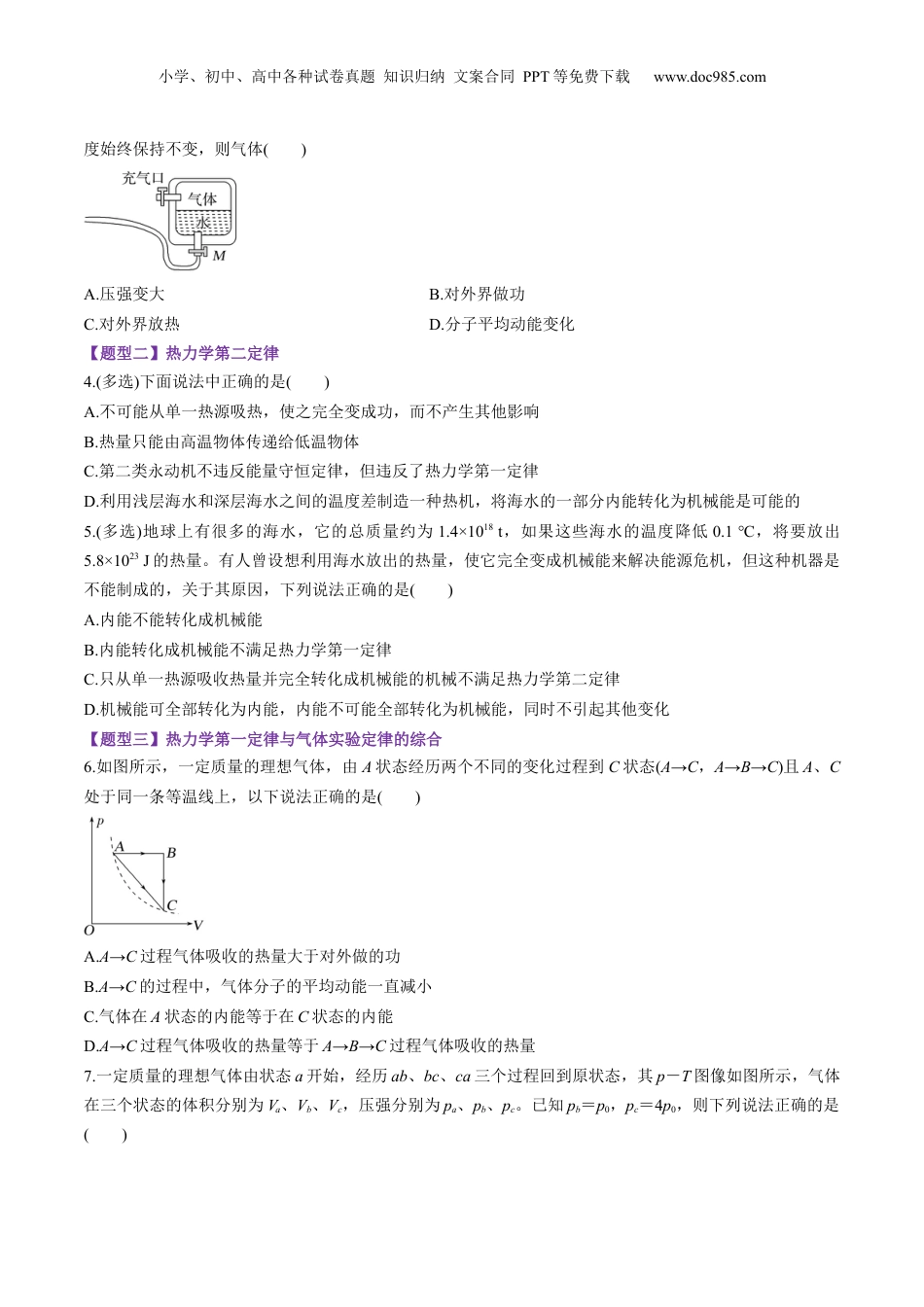 小学、初中、高中各种试卷真题知识归纳文案合同PPT等免费下载www.doc985.com第65讲热力学定律与能量守恒定律目录01模拟基础练【题型一】热力学第一定律与能量守恒定律【题型二】热力学第二定律【题型三】热力学第一定律与气体实验定律的综合02重难创新练【题型一】热力学第一定律与能量守恒定律1.如图是密闭的汽缸,外力推动活塞P压缩理想气体,对缸内气体做功200J,同时气体向外界放热100J,缸内气体的()A.温度升高,内能增加100JB.温度升高,内能减少200JC.温度降低,内能增加100JD.温度降低,内能减少200J2.一个充气气球用绳子拴着一块石头正在湖水中缓慢下沉,越往下水温越低,气球导热良好,则气球内气体()A.内能增加B.对外界做正功C.减少的内能小于放出的热量D.减少的内能大于放出的热量3.水枪是孩子们喜爱的玩具,常见的气压式水枪储水罐示意图如图。从储水罐充气口充入气体,达到一定压强后,关闭充气口。扣动扳机将阀门M打开,水即从枪口喷出。若在水不断喷出的过程中,罐内气体温小学、初中、高中各种试卷真题知识归纳文案合同PPT等免费下载www.doc985.com度始终保持不变,则气体()A.压强变大B.对外界做功C.对外界放热D.分子平均动能变化【题型二】热力学第二定律4.(多选)下面说法中正确的是()A.不可能从单一热源吸热,使之完全变成功,而不产生其他影响B.热量只能由高温物体传递给低温物体C.第二类永动机不违反能量守恒定律,但违反了热力学第一定律D.利用浅层海水和深层海水之间的温度差制造一种热机,将海水的一部分内能转化为机械能是可能的5.(多选)地球上有很多的海水,它的总质量约为1.4×1018t,如果这些海水的温度降低0.1℃,将要放出5.8×1023J的热量。有人曾设想利用海水放出的热量,使它完全变成机械能来解决能源危机,但这种机器是不能制成的,关于其原因,下列说法正确的是()A.内能不能转化成机械能B.内能转化成机械能不满足热力学第一定律C.只从单一热源吸收热量并完全转化成机械能的机械不满足热力学第二定律D.机械能可全部转化为内能,内能不可能全部转化为机械能,同时不引起其他变化【题型三】热力学第一定律与气体实验定律的综合6.如图所示,一定质量的理想气体,由A状态经历两个不同的变化过程到C状态(A→C,A→B→C)且A、C处于同一条等温线上,以下说法正确的是()A.A→C过程气体吸收的热量大于对外做的功B.A→C的过程中,气体分子的平均动能一直减小C.气体在A状态的内能等于在C状态的内能D.A→C过程气体吸收的热量等于A→B→C过程气体吸收的热量7.一定质量的理想气体由状态a开始,经历ab、bc、ca三个过程回到原状态,其p-T图像如图所示,气体在三个状态的体积分别为Va、Vb、Vc,压强分别为pa、pb、pc。已知pb=p0,pc=4p0,则下列说法正确的是()小学、初中、高中各种试卷真题知识归纳文案合同PPT等免费下载www.doc985.comA.pa=3p0B.Vb=3VcC.从状态a到状态b,气体对外做功D.从状态c到状态a,气体从外界吸热8.(多选)如图所示,一定质量的理想气体被质量为m的绝热活塞封闭在竖直放置的绝热汽缸中,活塞的面积为S,与汽缸底部相距L,温度为T0。现接通电热丝给气体缓慢加热,活塞缓慢向上移动距离L后停止加热,整个过程中,气体吸收的热量为Q,大气压强为p0,重力加速度为g。则()A.初始时,气体压强p1=p0B.停止加热时,气体的温度T=2T0C.该过程中,气体内能增加量ΔU=Q-mgL-p0SLD.该过程中,气体内能增加量ΔU=Q-p0SL9.(多选)一定质量的理想气体,从状态A经B、C变化到状态D变化过程的p-V图像如图所示,AB与横轴平行,BC与纵轴平行,ODC在同一直线上,已知A状态温度为400K,从A状态至B状态气体吸收了320J的热量,下列说法正确的是()A.A状态的内能大于C状态的内能B.从B状态到C状态的过程中,器壁单位面积在单位时间内受到撞击的分子数增加C.从A状态到B状态的过程中,气体内能增加了240JD.D状态的温度为225K10.一只篮球的体积为V0,球内气体的压强为p0,温度为T0。现用打气筒对篮球充入压强为2p0、温度为T0、体积为V1(大小未知)的气体,使球内气体压强变为3p0,同时温度升至1.5T0。已知气体内能U与温度小学、初中、高中各种试卷真题知识归纳文...