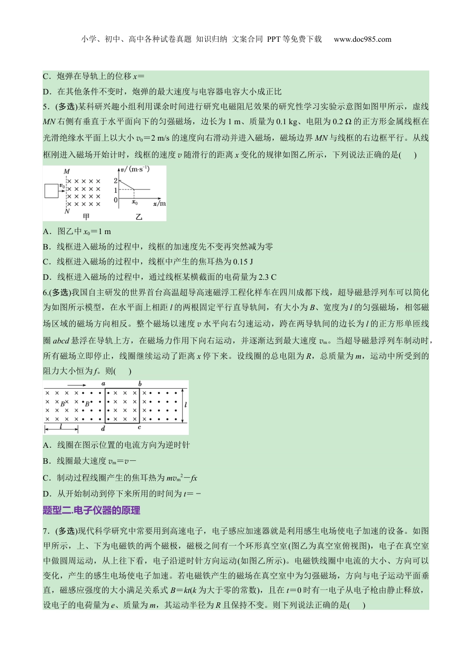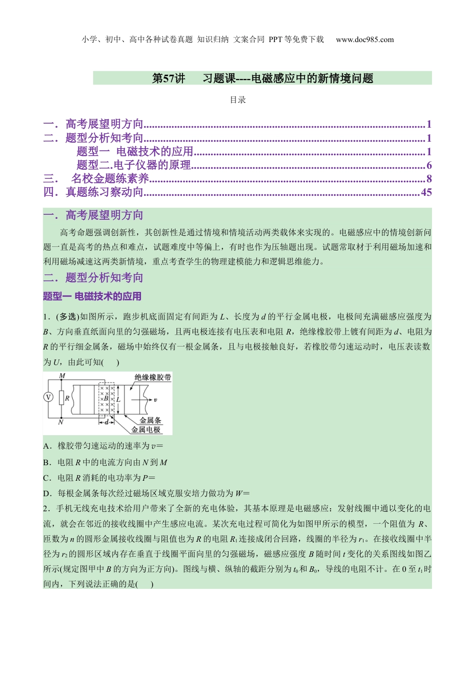 小学、初中、高中各种试卷真题知识归纳文案合同PPT等免费下载www.doc985.com第57讲习题课----电磁感应中的新情境问题目录一.高考展望明方向.....................................................................................................1二.题型分析知考向.....................................................................................................1题型一电磁技术的应用...................................................................................1题型二.电子仪器的原理....................................................................................6三.名校金题练素养...................................................................................................8四.真题练习察动向...................................................................................................45一.高考展望明方向高考命题强调创新性,其创新性是通过情境和情境活动两类载体来实现的。电磁感应中的情境创新问题一直是高考的热点和难点,试题难度中等偏上,有时也作为压轴题出现。试题常取材于利用磁场加速和利用磁场减速这两类新情境,重点考查学生的物理建模能力和逻辑思维能力。二.题型分析知考向题型一电磁技术的应用1.(多选)如图所示,跑步机底面固定有间距为L、长度为d的平行金属电极,电极间充满磁感应强度为B、方向垂直纸面向里的匀强磁场,且两电极连接有电压表和电阻R,绝缘橡胶带上镀有间距为d、电阻为R的平行细金属条,磁场中始终仅有一根金属条,且与电极接触良好,若橡胶带匀速运动时,电压表读数为U,由此可知()A.橡胶带匀速运动的速率为v=B.电阻R中的电流方向由N到MC.电阻R消耗的电功率为P=D.每根金属条每次经过磁场区域克服安培力做功为W=2.手机无线充电技术给用户带来了全新的充电体验,其基本原理是电磁感应:发射线圈中通以变化的电流,就会在邻近的接收线圈中产生感应电流。某次充电过程可简化为如图甲所示的模型,一个阻值为R、匝数为n的圆形金属接收线圈与阻值也为R的电阻R1连接成闭合回路,线圈的半径为r1。在接收线圈中半径为r2的圆形区域内存在垂直于线圈平面向里的匀强磁场,磁感应强度B随时间t变化的关系图线如图乙所示(规定图甲中B的方向为正方向)。图线与横、纵轴的截距分别为t0和B0,导线的电阻不计。在0至t1时间内,下列说法正确的是()小学、初中、高中各种试卷真题知识归纳文案合同PPT等免费下载www.doc985.comA.线圈中产生逆时针方向的感应电流B.a、b两点之间的电势差为C.线圈中感应电流的大小为D.电阻R1上产生的热量为3.(多选)电磁弹射是我国最新研究的重大科技项目,原理可用下述模型说明。如图(a)所示,虚线MN右侧存在一个竖直向上的匀强磁场,一边长为L的正方形n匝导线框abcd放在光滑水平面上,质量为m,单位长度电阻为R0,ab边在磁场外侧紧靠MN虚线边界处。从t=0时起磁感应强度B随时间t的变化规律是B=B0+kt(k为大于零的常数),空气阻力忽略不计,则下列说法正确的是()A.t=0时导线框中的电流为B.导线框穿出磁场过程中,通过导线框横截面的电荷量为C.若在导线框上加一质量为M的负载物,如图(b)所示,已知dc边穿出磁场时速度为v,穿出磁场所用时间为t,则安培力对导线框做的功为+(M+m)v2D.若在导线框上加一质量为M的负载物,如图(b)所示,已知dc边穿出磁场时速度为v,穿出磁场所用时间为t,则安培力对导线框做的功为+(M+m)v24.(多选)如图所示是某同学模拟电磁炮的工作原理和发射过程,水平台面上有足够长的平行光滑金属导轨MN和PQ置于塑料圆筒内,质量为m的金属炮弹置于圆筒内的导轨上,导轨间距为L,整个装置处于竖直向上的匀强磁场中,磁感应强度大小为B。导轨左端连着平行板电容器和电动势为E的电源。先让单刀双掷开关接1接线柱对电容器充电,充电结束后,将开关接2接线柱。金属炮弹在安培力作用下开始运动,达到最大速度后离开导轨,整个过程通过炮弹的电荷量为q。已知在圆筒中金属炮弹始终与导轨接触良好,不计导轨电阻,炮弹电阻为R。在这个...