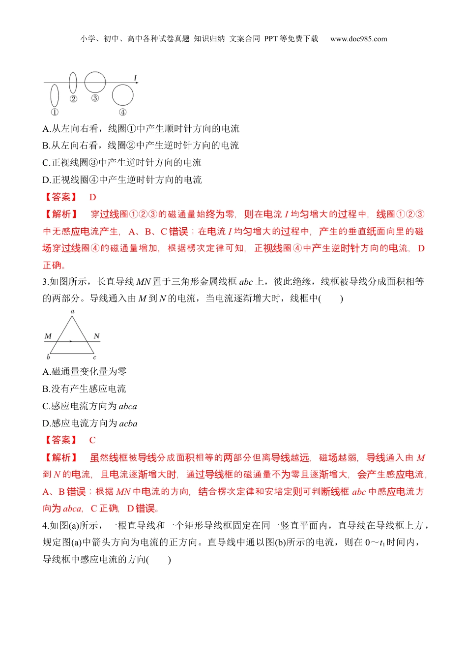 小学、初中、高中各种试卷真题知识归纳文案合同PPT等免费下载www.doc985.com第52讲三定则、一定律的综合应用目录01模拟基础练【题型一】感应电流的产生和方向的判断【题型二】楞次定律的推广应用【题型三】“三定则、一定律”的应用【题型四】实验:探究影响感应电流方向的因素02重难创新练【题型一】感应电流的产生和方向的判断1.如图所示,一通电螺线管b放在闭合金属线圈a内,螺线管的中心轴线恰和线圈的一条直径MN重合。要使线圈a中产生感应电流,可采用的方法有()A.使通电螺线管中的电流发生变化B.使螺线管绕垂直于线圈平面且过线圈圆心的轴转动C.使线圈a以MN为轴转动D.使线圈绕垂直于MN的直径转动【答案】D【解析】在A、B、C三情下,穿圈种况过线a的磁通量始零,因此不生感流,终为产应电故A、B、C;错误选项D中,圈垂直于当线绕MN的直,穿圈的磁通量生径转动时过线发变化,生感流,故会产应电D正确。2.如图所示,长直导线中通有向右的电流I,线圈①与直导线垂直放置于其正下方,线圈②中心轴线与直导线重合,线圈③直径与直导线重合,线圈④与直导线共面放置于其正下方。在电流I均匀增大的过程中()小学、初中、高中各种试卷真题知识归纳文案合同PPT等免费下载www.doc985.comA.从左向右看,线圈①中产生顺时针方向的电流B.从左向右看,线圈②中产生逆时针方向的电流C.正视线圈③中产生逆时针方向的电流D.正视线圈④中产生逆时针方向的电流【答案】D【解析】穿圈过线①②③的磁通量始零,在流终为则电I均增大的程中,圈匀过线①②③中无感流生,应电产A、B、C;在流错误电I均增大的程中,生的垂直面向里的磁匀过产纸穿圈场过线④的磁通量增加,根据楞次定律可知,正圈视线④中生逆方向的流,产时针电D正确。3.如图所示,长直导线MN置于三角形金属线框abc上,彼此绝缘,线框被导线分成面积相等的两部分。导线通入由M到N的电流,当电流逐渐增大时,线框中()A.磁通量变化量为零B.没有产生感应电流C.感应电流方向为abcaD.感应电流方向为acba【答案】C【解析】然框被分成面相等的部分但离越,磁越弱,通入由虽线导线积两导线远场导线M到N的流,且流逐增大,通框的磁通量不零且逐增大,生感流电电渐时过导线为渐会产应电,A、B;根据错误MN中流的方向,合楞次定律和安培定可判框电结则断线abc中感流方应电向为abca,C正确,D。错误4.如图(a)所示,一根直导线和一个矩形导线框固定在同一竖直平面内,直导线在导线框上方,规定图(a)中箭头方向为电流的正方向。直导线中通以图(b)所示的电流,则在0~t1时间内,导线框中感应电流的方向()小学、初中、高中各种试卷真题知识归纳文案合同PPT等免费下载www.doc985.comA.先顺时针后逆时针B.先逆时针后顺时针C.始终沿顺时针D.始终沿逆时针【答案】C【解析】始段直中流向右小,磁方向垂直面向里,穿框的磁通量开阶导线电减场纸过线减小,由楞次定律可知,框中感流方向;后一段直中流向左增加,磁线应电为顺时针阶导线电方向垂直面向外,穿框的磁通量增加,由楞次定律可知,框中感流场纸过线线应电为顺时针方向,故C正确。【题型二】楞次定律的推广应用5.如图所示,一带正电粒子从直径上方掠过在水平面内的金属圆环表面,粒子与圆环不接触,该过程中()A.穿过金属环的磁通量一定不变B.环中一定有感应电流C.金属环有扩张趋势D.粒子与金属环无相互作用【答案】B【解析】正粒子直上方掠金表面,穿金的磁感垂直带电从径过属圆环时过属圆环净线为纸面向里,磁通量先增后,中生感流,金先有收后有,故净减环产应电属环缩扩张趋势A、C,错误B正确;中生感流后周有磁,且在磁方向垂直于所在的平面环产应电围会场环内场环,正荷左往右受到洛力,所以粒子金有相互作用,故电从运动时会伦兹与属环D。错误6.如图所示,空间存在垂直纸面向里的磁场,磁场在竖直方向均匀分布,在水平方向非均匀分布,且关于竖直平面MN对称,绝缘轻线上端固定在M点,下端与一个粗细均匀的铜制圆环相连。现将圆环由P处无初速度释放,圆环第一次向右摆动最远能到达Q处(图中未画出)。已知圆环始终在同一竖直平面内摆动,则在圆环从P摆向Q的过程中,下列说法正确的是()小学、初中、高...
