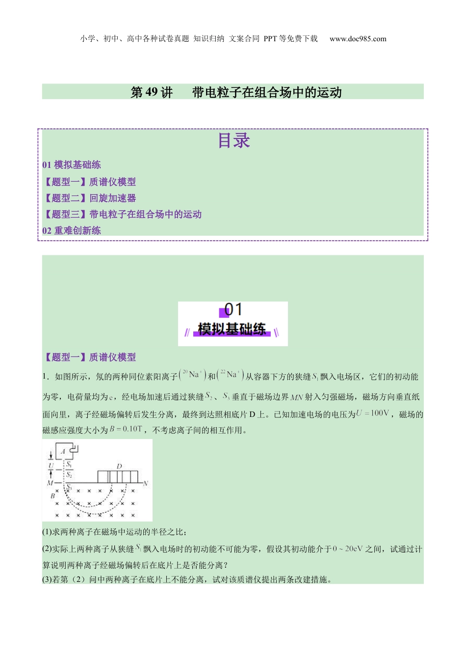 小学、初中、高中各种试卷真题知识归纳文案合同PPT等免费下载www.doc985.com第49讲带电粒子在组合场中的运动目录01模拟基础练【题型一】质谱仪模型【题型二】回旋加速器【题型三】带电粒子在组合场中的运动02重难创新练【题型一】质谱仪模型1.如图所示,氖的两种同位素阳离子和从容器下方的狭缝飘入电场区,它们的初动能为零,电荷量均为,经电场加速后通过狭缝、垂直于磁场边界射入匀强磁场,磁场方向垂直纸面向里,离子经磁场偏转后发生分离,最终到达照相底片D上。已知加速电场的电压为,磁场的磁感应强度大小为,不考虑离子间的相互作用。(1)求两种离子在磁场中运动的半径之比;(2)实际上两种离子从狭缝飘入电场时的初动能不可能为零,假设其初动能介于之间,试通过计算说明两种离子经磁场偏转后在底片上是否能分离?(3)若第(2)问中两种离子在底片上不能分离,试对该质谱仪提出两条改建措施。小学、初中、高中各种试卷真题知识归纳文案合同PPT等免费下载www.doc985.com【答案】(1)(2)有可能重叠(3)①增大加速电场电压;②减小B【详解】(1)离子在加速电场中被加速,由动能定理在磁场中做匀速圆周运动,洛伦兹力充当向心力解得两种离子在磁场中运动的半径之比(2)假设,,,则在加速电场中由动能定理解得在磁场中运动的半径所以轨迹有可能重叠。(3)改建措施:①增大加速电场电压;②减小B;2.如图所示是中国科学院自主研制的磁约束核聚变实验装置中的“偏转系统”原理图。由正离子和中性粒子组成的多样性粒子束通过两极板间的电场后进入偏转磁场。其中的中性粒子沿原方向运动,被接收板接收;一部分离子打到左极板,其余的进入磁场发生偏转被吞噬板吞噬并发出荧光。多样性粒子束的宽度为L,粒子均横向均匀分布。偏转磁场为垂直于纸面向外的矩形匀强磁场,磁感强度为。已知离子的比荷为k,两极板间的电压为U、间距为L,极板长度为2L,吞噬板长度为2L并紧靠负极板。若离子和中性粒子的重力、相互作用力,极板厚度可忽略不计。小学、初中、高中各种试卷真题知识归纳文案合同PPT等免费下载www.doc985.com(1)要使速度的离子能沿直线通过两极板间的电场,可在极板间施加一垂直于纸面的匀强磁场,求的大小;(2)调整极板间的磁场,使速度的离子沿直线通过极板后进入偏转磁场。若且上述离子全部能被吞噬板吞噬,求偏转磁场的最小面积和吞噬板的发光长度;(3)若撤去极板间磁场且偏转磁场边界足够大,速度的离子有n个,能进入磁场的离子全部能被吞噬板吞噬,求的取值范围及吞噬板上收集的离子个数。【答案】(1)(2),(3),【详解】(1)速度的离子能沿直线通过两极板间的电场,离子受到的电场力与洛伦兹力平衡,则电场强度为解得(2)洛伦兹力提供向心力小学、初中、高中各种试卷真题知识归纳文案合同PPT等免费下载www.doc985.com解得作出离子的运动轨迹,如图所示上述离子全部能被吞噬板吞噬,分析可知偏转磁场为最小面积矩形时,紧贴负极板射入磁场的粒子射出磁场时,沿直线运动能恰打在吞噬板的最左端。设该轨迹圆心到磁场左边界的距离为a,由相似三角形的几何关系得解得偏转磁场的最小面积有上述分析可知,其发光长度一个临界在吞噬板的端点,另一个临界点是从正极板射出的离子所打的位置,由于其在磁场中轨迹为半圆,所以打在距离正极板处,所以发光长度(3)离子在电场中做类平抛运动,则离子在电场中的加速度为解得小学、初中、高中各种试卷真题知识归纳文案合同PPT等免费下载www.doc985.com吞噬板上收集的离子个数洛伦兹力提供向心力进入磁场离子圆周运动半径在磁场中偏转距离速度为的离子射出偏转电场时,对于进入磁场的左右两边界离子而言,与吞噬板左右两端相距分别为2L、,设离子恰好打到吞噬板两端,由几何关系得解得3.质谱仪是科学研究中的重要仪器,其原理如图所示。I为粒子加速器,加速电压为U;Ⅱ为速度选择器,匀强电场的电场强度大小为,方向沿纸面向下,匀强磁场的磁感应强度大小为,方向垂直纸面向里;Ⅱ为偏转分离器,匀强磁场的磁感应强度大小为,方向垂直纸面向里。从S点释放初速度为零的带电粒子(不计重力),加速后进入速度选择器做直线运动,再经O点的...