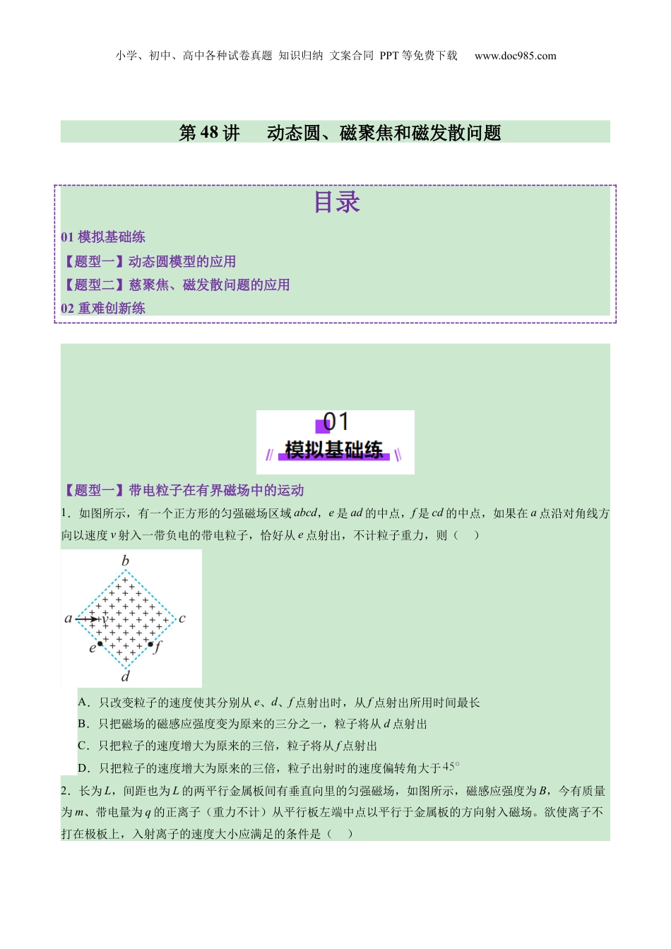 小学、初中、高中各种试卷真题知识归纳文案合同PPT等免费下载www.doc985.com第48讲动态圆、磁聚焦和磁发散问题目录01模拟基础练【题型一】动态圆模型的应用【题型二】慈聚焦、磁发散问题的应用02重难创新练【题型一】带电粒子在有界磁场中的运动1.如图所示,有一个正方形的匀强磁场区域abcd,e是ad的中点,f是cd的中点,如果在a点沿对角线方向以速度v射入一带负电的带电粒子,恰好从e点射出,不计粒子重力,则()A.只改变粒子的速度使其分别从e、d、f点射出时,从f点射出所用时间最长B.只把磁场的磁感应强度变为原来的三分之一,粒子将从d点射出C.只把粒子的速度增大为原来的三倍,粒子将从f点射出D.只把粒子的速度增大为原来的三倍,粒子出射时的速度偏转角大于2.长为L,间距也为L的两平行金属板间有垂直向里的匀强磁场,如图所示,磁感应强度为B,今有质量为m、带电量为q的正离子(重力不计)从平行板左端中点以平行于金属板的方向射入磁场。欲使离子不打在极板上,入射离子的速度大小应满足的条件是()小学、初中、高中各种试卷真题知识归纳文案合同PPT等免费下载www.doc985.com①②③④A.①②B.①③C.②③D.②④3.一匀强磁场的磁感应强度大小为B,方向垂直于纸面向外,其边界如图中虚线所示,,,一束粒子,在纸面内从a点垂直于ab射入磁场,这些粒子具有各种速率。不计粒子之间的相互作用。已知粒子的质量为3m,电荷量为q。以下正确的为()A.粒子能到达de中点B.从bc边界出的粒子运动时间相等C.在磁场中运动时间最长的粒子,其运动率为D.粒子在磁场中运动的最长时间为4.如图所示,一个边界为PQ、MN(两边界上有磁场)的足够大的匀强磁场区域,宽度为d,磁场方向垂直纸面向里。O点处有一体积可忽略的粒子发射装置,能够在纸面内向磁场各个方向连续、均匀地发射速度大小相等的质子,发现从磁场MN边界射出的质子数占总数的三分之一,不计质子间相互作用及重力,则MN边界上有质子射出的区域长度为()A.B.C.D.5.如图所示,平行边界MN、PQ间有垂直纸面向里的匀强磁场,磁场的磁感应强度大小为B,两边界长小学、初中、高中各种试卷真题知识归纳文案合同PPT等免费下载www.doc985.com度足够长,间距为d,MN上有一粒子源A,可在纸面内沿各个方向向磁场中射入质量均为m、电荷量均为q的带正电的粒子,粒子射入磁场的速度,不计粒子的重力,则粒子能从PQ边界射出磁场的区域长度为()A.dB.C.2dD.6.如图所示,在足够长的荧光屏MN上方分布了水平方向的匀强磁场,磁感应强度的大小B=0.1T、方向与纸面垂直。距离荧光屏h=8cm处有一粒子源S,以速度v=5×105m/s不断地在纸面内向各个方向发射比荷的带正电粒子,不计粒子的重力。则粒子打在荧光屏范围的长度为()A.10cmB.12cmC.20cmD.24cm【题型二】带电粒子在磁场中的多解、临界问题7.带电粒子流的磁聚焦是薄膜材料制备的关键技术之一、磁聚焦原理如图,真空中一半径为r的圆形区域内存在垂直纸面的匀强磁场,一束宽度为2r、沿x轴正方向运动的带电粒子流射入该磁场后汇聚于坐标原点O。已知粒子的质量均为m、电荷量均为q、进入磁场的速度均为v,不计带电粒子的重力及粒子间的相互作用力。则磁感应强度的大小应为()小学、初中、高中各种试卷真题知识归纳文案合同PPT等免费下载www.doc985.comA.B.C.D.8.我国研制的世界首套磁聚焦霍尔电推进系统已经完成了全部在轨飞行验证工作,可作为太空发动机使用,带电粒子流的磁聚焦是其中的关键技术之一。如图,实线所示的两个圆形区域内存在垂直于纸面的匀强磁场I、Ⅱ,磁感应强度分别为,。两圆半径均为r,相切于O点。一束宽度为的带电粒子流沿x轴正方向射入后都汇聚到坐标原点O。已知粒子的质量均为m、电荷量均为、进入磁场的速度均为v,不计带电粒子的重力及粒子间的相互作用力。下列说法正确的是()A.的大小为B.从O点进入磁场Ⅱ的粒子的速度仍相等C.若,则粒子在磁场Ⅱ的边界的射出点在六分之一圆周上D.若,则粒子在磁场Ⅱ中运动的最长时间为9.利用磁聚焦和磁控束可以改变一束平行带电粒子的宽度,人们把此原理运用到薄膜材料制备上,使芯片技术得到飞速发...