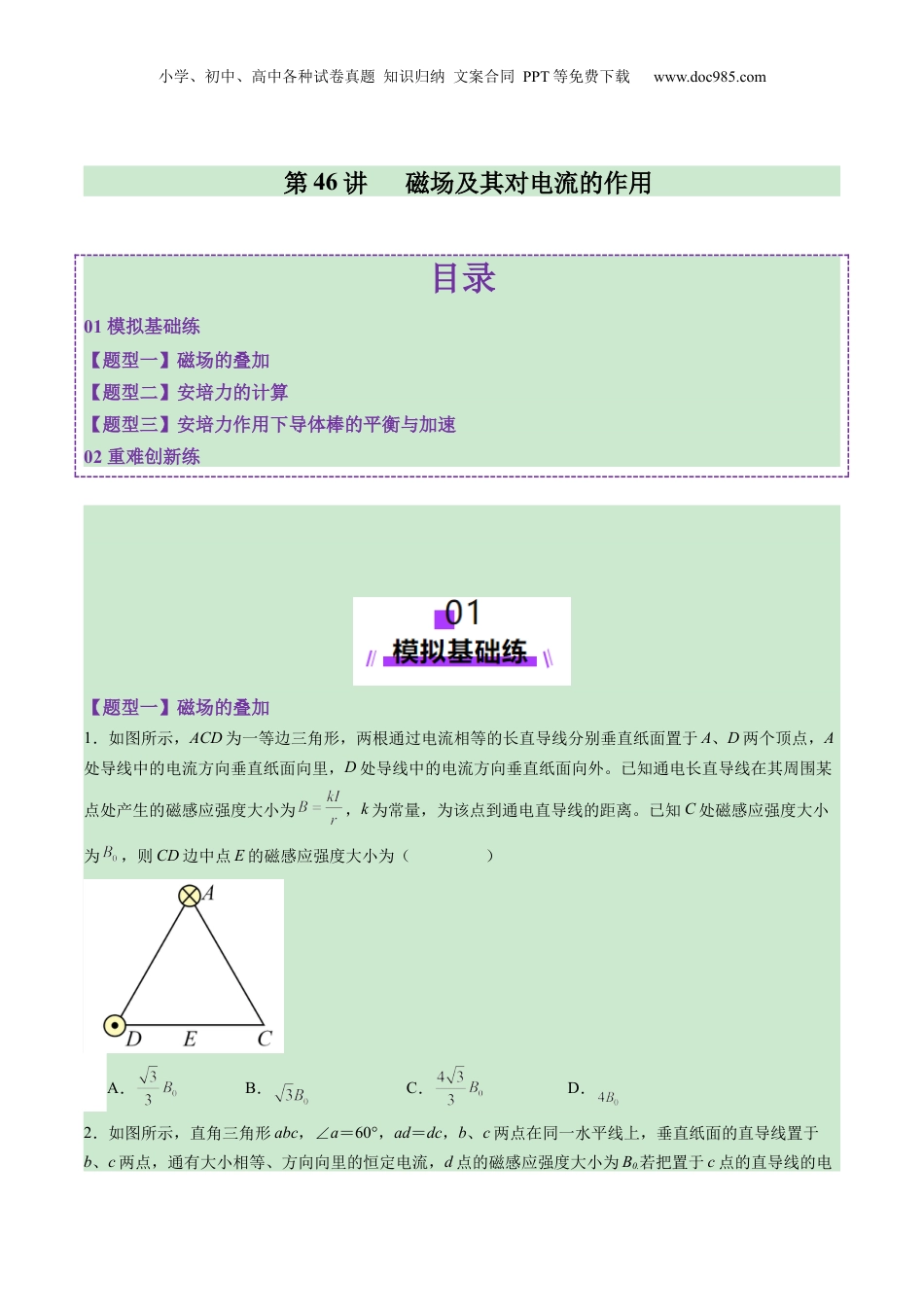 小学、初中、高中各种试卷真题知识归纳文案合同PPT等免费下载www.doc985.com第46讲磁场及其对电流的作用目录01模拟基础练【题型一】磁场的叠加【题型二】安培力的计算【题型三】安培力作用下导体棒的平衡与加速02重难创新练【题型一】磁场的叠加1.如图所示,ACD为一等边三角形,两根通过电流相等的长直导线分别垂直纸面置于A、D两个顶点,A处导线中的电流方向垂直纸面向里,D处导线中的电流方向垂直纸面向外。已知通电长直导线在其周围某点处产生的磁感应强度大小为,k为常量,为该点到通电直导线的距离。已知C处磁感应强度大小为,则CD边中点E的磁感应强度大小为()A.B.C.D.2.如图所示,直角三角形abc,∠a=60°,ad=dc,b、c两点在同一水平线上,垂直纸面的直导线置于b、c两点,通有大小相等、方向向里的恒定电流,d点的磁感应强度大小为B0.若把置于c点的直导线的电小学、初中、高中各种试卷真题知识归纳文案合同PPT等免费下载www.doc985.com流反向,大小保持不变,则变化后d点的磁感应强度()A.大小为B0,方向水平向左B.大小为B0,方向竖直向下C.大小为B0,方向水平向右D.大小为2B0,方向竖直向下3.如图所示,三根长直导线通有大小相同的电流,分别放在正方形ABCD的三个顶点,其中A、B处导线电流方向垂直纸面向外,C处导线电流方向垂直纸面向里,此时正方形中心O点的磁感应强度大小为。若将C处的导线撤去,则O点处的磁感应强度大小为()A.B.C.D.4.如图,两长直导线P和Q垂直于纸面固定放置,两者之间的距离为l,纸面内的a点与两导线距离均为l。已知导线P通电流I、导线Q不通电流时a点的磁感应强度大小为B。现在两导线中均通有方向垂直于纸面向里的电流I,则下列关于a点处磁感应强度的说法正确的是()A.a点的磁感应强度为0B.a点的磁感应强度的大小为BC.a点的磁感应强度垂直PQ的连线向上D.a点的磁感应强度平行PQ的连线向右5.如图所示,两平行导轨在同一水平面内。质量为导体棒垂直放在导轨上,棒与导轨间的动摩擦因数恒定。整个装置置于匀强磁场中,磁感应强度大小恒定,方向与金属棒垂直、与水平向右方向的夹角可小学、初中、高中各种试卷真题知识归纳文案合同PPT等免费下载www.doc985.com调。导体棒沿导轨向右运动,现给导体棒通以图示方向的恒定电流,适当调整磁场方向,可以使导体棒沿导轨做匀加速运动或匀减速运动。已知导体棒加速时,加速度的最大值为;减速时,加速度的最大值为,其中为重力加速度大小。(1)求:棒与导轨间的动摩擦因数;(2)若已知导体棒电流为,导轨间距为,求:磁感应强度大小。【题型二】安培力的计算6.边长L的硬轻质正三角形导线框abc置于竖直平面内,ab边水平,绝缘细线下端c点悬挂重物,匀强磁场大小为B垂直纸面向里。现将a、b接在输出恒定电流电源的正负极上,当ab边的电流强度为I,重物恰好对地无压力,则重物重力的大小为()A.BILB.C.D.2BIL7.如图所示,空间中存在水平向右的匀强磁场,磁感应强度大小为,半径为的圆弧形导线MN所对应的圆心角为,其中端点的连线与竖直方向的夹角为,现在导线中通有从到的电流,电流的大小为.则下列说法正确的是()A.导线所受的安培力大小为B.以点为轴,使导线沿逆时针方向转过,导线所受的安培力大小为0C.以点为轴,使导线沿顺时针方向转过,导线所受的安培力大小为小学、初中、高中各种试卷真题知识归纳文案合同PPT等免费下载www.doc985.comD.仅将磁场方向转至垂直纸面向外,导线所受的安培力大小为8.将长度的导线ac从中点b折成如图所示的形状,放于B=0.08T的匀强磁场中,abc平面与磁场垂直。若在导线abc中通入I=25A的直流电,则整个导线所受安培力的大小为()A.B.C.2ND.3N9.由均匀的电阻丝制成的半径为r的圆形导线框,存在导线框平面向里的匀强磁场,磁感应强度大小为B,将P、Q两点接入如图示的电压恒定的电源两端,通电时电流表示数为I,则线框所受安培力大小为()A.BIrB.C.D.【题型三】安培力作用下导体棒的平衡与加速10.在倾角的光滑导体滑轨的上端接入一个电动势,内阻的电源,滑轨间距,将一个质量,电阻的金属棒水平放置在滑轨上。若滑轨所在空间加一...