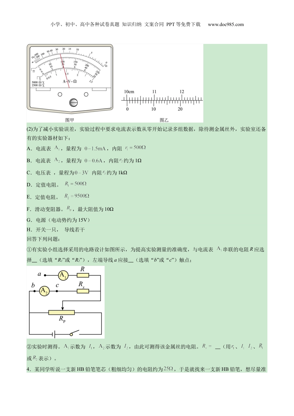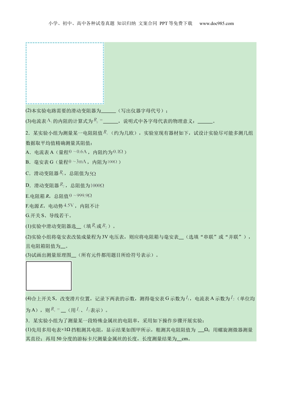 小学、初中、高中各种试卷真题知识归纳文案合同PPT等免费下载www.doc985.com第45讲创新思维--测量电阻常用的5种方法及定值电阻的妙用目录01模拟基础练【题型一】双安法测电阻【题型二】双伏法测电阻【题型三】等效替代法测电阻【题型四】半偏法测电阻【题型五】电桥平衡法测电阻02重难创新练【题型一】双安法测电阻1.要测量未知的电流表的内阻,给出下列器材:电流表:量程3mA,内阻约200Ω左右电流表:量程10mA,内阻约100Ω左右电压表V:量程10V,内阻约为十几kΩ定值电阻:滑动变阻器:滑动变阻器:干电池:,内阻未知开关S一个、导线若干(1)在方框中画出实验电路设计图,要求电路可以调节使得电表的电流或电压的读数从零开始逐渐增大:小学、初中、高中各种试卷真题知识归纳文案合同PPT等免费下载www.doc985.com(2)本实验电路需要的滑动变阻器为(写出仪器字母代号);(3)电流表的内阻的计算式为,说明式中各字母代表的物理意义:。2.某实验小组为测量某一电阻阻值(约为几欧),实验室现有器材如下,试设计实验尽可能多测几组数据取平均值精确测量其阻值:A.电流表A(量程,内阻约为)B.毫安表G(量程,内阻为)C.滑动变阻器,总阻值为D.滑动变阻器,总阻值为E.电阻箱R,总阻值F.电源E,电动势,内阻不计G.开关S、导线若干。(1)实验中滑动变阻器选(填或)。(2)实验小组将毫安表改装成量程为3V电压表,则应将电阻箱与毫安表(选填“串联”或“并联”),且电阻箱阻值为。(3)试画出测量原理图(所有元件都用题目所给符号表示)。(4)合上开关S,改变滑片位置,记录下两表的示数,测得毫安表G示数为,电流表A示数为(单位均为A),则(用、表示)。3.某实验小组为了测量某一段特殊金属丝的电阻率,采用如下操作步骤开展实验:(1)先用多用电表×1Ω挡粗测其电阻,显示结果如图甲所示,粗测其电阻阻值为Ω;用螺旋测微器测量其直径;再用50分度的游标卡尺测量金属丝的长度,长度测量结果为cm。小学、初中、高中各种试卷真题知识归纳文案合同PPT等免费下载www.doc985.com(2)为了减小实验误差,实验过程中要求电流表示数从零开始记录多组数据,除待测金属丝外,实验室还备有的实验器材如下:A.电流表,量程为,内阻B.电流表,量程为,内阻约为1ΩC.电压表,量程为内阻约为1kΩD.定值电阻。E.定值电阻。F.滑动变阻器。,最大阻值为10ΩG.电源(电动势约为15V)H.开关一只,导线若干回答下列问题:①有实验小组选择采用的电路设计如图所示,为提高实验测量的准确度,与电流表串联的电阻R应选择(选填“R1”或“R2”),左端导线a应接(选填“b”或“c”)触点;②实验时测得。示数为,示数为,由此可测得该金属丝的电阻。(用、、或表示)。4.某同学听说一支新HB铅笔笔芯(粗细均匀)的电阻约为,于是就找来一支新HB铅笔,想尽量准小学、初中、高中各种试卷真题知识归纳文案合同PPT等免费下载www.doc985.com确地测出这支铅笔笔芯的电阻,他从实验室找到如下器材:A.电源E:电动势约为3.0V;B.电流表:量程为,内阻;C.电流表:量程为0~10mA,内阻;D.电流表:量程为0~100mA,内阻;E.滑动变阻器:最大阻值为;F.滑动变阻器:最大阻值为;G.电阻箱,最大阻值;H.开关S,导线若干。(1)根据实验室提供的仪器,他设计图所示的电路,图中电流表a应选用,电流表b应选用;滑动变阻器R应选用。(均选填器材前的字母)(2)将电阻箱阻值调成合适的值,调节滑动变阻器的滑片,记录电流表a的示数和电流表b的示数,根据测得的多组数据描绘出图像,图像的斜率为k,则铅笔电阻的阻值(用k,,,或表示)。【题型二】双伏法测电阻5.某兴趣小组根据以下器材想要精确测量电压表的内阻,该电压表量程为3V,内阻大约为2kΩ,除此以外提供的器材有:A.电源E(电动势9V,内阻忽略不计)B.电压表,(量程15V,内阻约为5kΩ)C.滑动变阻器(阻值范围为0~10Ω)D.定值电阻E.定值电阻F.开关一个,导线若干(1)实验过程中为了减小实验误差,需多次测量且要求电表示数至少要达到量程的,则定值电阻应该选小学、初中、高中各种试卷真题知识归纳文案合同PPT等免费下载www.doc985.com(填器...