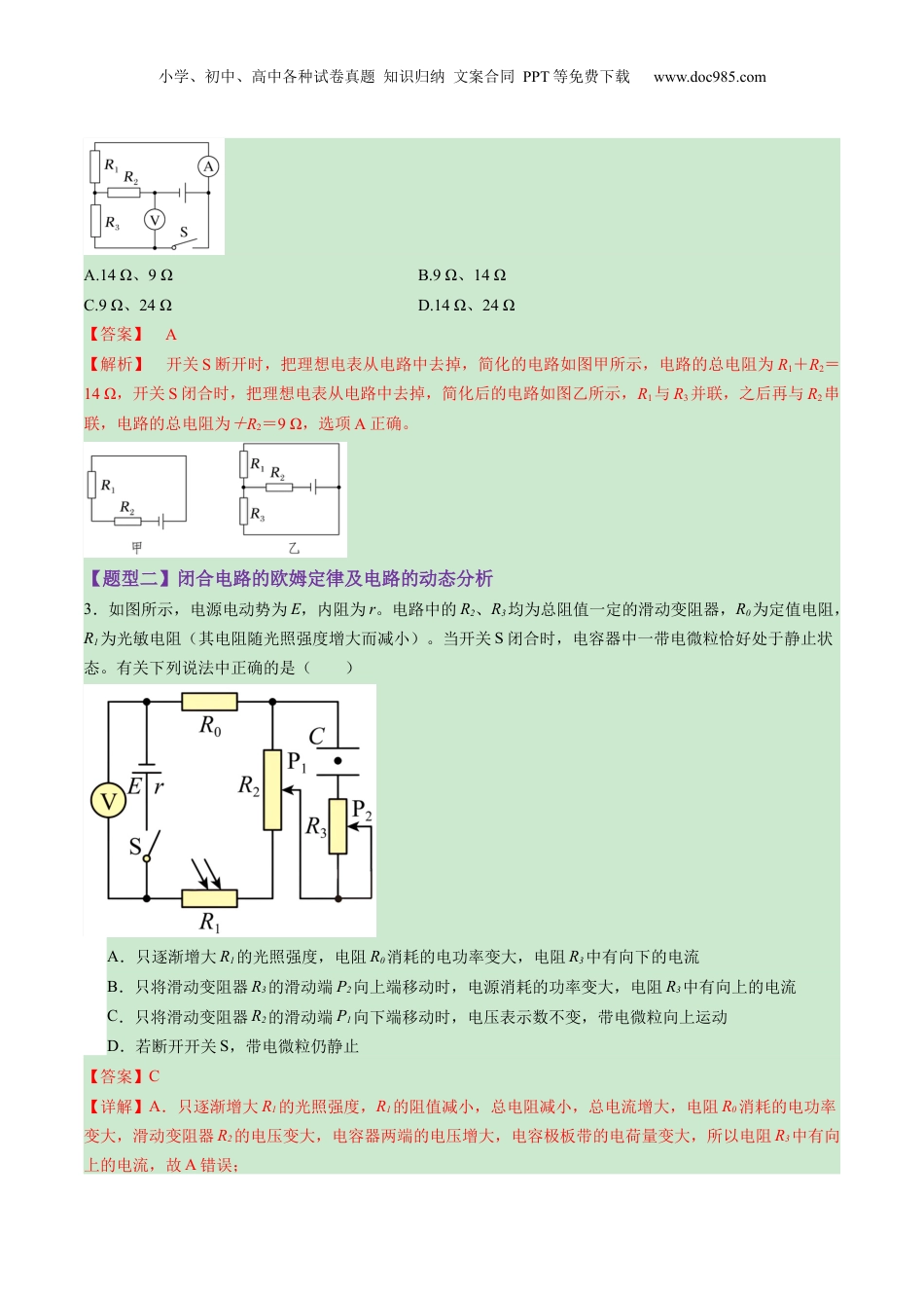 小学、初中、高中各种试卷真题知识归纳文案合同PPT等免费下载www.doc985.com第40讲电路的基本概念及规律目录01模拟基础练【题型一】串、并联电路的规律及应用【题型二】闭合电路的欧姆定律及电路的动态分析【题型三】闭合电路的功率和效率问题【题型四】电源的U-I图像与电阻的U-I图像的比较02重难创新练【题型一】串、并联电路的规律及应用1.如图所示,电路两端的电压U保持不变,电阻R1、R2、R3消耗的电功率一样大,则R1∶R2∶R3是()A.111∶∶B.411∶∶C.144∶∶D.122∶∶【答案】C【解析】电阻R1、R2、R3消耗的电功率一样大,R2、R3并联则U2=U3,由P==UI,可知R2∶R3=11∶,I2=I3,R2、R3并联后与R1串联,则I1=I2+I3,可知I1=2I2,对R1、R2,由P=I2R,可知R1∶R2=I∶I=14∶,可得R1∶R2∶R3=144∶∶,故C正确。2.如图所示电路中,电源的内阻不计,R1=R3=10Ω,R2=4Ω,电流表、电压表均视为理想电表,开关S断开与闭合时,电路的总电阻分别为()小学、初中、高中各种试卷真题知识归纳文案合同PPT等免费下载www.doc985.comA.14Ω、9ΩB.9Ω、14ΩC.9Ω、24ΩD.14Ω、24Ω【答案】A【解析】开关S断开时,把理想电表从电路中去掉,简化的电路如图甲所示,电路的总电阻为R1+R2=14Ω,开关S闭合时,把理想电表从电路中去掉,简化后的电路如图乙所示,R1与R3并联,之后再与R2串联,电路的总电阻为+R2=9Ω,选项A正确。【题型二】闭合电路的欧姆定律及电路的动态分析3.如图所示,电源电动势为E,内阻为r。电路中的R2、R3均为总阻值一定的滑动变阻器,R0为定值电阻,R1为光敏电阻(其电阻随光照强度增大而减小)。当开关S闭合时,电容器中一带电微粒恰好处于静止状态。有关下列说法中正确的是()A.只逐渐增大R1的光照强度,电阻R0消耗的电功率变大,电阻R3中有向下的电流B.只将滑动变阻器R3的滑动端P2向上端移动时,电源消耗的功率变大,电阻R3中有向上的电流C.只将滑动变阻器R2的滑动端P1向下端移动时,电压表示数不变,带电微粒向上运动D.若断开开关S,带电微粒仍静止【答案】C【详解】A.只逐渐增大R1的光照强度,R1的阻值减小,总电阻减小,总电流增大,电阻R0消耗的电功率变大,滑动变阻器R2的电压变大,电容器两端的电压增大,电容极板带的电荷量变大,所以电阻R3中有向上的电流,故A错误;小学、初中、高中各种试卷真题知识归纳文案合同PPT等免费下载www.doc985.comB.电路稳定时,电容相当于开关断开,只调节电阻R3的滑动端P2向上端移动时,对电路没有影响,故B错误;C.由于电容相当于开关断开,滑动变阻器R2全部电阻接入电路中,只调节电阻R2的滑动端P1向下端移动时,电路总电阻不变,总电流不变,路端电压不变,电压表示数不变;但电阻R2与电容器并联部分的电阻变大,可知电容器两端的电压变大,由可知,电场强度变大,电场力变大,带电微粒将向上运动,故C正确;D.若断开电键S,电容器处于放电状态,电荷量变小,电容器板间电场变小,带电微粒受到的电场力变小,带电微粒将向下运动,故D错误。故选C。4.如图所示,电表均为理想电表,电源内阻的大小为r,两灯泡的电阻均为2r。闭合开关,此时,两灯泡正常发光。将滑动变阻器滑片向上滑动,电压表、示数变化量的绝对值分别、,电流表A示数变化量的绝对值为,则()A.灯泡变亮,灯泡变暗B.和的示数都减小C.始终保持与的比值是与的比值的2倍D.电源输出功率变大,效率增大【答案】C【详解】电路可简化为如图所示电路A.将滑片向上滑动,电路中的总电阻减小,总电流增大,通过两串联灯泡的电流始终一样且增大,两灯泡逐渐变亮,故A错误;B.电压表测量的是路端电压,电压表测量的是灯泡L1两端的电压,因为总电流增大,所以的示小学、初中、高中各种试卷真题知识归纳文案合同PPT等免费下载www.doc985.com数增大,的示数减小,故B错误;C.根据闭合电路欧姆定律可知则与的比值是与的比值的2倍,故C正确;D.当外电路电阻越接近电源内阻时,电源输出功率越大,滑动变阻器滑片向上滑动,外电阻与电源内阻相差越来越小,电源输出功率变大,电源的效率由于外电阻减小,则效率减小,故D错误;故选C。5.如图...