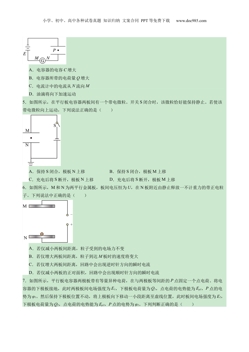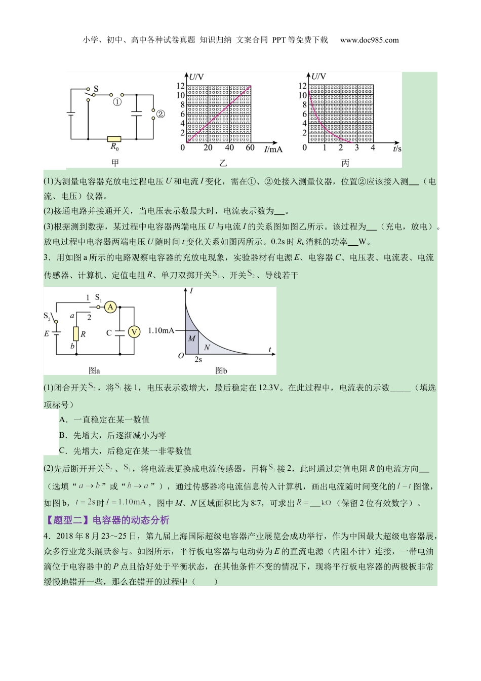 小学、初中、高中各种试卷真题知识归纳文案合同PPT等免费下载www.doc985.com第36讲电容器带电粒子在电场中的直线运动目录01模拟基础练【题型一】实验:观察电容器的充、放电现象【题型二】电容器的动态分析【题型三】电容器带电粒子在电场中的直线运动02重难创新练【题型一】实验:观察电容器的充、放电现象1.某实验小组在做“观察电容器放电”的实验时,按图甲所示连接电路,实验中使用电流传感器采集电流信息,绘制图像。(1)将单刀双掷开关接(选填“1”或“2”),对电容器进行充电。(2)放电过程的图像如图乙所示,图线与坐标轴所围成的面积表示电容器充电后所存储的电荷量,则电容器所带电荷量C(结果保留两位有效数字)。(3)若只增大滑动变阻器R的阻值,不改变电路其他参数,则放电过程中图线与坐标轴所围成的面积(选填“增大”、“减小”或“不变”)。2.探究电容器充放电规律,实验装置如图甲所示,有电源E,定值电阻R0,电容器C,单刀双置开关S。小学、初中、高中各种试卷真题知识归纳文案合同PPT等免费下载www.doc985.com(1)为测量电容器充放电过程电压U和电流I变化,需在①、②处接入测量仪器,位置②应该接入测(电流、电压)仪器。(2)接通电路并接通开关,当电压表示数最大时,电流表示数为。(3)根据测到数据,某过程中电容器两端电压U与电流I的关系图如图乙所示。该过程为(充电,放电)。放电过程中电容器两端电压U随时间t变化关系如图丙所示。0.2s时R0消耗的功率W。3.用如图a所示的电路观察电容器的充放电现象,实验器材有电源E、电容器C、电压表、电流表、电流传感器、计算机、定值电阻R、单刀双掷开关、开关、导线若干(1)闭合开关,将接1,电压表示数增大,最后稳定在12.3V。在此过程中,电流表的示数_____(填选项标号)A.一直稳定在某一数值B.先增大,后逐渐减小为零C.先增大,后稳定在某一非零数值(2)先后断开开关、,将电流表更换成电流传感器,再将接2,此时通过定值电阻R的电流方向(选填“”或“”),通过传感器将电流信息传入计算机,画出电流随时间变化的图像,如图b,时,图中M、N区域面积比为87∶,可求出(保留2位有效数字)。【题型二】电容器的动态分析4.2018年8月23~25日,第九届上海国际超级电容器产业展览会成功举行,作为中国最大超级电容器展,众多行业龙头踊跃参与。如图所示,平行板电容器与电动势为E的直流电源(内阻不计)连接,一带电油滴位于电容器中的P点且恰好处于平衡状态,在其他条件不变的情况下,现将平行板电容器的两极板非常缓慢地错开一些,那么在错开的过程中()小学、初中、高中各种试卷真题知识归纳文案合同PPT等免费下载www.doc985.comA.电容器的电容C增大B.电容器所带的电荷量Q增大C.电流计中的电流从N流向MD.油滴将向下加速运动5.如图所示,在平行板电容器两板间有一个带电微粒。开关S闭合时,该微粒恰好能保持静止。若使该带电微粒向上运动,下列说法正确的是()A.保持S闭合,极板N上移B.保持S闭合,极板M上移C.充电后将S断开,极板N上移D.充电后将S断开,极板M上移6.如图所示,M和N为两平行金属板,板间电压恒为U,在N板附近由静止释放一不计重力的带正电粒子。下列说法中正确的是()A.若仅减小两板间距离,粒子受到的电场力不变B.若仅增大两板间距离,粒子到达M板时的速度将变大C.若仅增大两板间距离,回路中会出现逆时针方向的瞬时电流D.若仅减小两板的正对面积,回路中会出现顺时针方向的瞬时电流7.如图所示,平行板电容器两极板带有等量异种电荷,在与两极板等间距的P点固定一个点电荷。将电容器的下极板接地,此时两极板间电场强度为E1,下极板电荷量为Q1,点电荷的电势能为Ep1,P点的电势为φ1。然后保持下极板位置不动,将上极板向下移动一小段距离至虚线位置,此时板间电场强度为E2,下极板电荷量为Q2,点电荷的电势能为Ep2,P点的电势为φ2。下列判断正确的是()小学、初中、高中各种试卷真题知识归纳文案合同PPT等免费下载www.doc985.comA.B.C.D.8.一平行板电容器充电后与电源断开,负极板接地,在两极板间有一正电荷(电荷量很小)固定在P点,如图所示。E表示极板间的场...