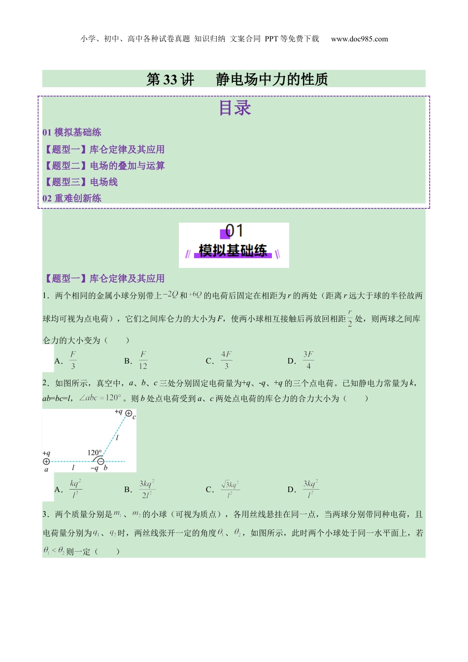 小学、初中、高中各种试卷真题知识归纳文案合同PPT等免费下载www.doc985.com第33讲静电场中力的性质目录01模拟基础练【题型一】库仑定律及其应用【题型二】电场的叠加与运算【题型三】电场线02重难创新练【题型一】库仑定律及其应用1.两个相同的金属小球分别带上和的电荷后固定在相距为r的两处(距离r远大于球的半径故两球均可视为点电荷),它们之间库仑力的大小为F,使两小球相互接触后再放回相距处,则两球之间库仑力的大小变为()A.B.C.D.2.如图所示,真空中,a、b、c三处分别固定电荷量为+q、-q、+q的三个点电荷。已知静电力常量为k,ab=bc=l,。则b处点电荷受到a、c两处点电荷的库仑力的合力大小为()A.B.C.D.3.两个质量分别是、的小球(可视为质点),各用丝线悬挂在同一点,当两球分别带同种电荷,且电荷量分别为、时,两丝线张开一定的角度、,如图所示,此时两个小球处于同一水平面上,若则一定()小学、初中、高中各种试卷真题知识归纳文案合同PPT等免费下载www.doc985.comA.B.C.D.q1<q24.点电荷Q1和q相距1m,Q1和q之间存在大小为F的斥力;点电荷Q2和q相距2m,Q2和q之间存在大小为3F的引力。关于Q1和Q2的电性以及电荷量之比,下列说法正确的是()A.Q1和Q2带异种电荷,Q1:Q2=1:12B.Q1和Q2带异种电荷,Q1:Q2=1:6C.Q1和Q2带同种电荷,Q1:Q2=1:12D.Q1和Q2带同种电荷Q1:Q2=1:65.A、B、C三点在同一直线上,AB∶BC=11∶,B点位于A、C之间,在A处固定一电荷量为Q的点电荷。当在B处放一电荷量为-q的点电荷时,Q所受的静电力为F;移去B处电荷,在C处放一电荷量为-2q的点电荷,则Q所受的静电力为()A.B.C.D.F【题型二】电场的叠加与运算6.如图所示,水平直线上有三点,,空间存在着竖直方向上的匀强电场(图中未画出)。若将一个电荷量为的点电荷放在A点,则点的场强大小为;若将这个电荷量为的点电荷放在点,则点的场强大小变为,则匀强电场的场强大小为()A.B.C.D.7.在静电场中有a、b两点,试探电荷在a、b两点所受的静电力大小F与电荷量q满足如图所示的关系。a,b两点的电场强度大小之比为()小学、初中、高中各种试卷真题知识归纳文案合同PPT等免费下载www.doc985.comA.11∶B.12∶C.21∶D.14∶8.如图所示,等量异种点电荷分别固定在以O为圆心的半圆弧直径a、b两点,此时O点的电场强度为;若b点的负电荷固定不动,而将a点的正电荷沿圆弧逆时针转过后固定在c点时,此时O点的电场强度为,则与之比为()A.21∶B.12∶C.D.9.如图所示,在场强方向水平向右、大小为E的匀强电场中,在O点固定一电荷量为Q的正电荷,A、B、C、D为以O为圆心、半径为r的同一圆周上的四点,B、D连线与电场线平行,A、C连线与电场线垂直,则()A.A点的电场强度大小为B.B点的电场强度大小为E-C.D点的电场强度大小不可能为0D.A、C两点的电场强度相同10.在某一点电荷产生的电场中,A、B两点的电场强度方向如图所示,则A、B两点的电场强度大小之比为()小学、初中、高中各种试卷真题知识归纳文案合同PPT等免费下载www.doc985.comA.1:3B.3:1C.1:4D.4:1【题型三】电场线11.如图,将带负电的试探电荷沿着等量异种点电荷连线的中垂线从A点移动到B点,再沿连线从B点移动到C点。该试探电荷()A.从A到B过程中所受的静电力减小B.从B到C过程中所受的静电力增大C.从A到B过程中的电势能增大D.从B到C过程中的电势能减小12.如图所示,竖直平面内有两个固定的点电荷,电荷量均为+Q,与其连线中点O的距离均为h,质量为m、电荷量为-q的试探电荷以O为圆心垂直两固定的点电荷的连线做匀速圆周运动,圆周上的两点A、B与O在同一直线上,A、B两点各自和两个正点电荷连线与AB连线的夹角均为θ=30°,已知静电力常量为k,重力忽略不计,则()A.试探电荷做匀速圆周运动所需的向心力大小为B.若将θ增大,试探电荷仍能以O为圆心做匀速圆周运动,则试探电荷的向心力可能变小C.试探电荷做匀速圆周运动的角速度为D.若在A点由静止释放负点电荷,该电荷将加速到达B点13.如图,实线表示空间中某电场的电场线,A、B为电场中的两点,用、分别表示A、B两点的电...