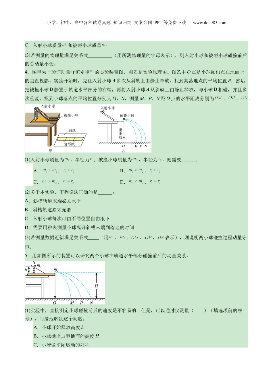 小学、初中、高中各种试卷真题知识归纳文案合同PPT等免费下载www.doc985.com第29讲实验:验证动量守恒定律目录01模拟基础练【题型一】教材原型实验【题型二】实验的拓展创新02重难创新练【题型一】教材原型实验1.用如图所示的装置做“验证动量守恒定律”的实验。(1)本实验要求轨道末端切线水平,入射小球和被碰小球半径相同,在同一组实验中,入射小球(选填“必须”或“不必须”)从同一位置由静止释放。(2)在入射小球的质量大于被撞小球质量的前提下,实验中需要测量的有________。A.入射小球和被碰小球的质量、B.入射小球开始的释放高度hC.小球抛出点距地面的高度HD.两球相碰前后的平抛射程OB、OA、OC(3)该实验需要验证的关系式为;若进一步研究该碰撞是否为弹性碰撞,还需要判断关系式是否成立。(用(2)中的物理量表示)2.利用图示的实验装置对碰撞过程进行研究。让质量为m1的滑块A与质量为m2的静止滑块B在水平气垫导轨上发生碰撞,碰撞时间极短,比较碰撞后A和B的速度大小和,进而分析碰撞过程是否为弹性碰撞。完成下列填空:小学、初中、高中各种试卷真题知识归纳文案合同PPT等免费下载www.doc985.com(1)开动气泵,调节气垫导轨,直至看到导轨上的滑块能在短时间内保持静止,可认为气垫导轨;(2)要使碰撞后两滑块运动方向相反,应使滑块A的质量m1滑块B的质量m2(选填“大于”、“小于”或“等于”)。(3)调节B的位置,使得A与B接触时,A的左端到左边挡板的距离与B的右端到右边挡板的距离相等。(4)使A以一定的初速度沿气垫导轨运动,并与B碰撞,分别用传感器记录A和B从碰撞时刻开始到各自撞到挡板所用的时间和,则碰后A的速度为,B的速度为。(用、、、表示)(5)将B放回到碰撞前的位置,改变A的初速度大小,多次重复步骤(4)。(6)由(4)(5)数据得到的平均值。(7)理论研究表明,对本实验的碰撞过程,是否为弹性碰撞可由判断。若两滑块的碰撞为弹性碰撞,则的理论表达式为;因此,如果(6)中的实际平均值与(7)中理论值结果间的差别在允许范围内,则可认为滑块A与滑块B在导轨上的碰撞为弹性碰撞。3.某同学用如图甲所示装置做“验证动量守恒定律”实验。图中O是斜槽水平末端在记录纸上的垂直投影点,P为未放被碰小球时入射小球的平均落点,M为与被碰小球碰后入射小球的平均落点,N为被碰小球的平均落点。(1)下列说法正确的是______。A.为完成此实验,必须使用的测量器材有天平、秒表、刻度尺B.安装轨道时,轨道末端必须水平C.同一组实验中,入射小球必须从同一位置由静止释放D.入射小球的质量小于被碰小球的质量,两球的半径相同(2)实验中,除测量平抛射程OM、ON、OP外,还需要测量的物理量有______。(填序号)A.入射小球开始释放高度hB.抛出点距地面的高度H小学、初中、高中各种试卷真题知识归纳文案合同PPT等免费下载www.doc985.comC.入射小球质量和被碰小球质量(3)若测量的物理量满足关系式(用所测物理量的字母表示),则入射小球和被碰小球碰撞前后的总动量不变。4.图甲为“验证动量守恒定律”的实验装置图,图乙是实验原理图。图乙中O点是小球抛出点在地面上的垂直投影。实验开始时,先让入射小球A多次从斜轨上由静止释放,找到其落地点的平均位置P,然后把被撞小球B静置于轨道水平部分的右端,再将入射小球A从斜轨上由静止释放,与小球B相碰,并且多次重复,找到小球落点的平均位置分别为M、N,测量M、P、N距O点的水平距离分别为、、。(1)入射小球质量为,半径为;被撞小球质量为,半径为,则需要______;A.,B.,C.,D.,(2)关于本实验,下列说法正确的是______;A.斜槽轨道末端必须水平B.斜槽轨道必须光滑C.入射小球每次可由不同位置自由滚下D.需要用秒表测量小球离开斜槽末端到落地的时间(3)若测量数据近似满足关系式(用、、、、表示),则说明两小球碰撞过程动量守恒。5.用如图所示的装置可以研究两个小球在轨道水平部分碰撞前后的动量关系。(1)实验中,直接测定小球碰撞前后的速度是不容易的。但是,可以通过仅测量()(填选项前的序号),间接地解决这个问题。A.小球开始释放高度hB.小球抛出点距地面的高度HC.小...