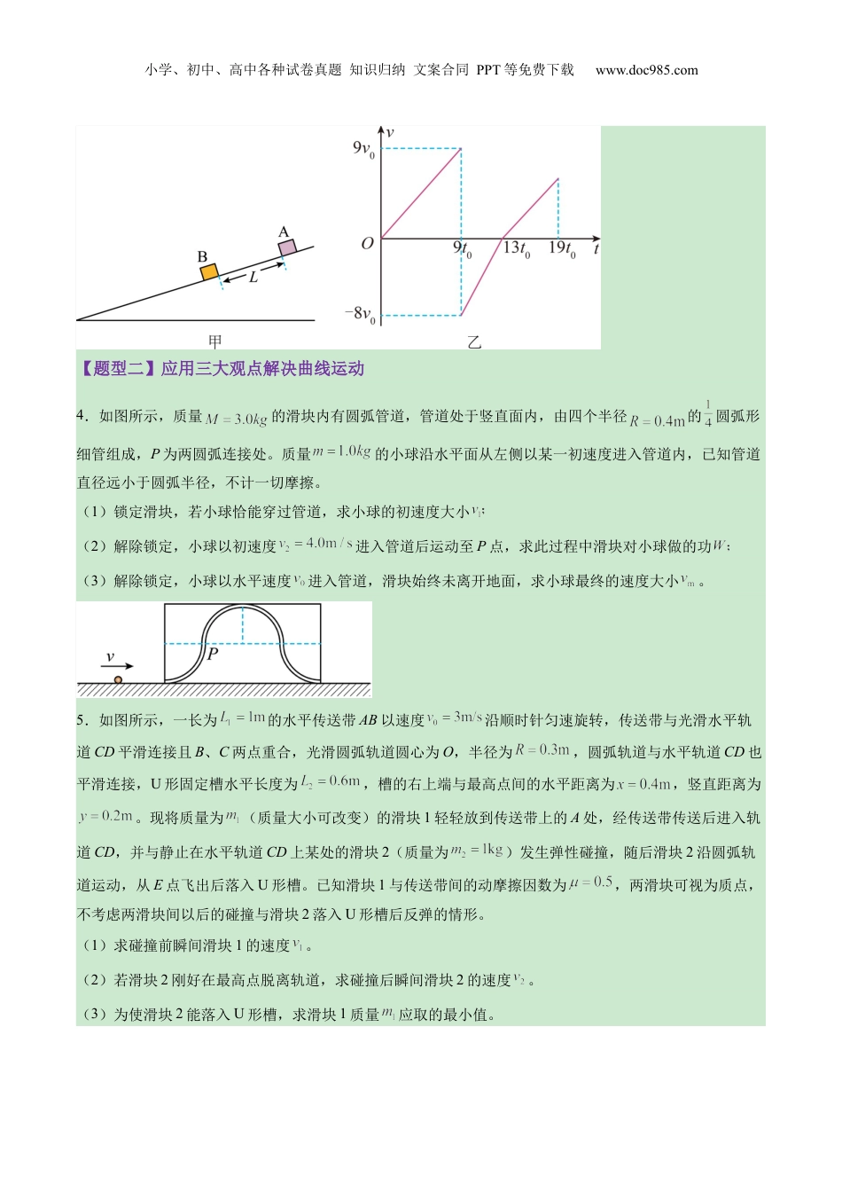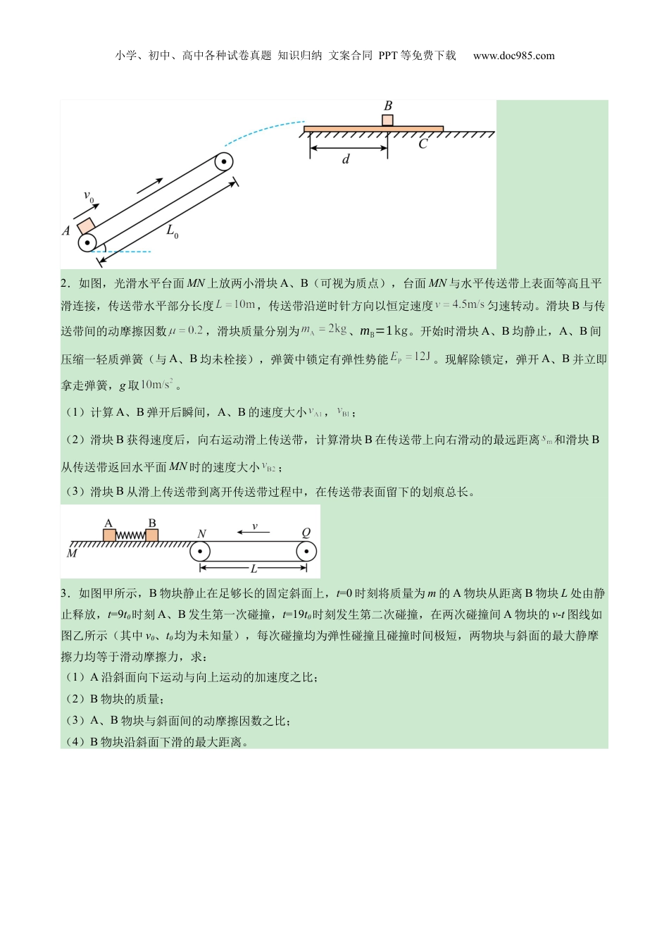 小学、初中、高中各种试卷真题知识归纳文案合同PPT等免费下载www.doc985.com第28讲三大观点解决力学问题目录01模拟基础练【题型一】应用三大观点解决直线运动【题型二】应用三大观点解决曲线运动02重难创新练【题型一】应用三大观点解决直线运动1.如图,传送带长以的速度沿顺时针方向匀速转动,传送带的倾角,在其右上侧有一水平平台,木板C的左端与平台左端对齐放置,小物块B静置于木板上,B距木板C左端的距离,B、C的质量分别为、。质量的小物块A以的初速度从传送带下端滑上传送带,A离开传送带后,恰好无碰撞地滑上木板C的上表面,经过一段时间与物块B发生弹性碰撞,碰撞时间忽略不计。已知A与传送带间动摩擦因数,A、B与C间动摩擦因数均为,木板C与平台间动摩擦因数,重力加速度,木板厚度不计。两质量相等的物体发生弹性碰撞,碰后两物体彼此交换速度,计算结果可保留根式形式,求(1)物块A滑离传送带时的速度大小;(2)平台左端与传送带上端间的水平距离;(3)物块A与物块B碰撞前瞬间A的速度大小;(4)要使物块B不从木板C上滑落,木板的最小长度。小学、初中、高中各种试卷真题知识归纳文案合同PPT等免费下载www.doc985.com2.如图,光滑水平台面MN上放两小滑块A、B(可视为质点),台面MN与水平传送带上表面等高且平滑连接,传送带水平部分长度,传送带沿逆时针方向以恒定速度匀速转动。滑块B与传送带间的动摩擦因数,滑块质量分别为、mB=1kg。开始时滑块A、B均静止,A、B间压缩一轻质弹簧(与A、B均未栓接),弹簧中锁定有弹性势能。现解除锁定,弹开A、B并立即拿走弹簧,g取。(1)计算A、B弹开后瞬间,A、B的速度大小,;(2)滑块B获得速度后,向右运动滑上传送带,计算滑块B在传送带上向右滑动的最远距离和滑块B从传送带返回水平面MN时的速度大小;(3)滑块B从滑上传送带到离开传送带过程中,在传送带表面留下的划痕总长。3.如图甲所示,B物块静止在足够长的固定斜面上,t=0时刻将质量为m的A物块从距离B物块L处由静止释放,t=9t0时刻A、B发生第一次碰撞,t=19t0时刻发生第二次碰撞,在两次碰撞间A物块的v-t图线如图乙所示(其中v0、t0均为未知量),每次碰撞均为弹性碰撞且碰撞时间极短,两物块与斜面的最大静摩擦力均等于滑动摩擦力,求:(1)A沿斜面向下运动与向上运动的加速度之比;(2)B物块的质量;(3)A、B物块与斜面间的动摩擦因数之比;(4)B物块沿斜面下滑的最大距离。小学、初中、高中各种试卷真题知识归纳文案合同PPT等免费下载www.doc985.com【题型二】应用三大观点解决曲线运动4.如图所示,质量的滑块内有圆弧管道,管道处于竖直面内,由四个半径的圆弧形细管组成,P为两圆弧连接处。质量的小球沿水平面从左侧以某一初速度进入管道内,已知管道直径远小于圆弧半径,不计一切摩擦。(1)锁定滑块,若小球恰能穿过管道,求小球的初速度大小(2)解除锁定,小球以初速度进入管道后运动至P点,求此过程中滑块对小球做的功(3)解除锁定,小球以水平速度进入管道,滑块始终未离开地面,求小球最终的速度大小。5.如图所示,一长为的水平传送带AB以速度沿顺时针匀速旋转,传送带与光滑水平轨道CD平滑连接且B、C两点重合,光滑圆弧轨道圆心为O,半径为,圆弧轨道与水平轨道CD也平滑连接,U形固定槽水平长度为,槽的右上端与最高点间的水平距离为,竖直距离为。现将质量为(质量大小可改变)的滑块1轻轻放到传送带上的A处,经传送带传送后进入轨道CD,并与静止在水平轨道CD上某处的滑块2(质量为)发生弹性碰撞,随后滑块2沿圆弧轨道运动,从E点飞出后落入U形槽。已知滑块1与传送带间的动摩擦因数为,两滑块可视为质点,不考虑两滑块间以后的碰撞与滑块2落入U形槽后反弹的情形。(1)求碰撞前瞬间滑块1的速度。(2)若滑块2刚好在最高点脱离轨道,求碰撞后瞬间滑块2的速度。(3)为使滑块2能落入U形槽,求滑块1质量应取的最小值。小学、初中、高中各种试卷真题知识归纳文案合同PPT等免费下载www.doc985.com6.如图所示,质量为4m、半径为R的光滑四分之一圆弧体A静止在足够大的光滑水平面上,水平面刚好与圆弧面的最底端相切,轻弹簧放在光滑水平面上...