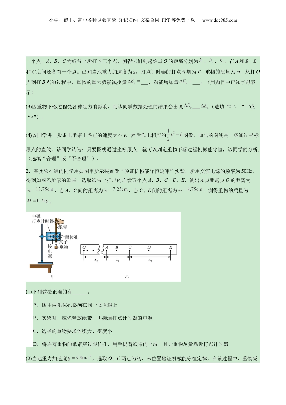 小学、初中、高中各种试卷真题知识归纳文案合同PPT等免费下载www.doc985.com第24讲实验:验证机械能守恒定律目录01模拟基础练【题型一】教材原型实验【题型二】实验的拓展创新02重难创新练【题型一】教材原型实验1.某同学利用如图1所示装置进行“验证机械能守恒定律”的实验:(1)关于这一实验,下列说法正确的是______;A.实验使用电磁打点计时器,应接220V交流电B.选择质量大体积小的物体作为重物C.还必须配备的器材有秒表和刻度尺D.本实验不需要测重物的质量(2)实验中,该同学先接通电源,再释放重物,得到一条图2所示的纸带,其中O点为打点计时器打下的第小学、初中、高中各种试卷真题知识归纳文案合同PPT等免费下载www.doc985.com一个点,A、B、C为纸带上所打的三个点,测得它们到起始点O的距离分别为、、,在A和B、B和C之间还各有一个点。已知当地重力加速度为g,打点计时器的打点周期为T,重物的质量为m,从打O点到打B点的过程中,重物的重力势能减少量,动能增加量;(用题目中已知字母表示)(3)因重物下落过程受各种阻力的影响,则该同学数据处理的结果会出现(选填“>”、“=”或“<”);(4)该同学进一步求出纸带上各点的速度大小v,然后作出相应的图像,画出的图线是一条通过坐标原点的直线。该同学认为:只要图线通过坐标原点,就可以判定重物下落过程机械能守恒,该同学的分析(选填“合理”或“不合理”)。2.某实验小组的同学用如图甲所示装置做“验证机械能守恒定律”实验,所用交流电源的频率为50Hz,得到如图乙所示的纸带。选取纸带上打出的连续五个点A、B、C、D、E,测出A点距起点O的距离为,点A、C间的距离为,点C、E间的距离为,测得重物的质量为。(1)下列做法正确的有______。A.图中两限位孔必须在同一竖直线上B.实验时,应先释放纸带,再接通打点计时器的电源C.选择的重物要求体积大、密度小D.将连着重物的纸带穿过限位孔,用手提着纸带的上端,且让重物尽量靠近打点计时器(2)当地重力加速度,选取O、C两点为初、末位置验证机械能守恒定律,在该过程中,重物减小学、初中、高中各种试卷真题知识归纳文案合同PPT等免费下载www.doc985.com少的重力势能是J,重物增加的动能是J。(结果均保留两位有效数字)(3)另一实验小组的同学用如图丙所示装置来验证机械能守恒定律,将力传感器固定在天花板上,细线一端系着小球,另一端连在力传感器上,力传感器可以直接显示绳子张力大小。将小球拉至水平位置从静止释放,到达最低点时力传感器显示的示数为F。已知小球质量为m,当地重力加速度为g。在误差允许范围内,当F、m、g满足关系式时,即可验证小球的机械能守恒。3.如图1所示为验证机械能守恒定律的实验装置。(1)如图2,释放纸带前的瞬间,重锤和手的位置合理的是;(2)由于受阻力的影响,重锤增加的动能与减少的重力势能的大小关系为(选填“大于”、“小于”或“等于”)(3)如图是某次实验中打出的一条纸带,O点是打下的第一个点,打点计时器打点的时间间隔为T,重力加速度为g,要验证O点到B点过程机械能是否守恒,则需要验证等式是否成立。4.在进行“验证机械能守恒定律”的实验中,甲、乙两实验小组分别采用了如图(1)和(2)所示的装置进行实验。小学、初中、高中各种试卷真题知识归纳文案合同PPT等免费下载www.doc985.com(1)甲组同学采用了图(1)所示的方案,除带夹子的重物、纸带、铁架台(含铁夹)、电磁打点计时器、交流电源、导线及开关外,在下列器材中,还必须使用的器材是______。(填正确答案前的字母标号)A.秒表B.刻度尺C.天平(含砝码)(2)甲组同学释放纸带前的瞬间,重锤和手的位置合理的是(填“甲”、“乙”、“丙”或“丁”);(3)乙组同学采用图(2)所示的方案完成实验,选出一条纸带如下图所示,其中O点为起始点,A、B、C三个连续计时点到O点的距离分别为、、,打点计时器打点周期为T,重物质量大于,重力加速度为g。打下B点时重物速度大小表达式为,若通过纸带验证OB过程系统机械能守恒,其表达式为。5.如图甲,小张同学做“验证机械能守恒定律”的实验。小学、初中、高中各种试卷真题知识归纳文案合同PPT等免费下载www.do...