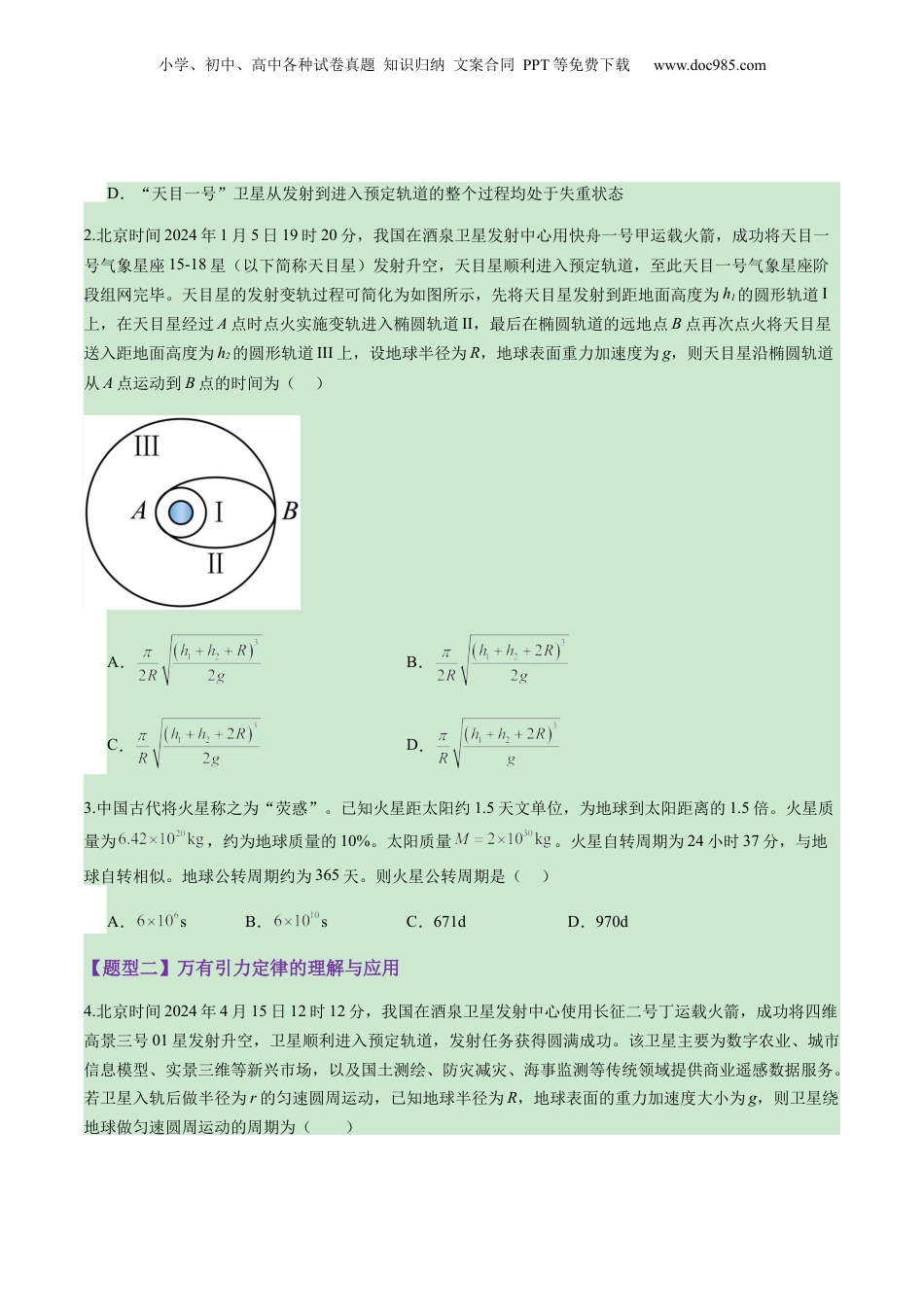 小学、初中、高中各种试卷真题知识归纳文案合同PPT等免费下载www.doc985.com第17讲万有引力定律及其应用目录01模拟基础练【题型一】行星运动定律的理解与应用【题型二】万有引力定律的理解与应用【题型三】中心天体质量密度的计算02重难创新练【题型一】行星运动定律的理解与应用1.2024年1月5日,我国“快舟一号”运载火箭在酒泉卫星发射中心点火升空,以“一箭四星”方式。将“天目一号”掩星探测星座星送入预定轨道(轨道近似为圆轨道,高度在之间)。我国的第一颗卫星“东方红一号”于1970年4月24日在酒泉卫星发射中心由长征一号运载火箭送入工作轨道(近地点距地球表面的距离441km、远地点距地球表面的距离2368km)。已知地球的半径为6400km,下列说法正确的是()A.“东方红一号”卫星运动的周期小于“天目一号”卫星运动的周期B.“东方红一号”卫星的加速度大小可能等于“天目一号”卫星的加速度大小C.“东方红一号”卫星的运行速度可能大于7.9km/s小学、初中、高中各种试卷真题知识归纳文案合同PPT等免费下载www.doc985.comD.“天目一号”卫星从发射到进入预定轨道的整个过程均处于失重状态2.北京时间2024年1月5日19时20分,我国在酒泉卫星发射中心用快舟一号甲运载火箭,成功将天目一号气象星座15-18星(以下简称天目星)发射升空,天目星顺利进入预定轨道,至此天目一号气象星座阶段组网完毕。天目星的发射变轨过程可简化为如图所示,先将天目星发射到距地面高度为h1的圆形轨道I上,在天目星经过A点时点火实施变轨进入椭圆轨道II,最后在椭圆轨道的远地点B点再次点火将天目星送入距地面高度为h2的圆形轨道III上,设地球半径为R,地球表面重力加速度为g,则天目星沿椭圆轨道从A点运动到B点的时间为()A.B.C.D.3.中国古代将火星称之为“荧惑”。已知火星距太阳约1.5天文单位,为地球到太阳距离的1.5倍。火星质量为,约为地球质量的10%。太阳质量。火星自转周期为24小时37分,与地球自转相似。地球公转周期约为365天。则火星公转周期是()A.sB.sC.671dD.970d【题型二】万有引力定律的理解与应用4.北京时间2024年4月15日12时12分,我国在酒泉卫星发射中心使用长征二号丁运载火箭,成功将四维高景三号01星发射升空,卫星顺利进入预定轨道,发射任务获得圆满成功。该卫星主要为数字农业、城市信息模型、实景三维等新兴市场,以及国土测绘、防灾减灾、海事监测等传统领域提供商业遥感数据服务。若卫星入轨后做半径为r的匀速圆周运动,已知地球半径为R,地球表面的重力加速度大小为g,则卫星绕地球做匀速圆周运动的周期为()小学、初中、高中各种试卷真题知识归纳文案合同PPT等免费下载www.doc985.comA.B.C.D.5.在地球表面,被轻质细线悬挂而处于静止状态的质量为m的小球,所受地球的万有引力作用效果分解示意图如图所示,已知小球所处的纬度为θ(),重力为F1,万有引力为F,地球的半径为R,自转周期为T,下列说法正确的是()A.细线的拉力FT与F是一对平衡力B.地球的第一宇宙速度为C.小球所需的向心力为D.地球赤道处的重力加速度为6.中国计划在2030年前登上月球,假设宇宙飞船落到月面前绕月球表面附近做角速度为ω的匀速圆周运动。宇航员登上月球后,做了一次斜上抛运动的实验,如图所示,在月面上,小球从A点斜向上抛出,经过最高点B运动到C点,已知小球在A、C两点的速度与水平方向的夹角分别为37°、53°,小球在B点的速度大小为v,小球从A点到C点的运动时间为t,引力常量为G,sin37°=0.6,cos37°=0.8,月球可视为均匀球体,忽略月球的自转,下列说法正确的是()小学、初中、高中各种试卷真题知识归纳文案合同PPT等免费下载www.doc985.comA.月球的密度为B.月球表面的重力加速度大小为C.月球的第一宇宙速度大小为D.月球的半径为7.(多选)如图所示,探测卫星a在某星球的赤道平面内绕该星球转动,其轨道可视为圆,绕行方向与该星球自转方向相反,卫星通过发射激光与星球赤道上一固定的观测站P通信,已知该星球半径为R、自转周期为T,卫星轨道半径为2R、周期为2T。下列说法正确的是()A.该星球的第一宇宙速度为B.该星球的“同步”卫星轨道半...