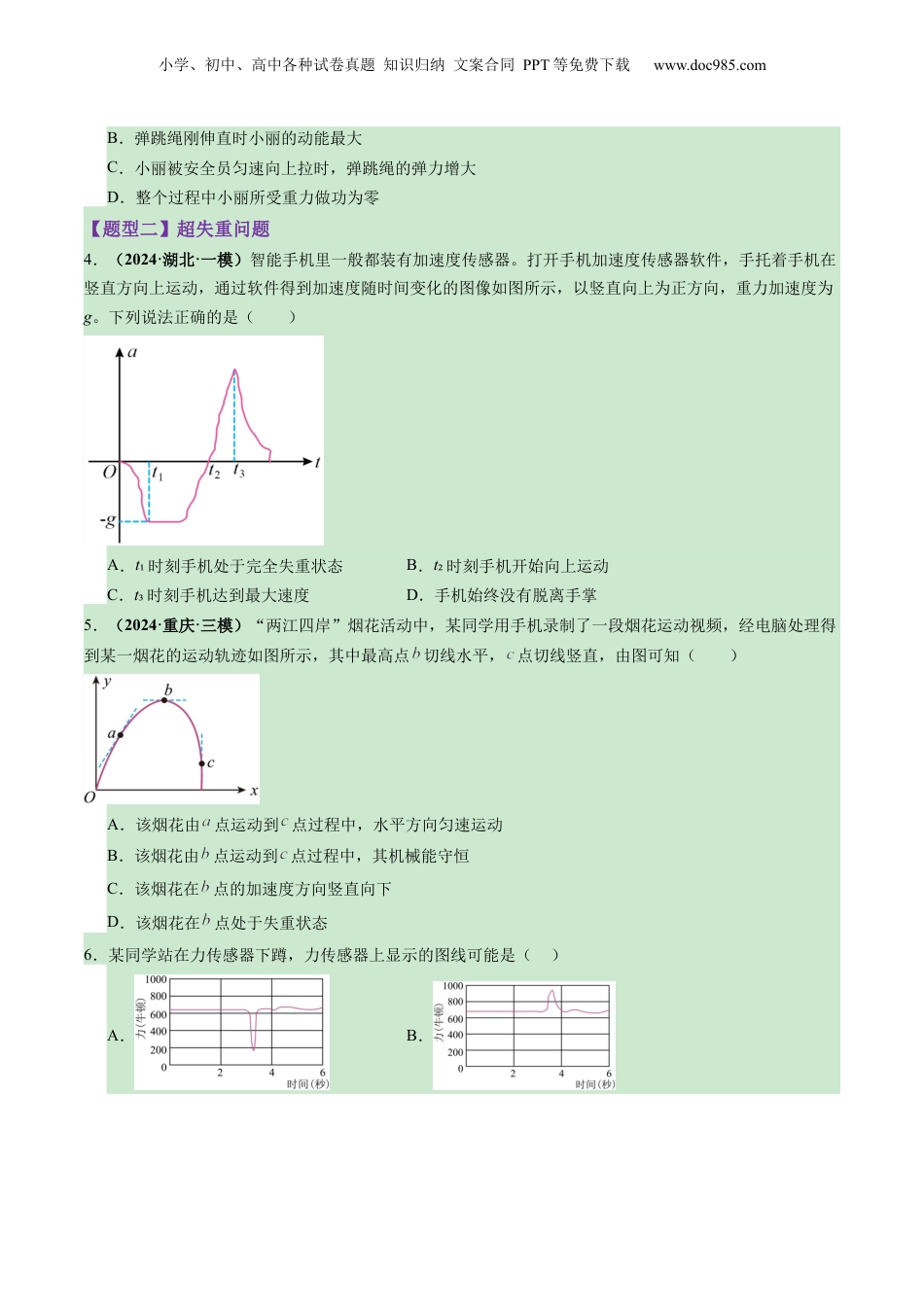 小学、初中、高中各种试卷真题知识归纳文案合同PPT等免费下载www.doc985.com第09讲牛顿运动定律的理解及基本应用目录01模拟基础练【题型一】牛顿运动定律的理解【题型二】超失重问题【题型三】动力学图像问题【题型四】动力学基本问题02重难创新练【题型一】牛顿运动定律的理解1.人在处于一定运动状态的车厢内竖直向上跳起,下列分析人的运动情况的选项中正确的是()A.只有当车厢处于静止状态,人才会落回跳起点B.若车厢沿直线水平匀速前进,人将落在跳起点的后方C.若车厢沿直线水平加速前进,人将落在跳起点的后方D.若车厢沿直线水平减速前进,人将落在跳起点的后方2.(2024·甘肃兰州·一模)在东汉王充所著的《论衡•状留篇》中提到“是故湍濑之流,沙石转而大石不移。何者?大石重而沙石轻也。”从物理学的角度对文中所描述现象的解释,下列说法正确的是()A.水冲沙石,沙石才能运动,因为力是产生运动的原因B.“沙石转而大石不移”是因为物体运动状态改变的难易程度与质量有关C.只有在水的持续冲力作用下沙石才能一直运动,是因为运动需要力来维持D.“大石不移”是因为大石受到的阻力大于水的冲力3.蹦极是近些年来新兴的一项非常刺激的户外休闲活动。小丽在跳台安全员的正确操作下完成下跳,整个过程中弹跳绳(始终在弹性限度内)多次伸缩,小丽最终被安全拉上跳台。空气阻力不能忽略,下列说法正确的是()A.弹跳绳伸直前小丽的机械能不变小学、初中、高中各种试卷真题知识归纳文案合同PPT等免费下载www.doc985.comB.弹跳绳刚伸直时小丽的动能最大C.小丽被安全员匀速向上拉时,弹跳绳的弹力增大D.整个过程中小丽所受重力做功为零【题型二】超失重问题4.(2024·湖北·一模)智能手机里一般都装有加速度传感器。打开手机加速度传感器软件,手托着手机在竖直方向上运动,通过软件得到加速度随时间变化的图像如图所示,以竖直向上为正方向,重力加速度为g。下列说法正确的是()A.t₁时刻手机处于完全失重状态B.t₂时刻手机开始向上运动C.t₃时刻手机达到最大速度D.手机始终没有脱离手掌5.(2024·重庆·三模)“两江四岸”烟花活动中,某同学用手机录制了一段烟花运动视频,经电脑处理得到某一烟花的运动轨迹如图所示,其中最高点切线水平,点切线竖直,由图可知()A.该烟花由点运动到点过程中,水平方向匀速运动B.该烟花由点运动到点过程中,其机械能守恒C.该烟花在点的加速度方向竖直向下D.该烟花在点处于失重状态6.某同学站在力传感器下蹲,力传感器上显示的图线可能是()A.B.小学、初中、高中各种试卷真题知识归纳文案合同PPT等免费下载www.doc985.comC.D.【题型三】动力学图像问题7.(2024·河北·三模)某游泳运动员在时间内运动的图像如图所示。关于该运动员,下列说法正确的是()A.在内所受的合力一直不为0B.在内的位移大小为C.在内一定处于超重状态D.在内的位移大小为8.质量为1500kg的汽车在平直公路上运动,图像如图所示,由此可求()A.内汽车的平均速度为B.内汽车的加速度为C.内汽车所受的合外力为3000ND.内合外力对汽车所做的功为9.质量为m的物块静止在动摩擦因数为µ的水平地面上,0~3s内所受水平拉力与时间的关系如图甲所示,0~2s内加速度图像如图乙所示。重力加速度g=10m/s2,由图可知()小学、初中、高中各种试卷真题知识归纳文案合同PPT等免费下载www.doc985.comA.m=1kg,µ=0.2B.m=1kg,µ=0.1C.m=2kg,µ=0.2D.m=2kg,µ=0.110.如图所示,在倾角为37°的粗糙且足够长的斜面底端,一质量为可视为质点的滑块压缩一轻弹簧并锁定,滑块与弹簧不拴连。时刻解除锁定,计算机通过传感器描绘出滑块的图像,其中Ob段为曲线,bc段为直线,已知物块在0-0.2s内运动的位移为0.8m,取,则下列说法正确的是()A.滑块速度最大时,滑块与弹簧脱离B.滑块在0.2s时机械能最大C.滑块与斜面间的动摩擦因数为D.时刻弹簧的弹性势能为32J【题型四】动力学基本问题11.一质量为m的物块在大小为F的水平拉力作用下,从静止开始沿水平面运动距离x后撤掉F,又运动了3x后停下。已知接触面粗糙程度不变,重力加速度为g,求:(1...