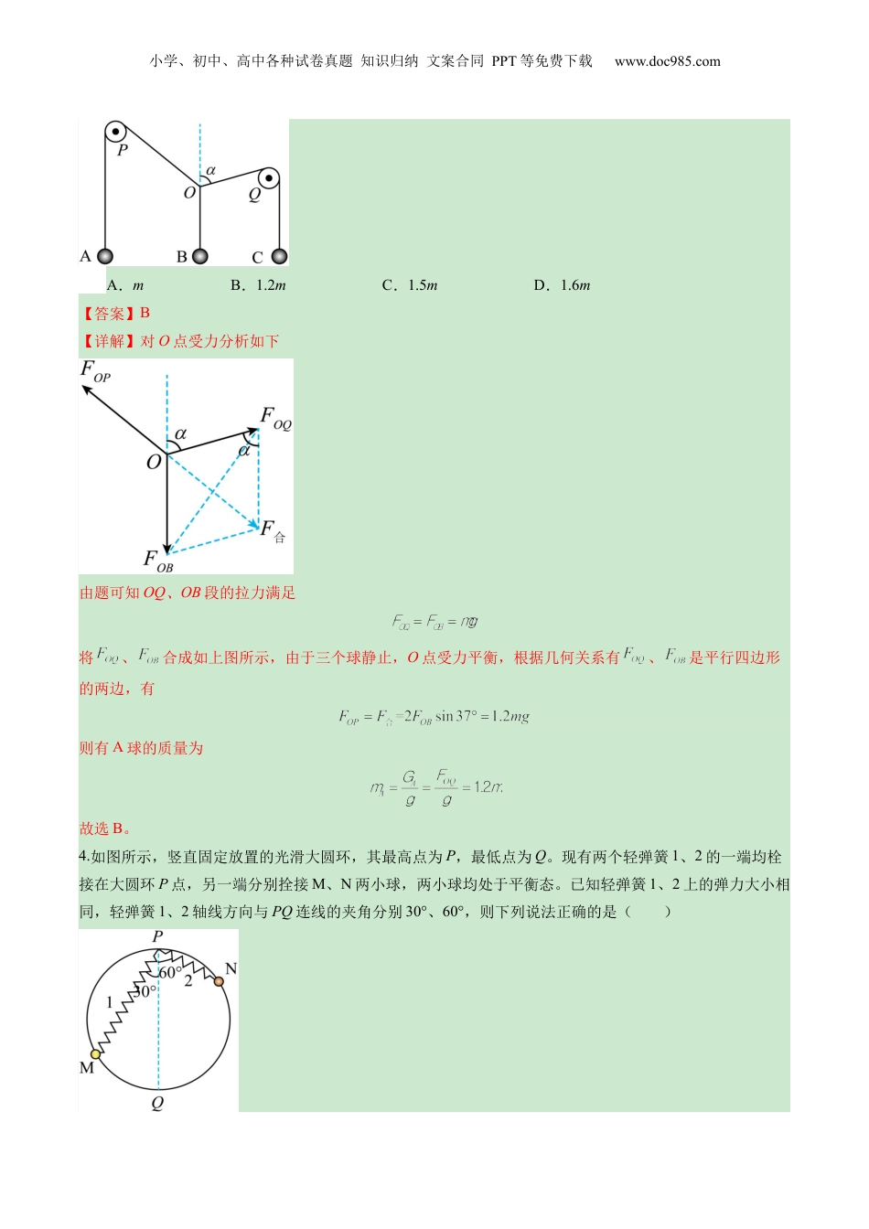 小学、初中、高中各种试卷真题知识归纳文案合同PPT等免费下载www.doc985.com第07讲共点力的平衡目录01模拟基础练【题型一】受力分析【题型二】静态平衡【题型三】动态平衡【题型四】多体平衡【题型五】临界极值02重难创新练【题型一】受力分析1.A、B两物体如图叠放,在竖直向上的力F作用下沿粗糙竖直墙面向上匀速运动,则A的受力个数为()A.2B.3C.4D.5【答案】B【详解】对AB整体受力分析,整体受力平衡,受重力和力F,如果墙壁对整体有支持力,整体水平方向不能平衡,故墙壁对整体水平方向没有弹力,也就没有摩擦力;隔离分析物体A,受重力、B对A的支持力和静摩擦力,共3个力。故选B。小学、初中、高中各种试卷真题知识归纳文案合同PPT等免费下载www.doc985.com2.高空滑索因其惊险刺激而深受年轻人追捧。人通过轻绳与轻质滑环相连,开始下滑前,轻质滑环固定在钢索上点处,滑环和人均处于静止状态,钢索和轻绳的夹角关系如图所示。设段钢索的拉力大小为,段钢索的拉力大小为,段轻绳的拉力大小为,下列判断正确的是()A.B.C.D.【答案】A【详解】以结点为研究对象,受力情况如图所示这样的三个力可以组成一个首尾相接的封闭的矢量三角形如下由图可知故选A。【题型二】静态平衡3.如图所示,P、Q是两个光滑的定滑轮,吊着A、B、C三个小球的三条轻绳各有一端在O点打结,悬吊A、C两个球的轻绳分别绕过定滑轮P、Q,三个球静止时,OQ段轻绳与竖直方向的夹角。已知B、C两球的质量均为m,,则A球的质量为()小学、初中、高中各种试卷真题知识归纳文案合同PPT等免费下载www.doc985.comA.mB.1.2mC.1.5mD.1.6m【答案】B【详解】对O点受力分析如下由题可知OQ、OB段的拉力满足将、合成如上图所示,由于三个球静止,O点受力平衡,根据几何关系有、是平行四边形的两边,有则有A球的质量为故选B。4.如图所示,竖直固定放置的光滑大圆环,其最高点为P,最低点为Q。现有两个轻弹簧1、2的一端均栓接在大圆环P点,另一端分别拴接M、N两小球,两小球均处于平衡态。已知轻弹簧1、2上的弹力大小相同,轻弹簧1、2轴线方向与PQ连线的夹角分别30°、60°,则下列说法正确的是()小学、初中、高中各种试卷真题知识归纳文案合同PPT等免费下载www.doc985.comA.轻弹簧1处于压缩状态,轻弹簧2处于伸长状态B.大圆环对两小球的弹力方向均指向圆心C.M、N两小球的质量比为D.大圆环对M、N两小球的弹力大小之比为【答案】C【详解】A.对两个小球受力分析并画力的矢量三角形,如图所示两个弹力均指向P点,故两弹簧均处于拉伸状态,故A错误;B.大圆环对两球的弹力均背离圆心,故B错误;CD.M的力矢量三角形相似于三角形OPM,故可知故C正确,D错误。故选C。5.如图所示,水平地面上放置一个质量为、倾角为的斜面体。一个质量为的箱子在平行于斜面的拉力F作用下,沿斜面体匀速上滑,斜面体保持静止。已知箱子与斜面间的动摩擦因数为0.25,重力加速度g取,,。下列说法正确的是()A.箱子对斜面体压力的大小为B.拉力F的大小为小学、初中、高中各种试卷真题知识归纳文案合同PPT等免费下载www.doc985.comC.斜面体对地面压力的大小为D.地面给斜面体的摩擦力大小为【答案】D【详解】A.对箱子进行受力分析,根据正交分解可知,斜面对体箱子的支持力为根据牛顿第三定律可知故A错误;B.由于箱子处于匀速直线运动状态,即故B错误;C.对斜面体与箱子整体受力分析可知由牛顿第三定律可得,斜面体对地面压力的大小为故C错误;D.对斜面体与箱子整体受力分析可知故D正确;故选D。【题型三】动态平衡6.如图所示,斜面体放在水平面上,A球套在粗细均匀的水平杆上,B球放在光滑斜面上,A、B两球用轻质细线连接。现用水平向左的推力F向左推斜面体,使斜面体缓慢向左移动,A始终保持静止。在斜面体向左移动直至细线与斜面平行过程中,关于线对A球的作用力F1与斜面对B球的作用力F2的大小变化,下列说法正确的是()A.F1不断减小,F2不断减小B.F1不断减小,F2不断增大C.F1不断增大,F2不断减小D.F1不断增大,F2不断增大【答案】B【详解】设B的重力为GB,绳子对B的拉力为T,以B为研究对象可得最终T与F2垂直小学、初...