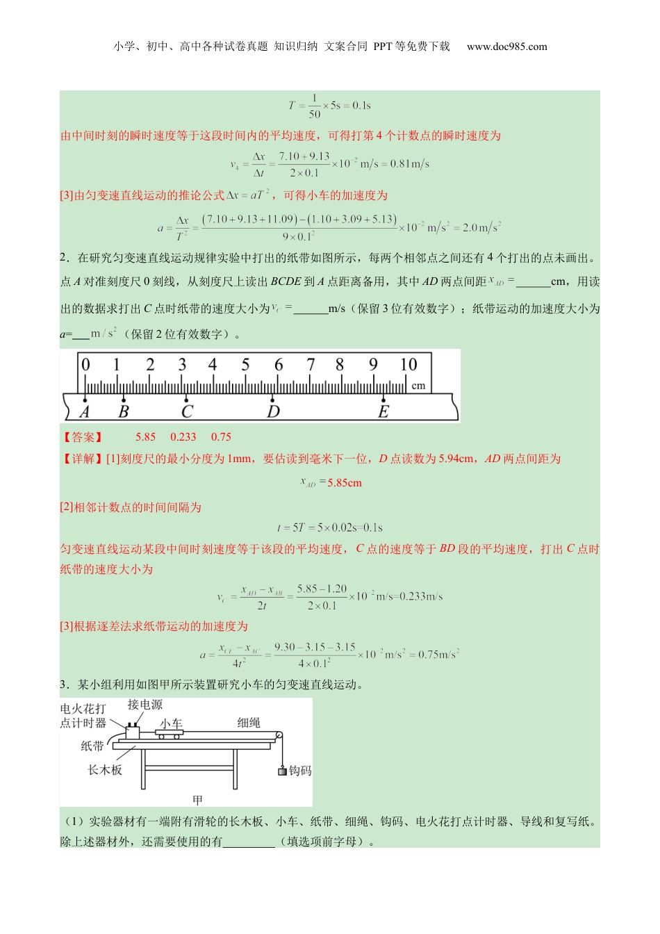 小学、初中、高中各种试卷真题知识归纳文案合同PPT等免费下载www.doc985.com第04讲实验:探究小车速度随时间变化的规律目录01模拟基础练【题型一】实验原理的理解与有效数字、逐差法的应用【题型二】其他方法求加速度【题型三】数据的处理【题型四】重力加速度的测量02重难创新练【题型一】实验原理的理解与有效数字、逐差法的应用1.在“探究小车速度随时间变化规律”实验中:(1)某同学采用如图甲所示的装置进行试验,平衡摩擦力。(选填“需要”或“不需要”)(2)甲同学在实验中得到如图所示的一条纸带(两计数点间还有四个点没有画出),已知打点计时器采用的是频率为50Hz的交流电,根据纸带可求出第4个计数点的瞬时速度为m/s,小车的加速度为(结果保留两位有效数字)。【答案】不需要0.812.0【详解】(1)[1]该实验是探究小车速度随时间变化规律,因此只需要使小车做匀变速直线运动即可,所以不需要平衡摩擦力。(2)[2]已知打点计时器采用的是频率为50Hz的交流电,纸带上两计数点间还有四个点没有画出,因此可知,纸带上相邻两计数点间的时间间隔为小学、初中、高中各种试卷真题知识归纳文案合同PPT等免费下载www.doc985.com由中间时刻的瞬时速度等于这段时间内的平均速度,可得打第4个计数点的瞬时速度为[3]由匀变速直线运动的推论公式,可得小车的加速度为2.在研究匀变速直线运动规律实验中打出的纸带如图所示,每两个相邻点之间还有4个打出的点未画出。点A对准刻度尺0刻线,从刻度尺上读出BCDE到A点距离备用,其中AD两点间距cm,用读出的数据求打出C点时纸带的速度大小为m/s(保留3位有效数字);纸带运动的加速度大小为a=(保留2位有效数字)。【答案】5.850.2330.75【详解】[1]刻度尺的最小分度为1mm,要估读到毫米下一位,D点读数为5.94cm,AD两点间距为5.85cm[2]相邻计数点的时间间隔为匀变速直线运动某段中间时刻速度等于该段的平均速度,C点的速度等于BD段的平均速度,打出C点时纸带的速度大小为[3]根据逐差法求纸带运动的加速度为3.某小组利用如图甲所示装置研究小车的匀变速直线运动。(1)实验器材有一端附有滑轮的长木板、小车、纸带、细绳、钩码、电火花打点计时器、导线和复写纸。除上述器材外,还需要使用的有(填选项前字母)。小学、初中、高中各种试卷真题知识归纳文案合同PPT等免费下载www.doc985.comA.交流电源B.交流电源C.秒表D.刻度尺(2)小组通过实验得到了如图乙所示的一条纸带(每两个相邻计数点间还有4个点没有画出来),相邻两个计数点间的距离已在图中标出。①根据连续相等的时间间隔内的基本相等,可认为小车做匀变速直线运动。②已知交流电源的频率为,则在打下C点时小车的速度大小为(保留三位有效数字),小车运动的加速度大小为(保留两位有效数字)。【答案】BD位移差0.8441.7【命题意图】本题以小车的匀变速运动为载体,考查学生的实验能力。【详解】解:(1)[1]AB.电火花打点计时器所接电源应为交流电源,A错误,B正确;C.由打点计时器计算时间,所以需要秒表,C错误;D.为测量点迹之间的距离,必须使用刻度尺,D项正确。故选BD。(2)①[2]设AB、BC、CD、DE、EF之间的距离分别为和,可有因此可知,在相邻相等的时间间隔内的位移差基本相等,可判断小车做匀变速直线运动。②[3]由中间时刻的瞬时速度等于平均速度可得[4]由公式可得【题型二】其他方法求加速度4.利用图甲装置可以测量滑块的加速度。气垫导轨上相隔一定距离的两处装有两个光电传感器1、2,滑块上固定一遮光条,滑块与遮光条的总质量为M,若光线被遮光条遮挡,光电传感器会输出高电压,两光电传感器采集数据后与计算机相连。滑块在细线的牵引下向左加速运动,遮光条经过光电传感器1、2时,通过计算机可以得到如图乙所示的电压U随时间t变化的图像。小学、初中、高中各种试卷真题知识归纳文案合同PPT等免费下载www.doc985.com(1)实验前,接通气源,将滑块(不挂钩码)置于气垫导轨上,轻推滑块,计算机屏幕上显示的电压U随时间t变化的图像如图乙所示,则要将气垫导轨右侧(调低或调高)。(2)用游标卡尺测遮光条宽度d,测量结果如图丙所示,则d=mm;(3)...